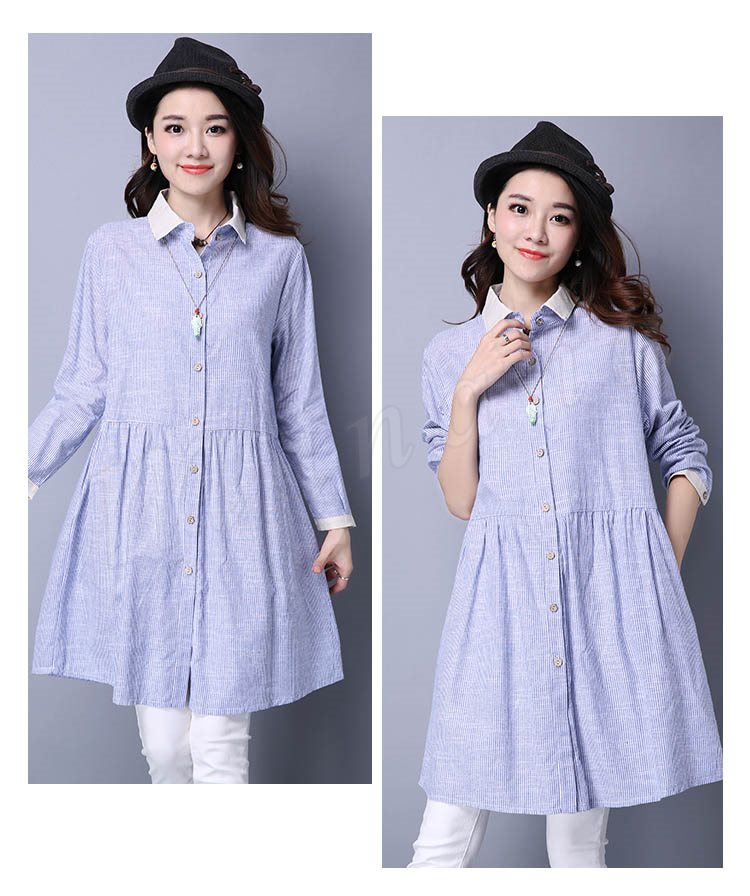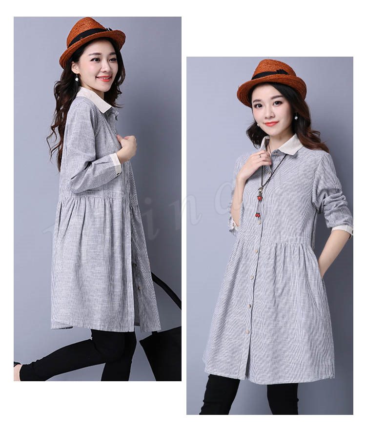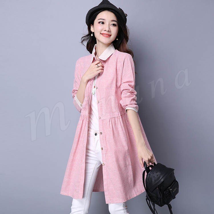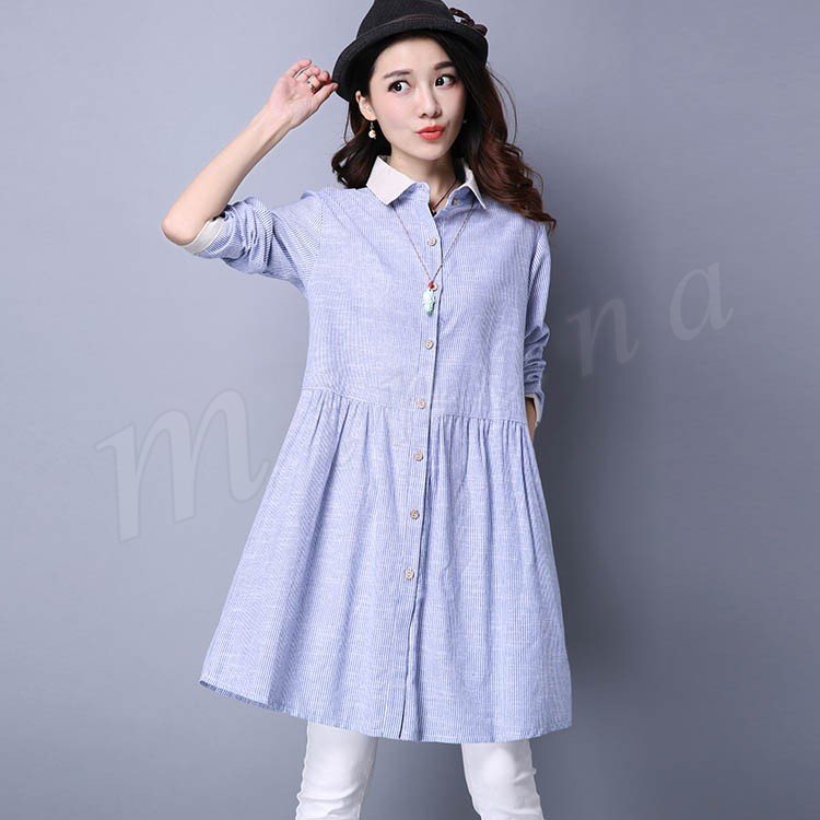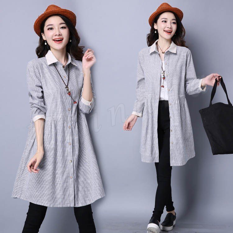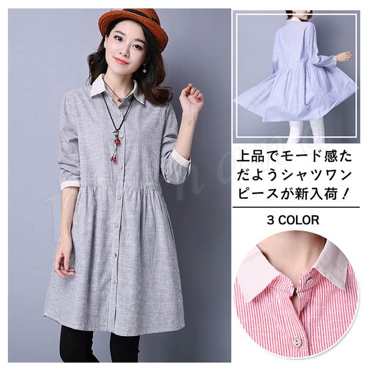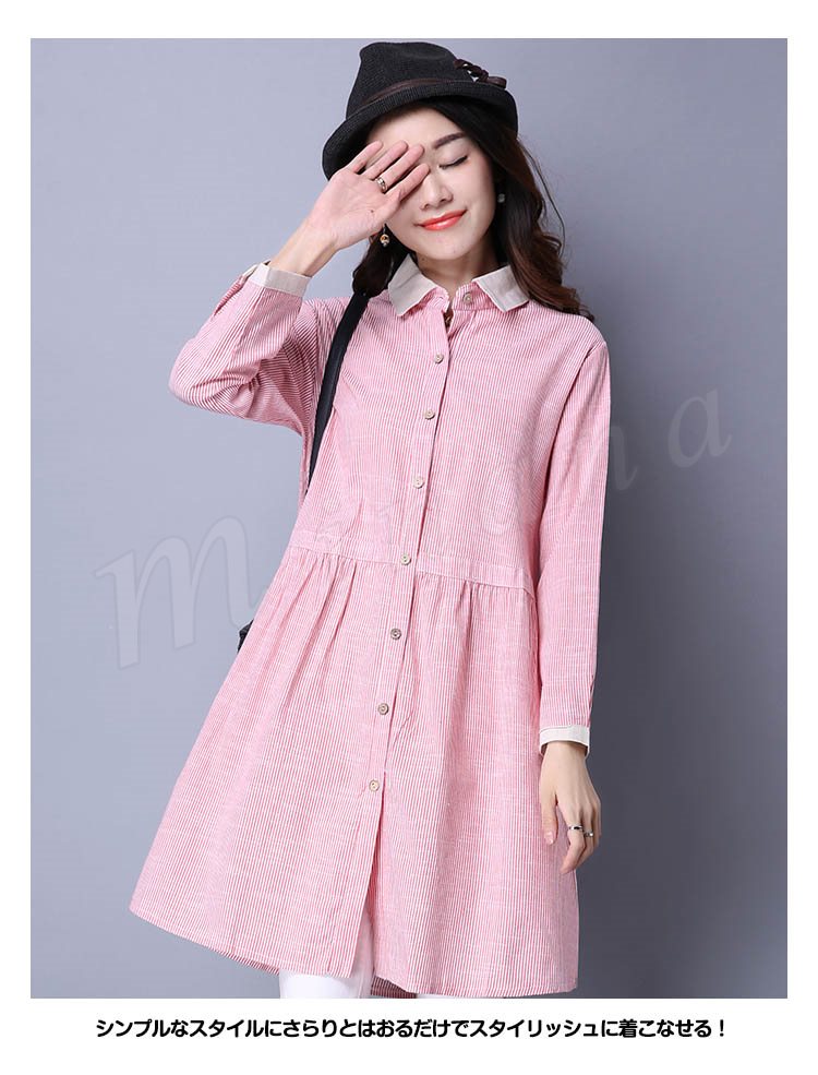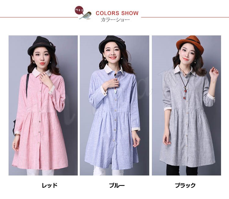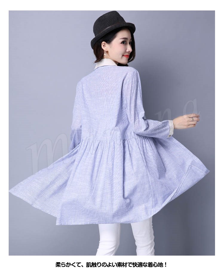 長袖シャツ ロングシャツ シャツワンピ 体型カバー ストライプ柄 レディース とろみシャツ スキッパーシャツ 2018春新作