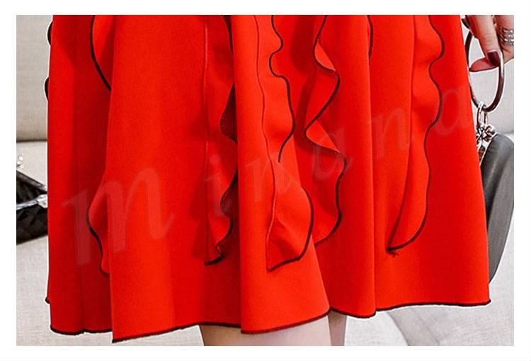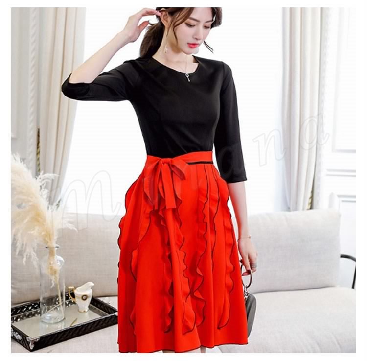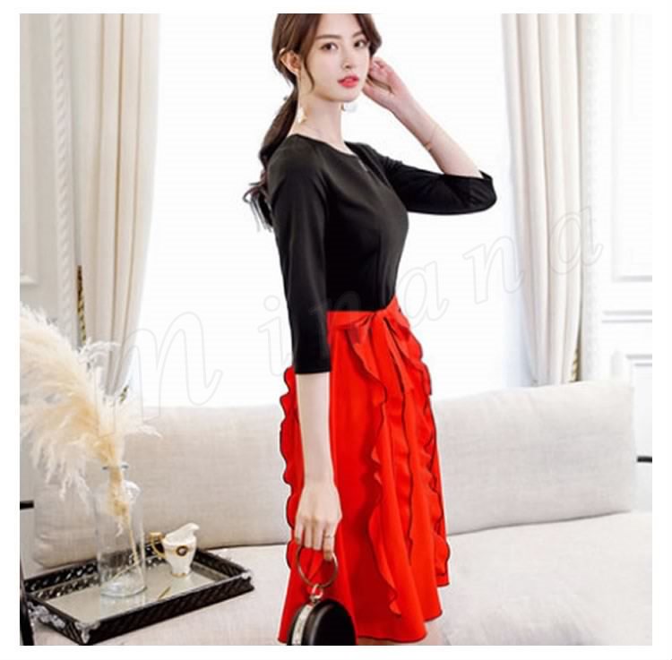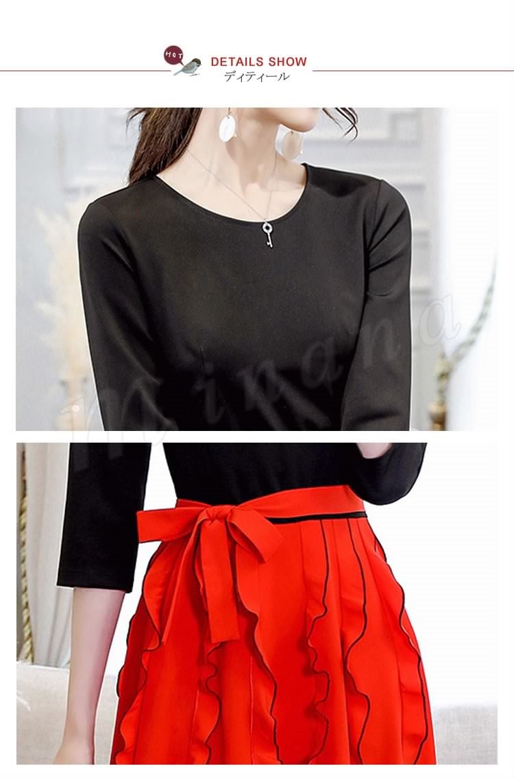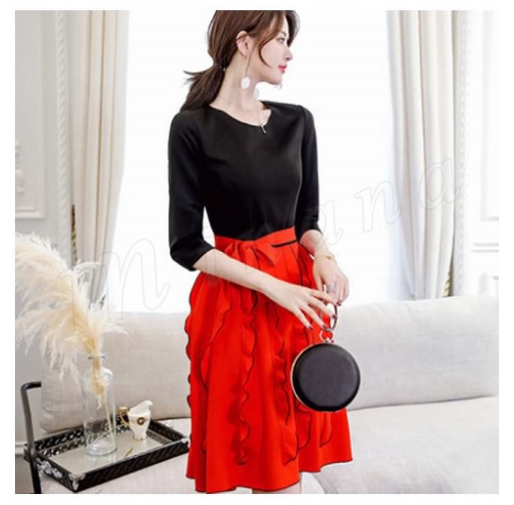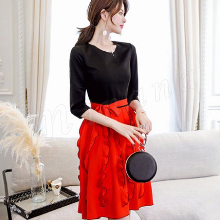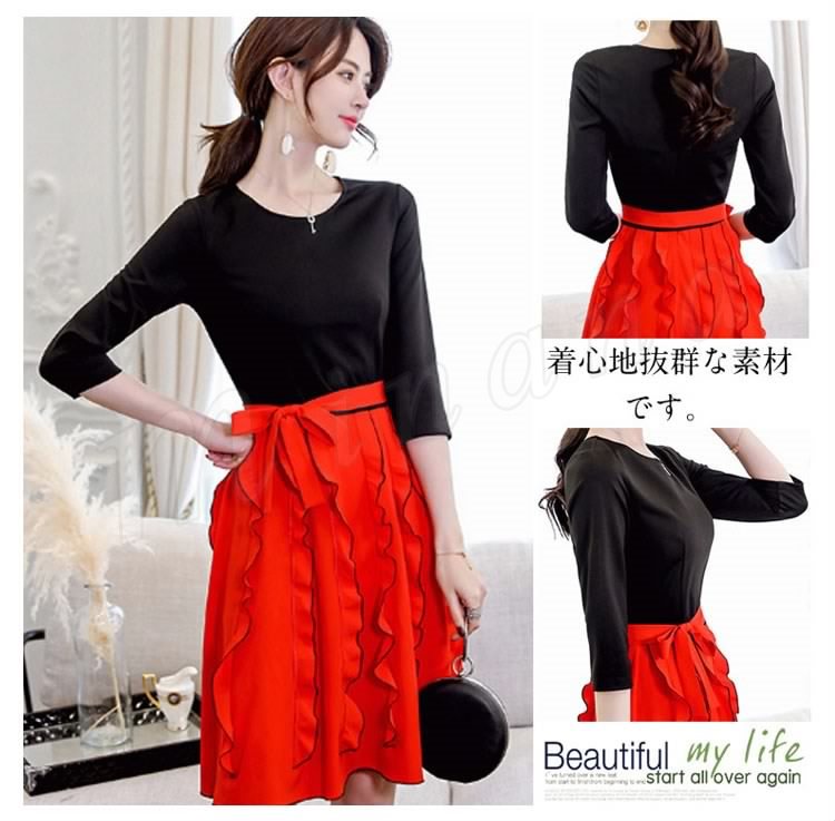 ワンピース Aライン フレアー長袖 ドッキングレース レディース春 赤