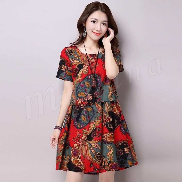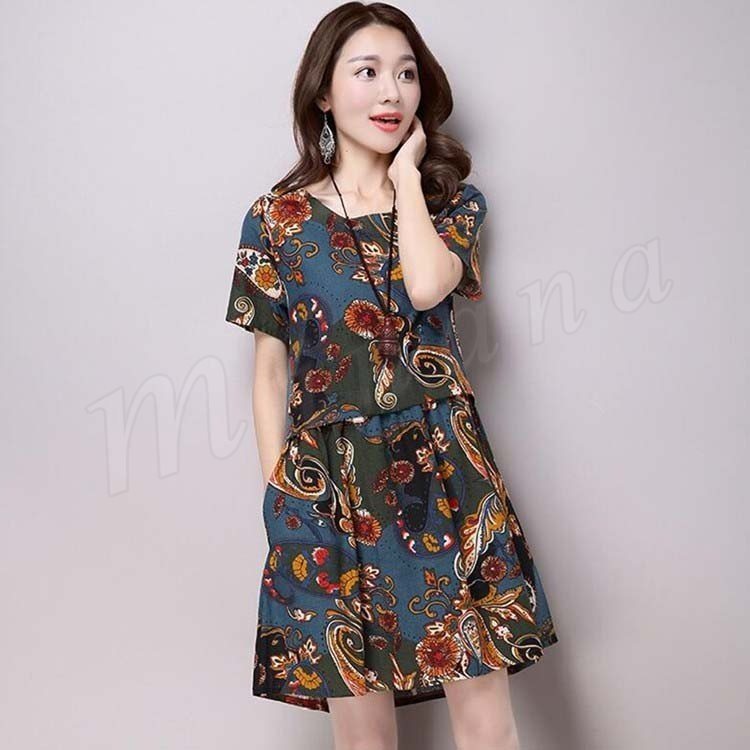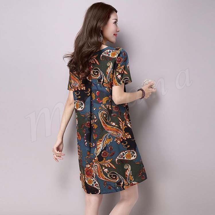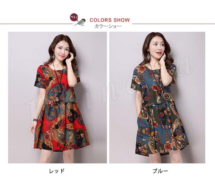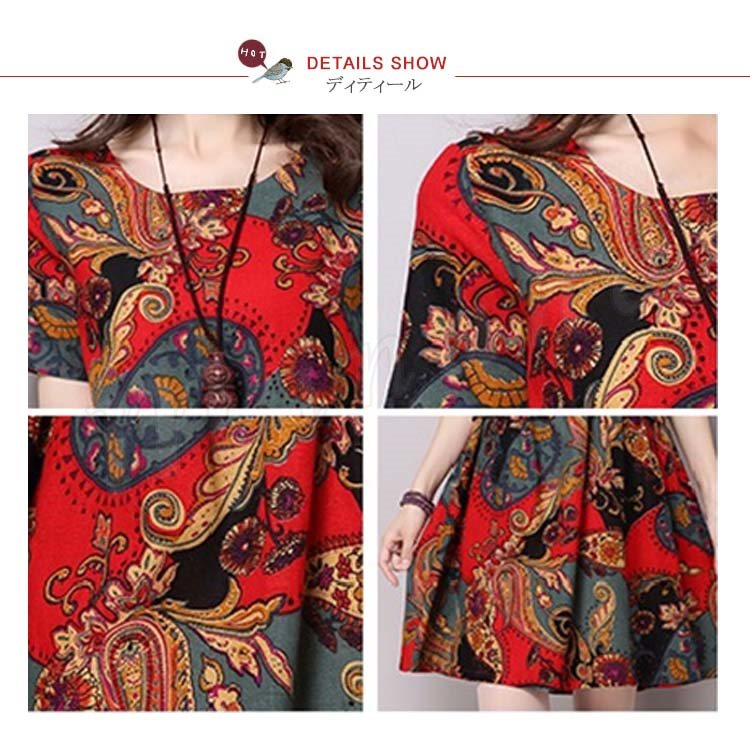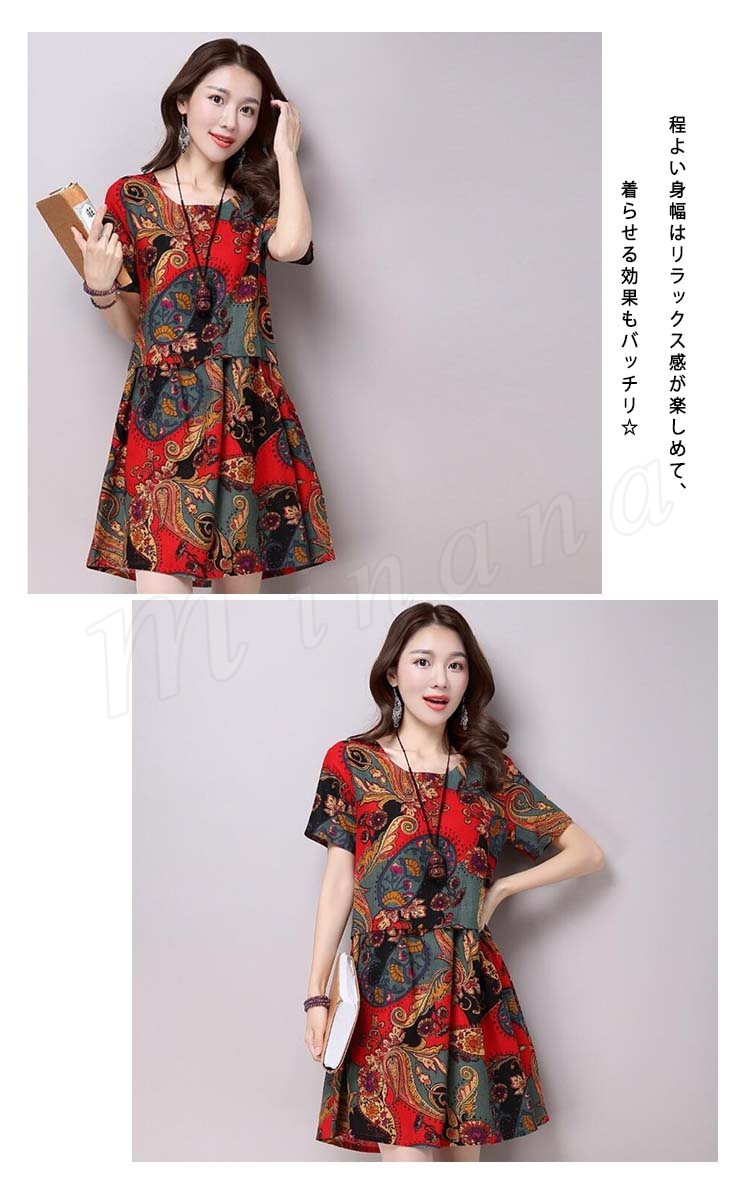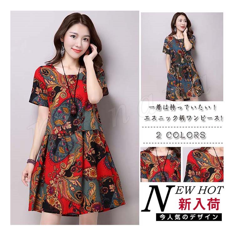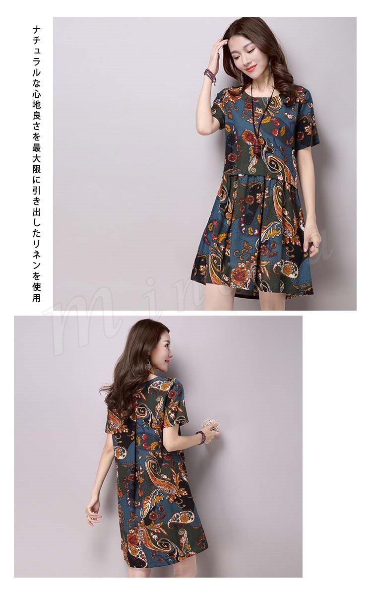 エスニックワンピース 半袖ワンピース リネンワンピース レディース 総柄 カジュアル ゆったり Aライン 体型カバー 新作