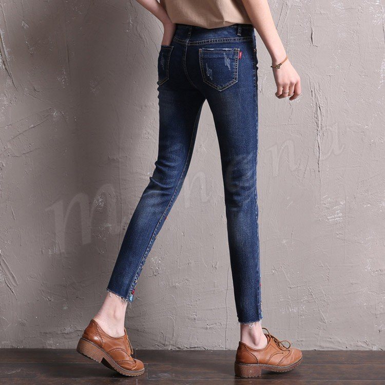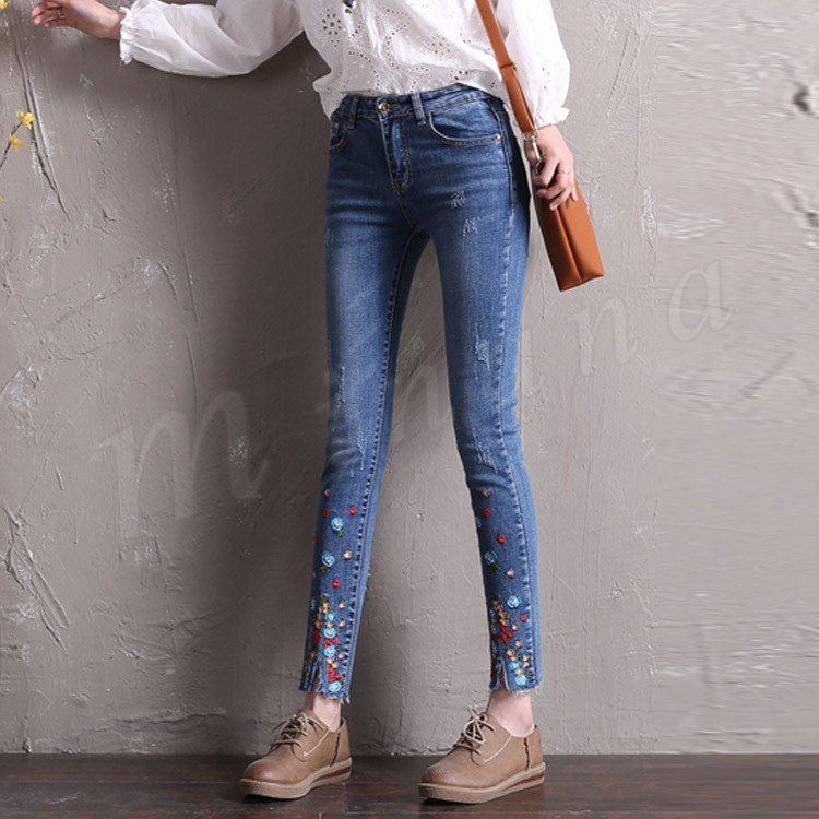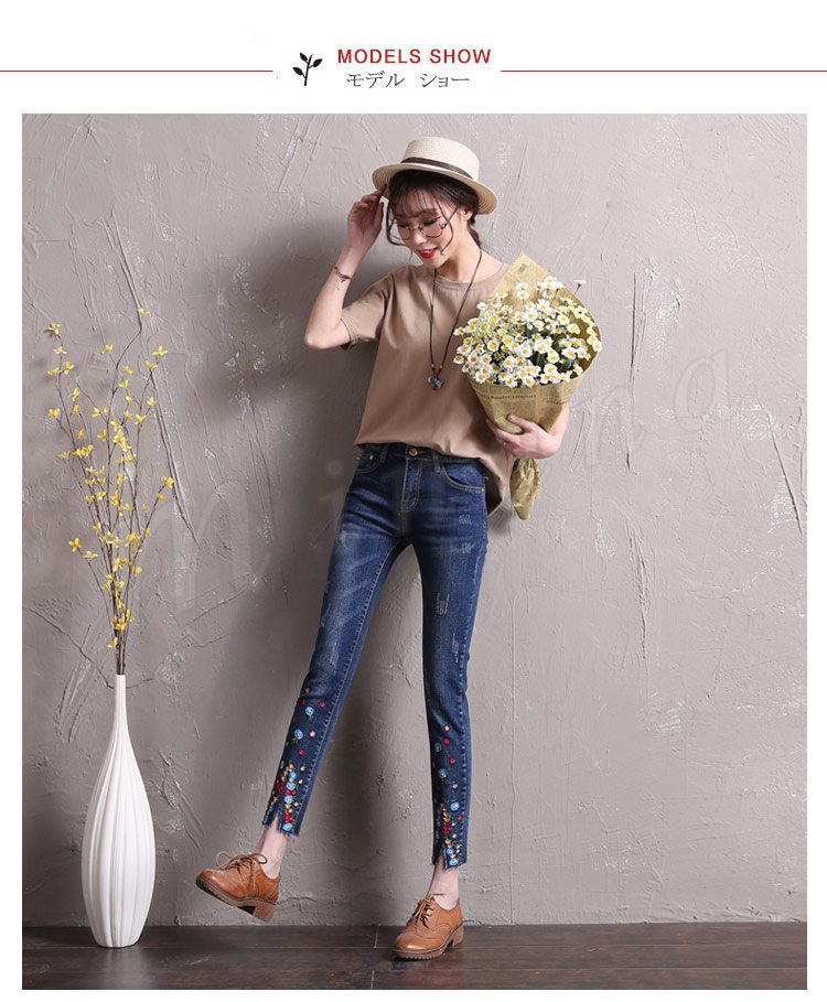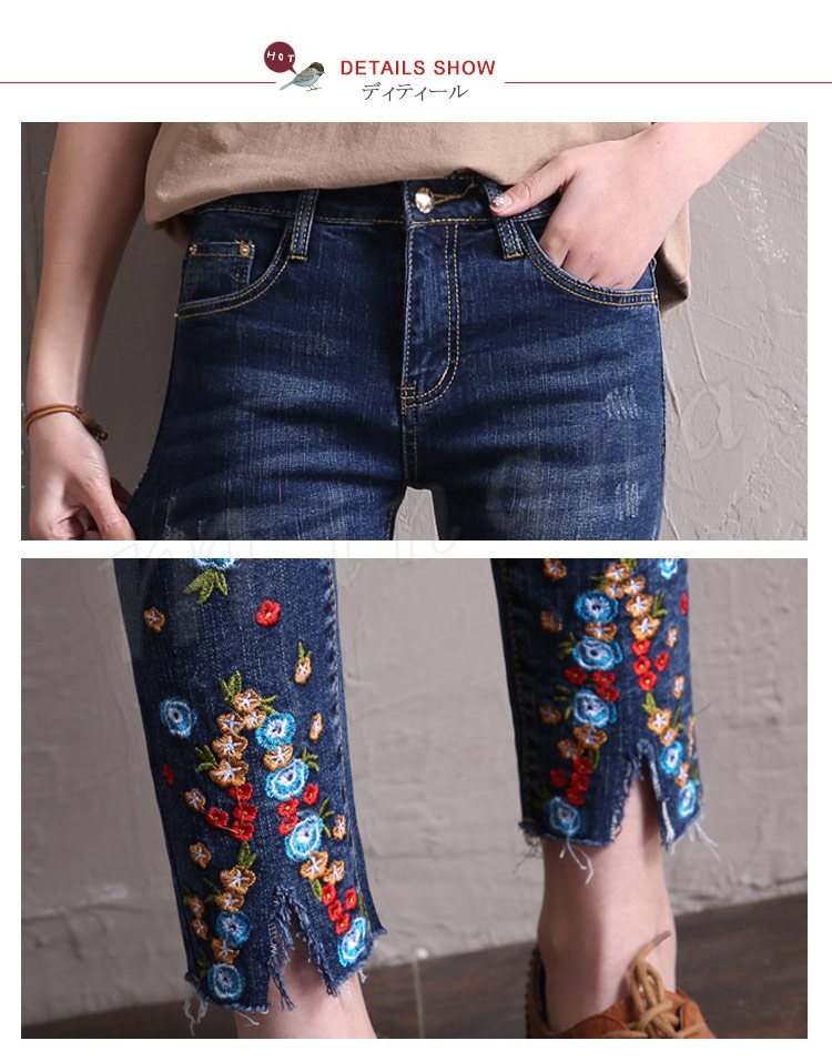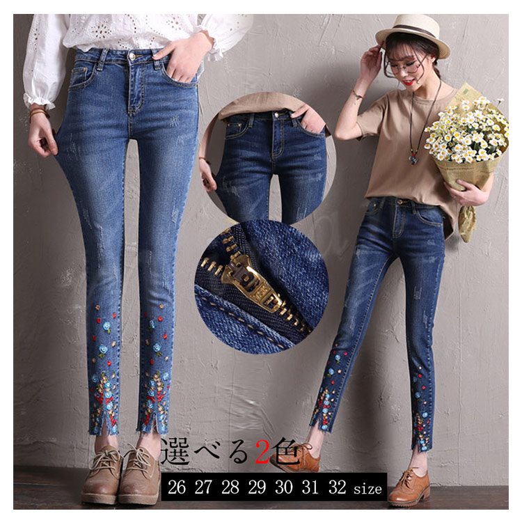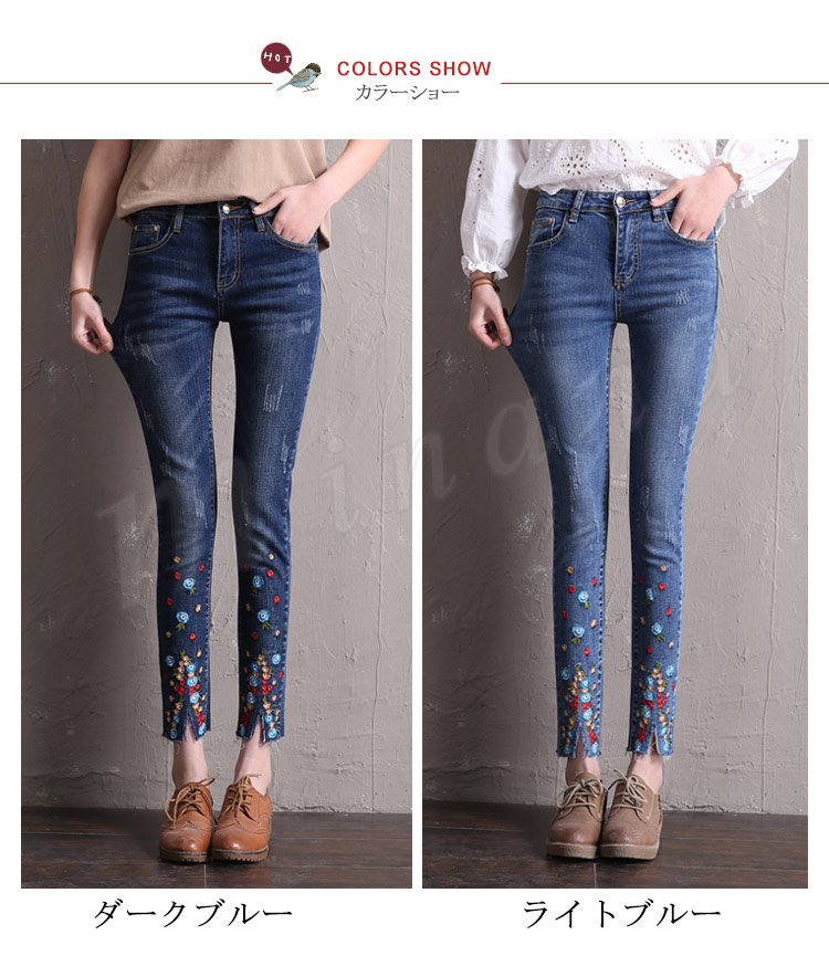 2018春新作/デニムパンツ/スキニーパンツ/レディース/九分丈/花柄/刺繍/ジーンズ/タイト/大きいサイズ/スリット/ファッション/おしゃれ/ズ