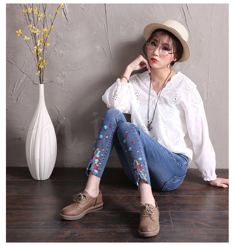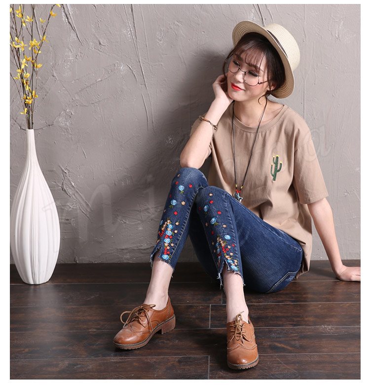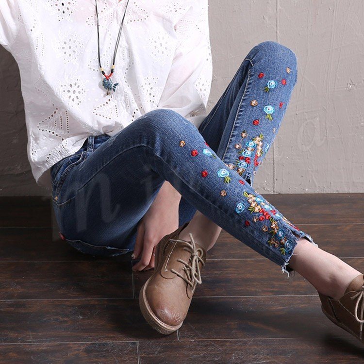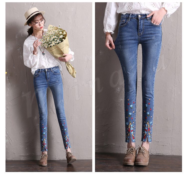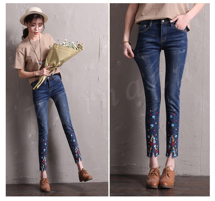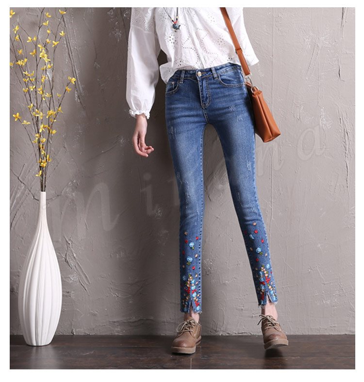 2018春新作/デニムパンツ/スキニーパンツ/レディース/九分丈/花柄/刺繍/ジーンズ/タイト/大きいサイズ/スリット/ファッション/おしゃれ/ズ