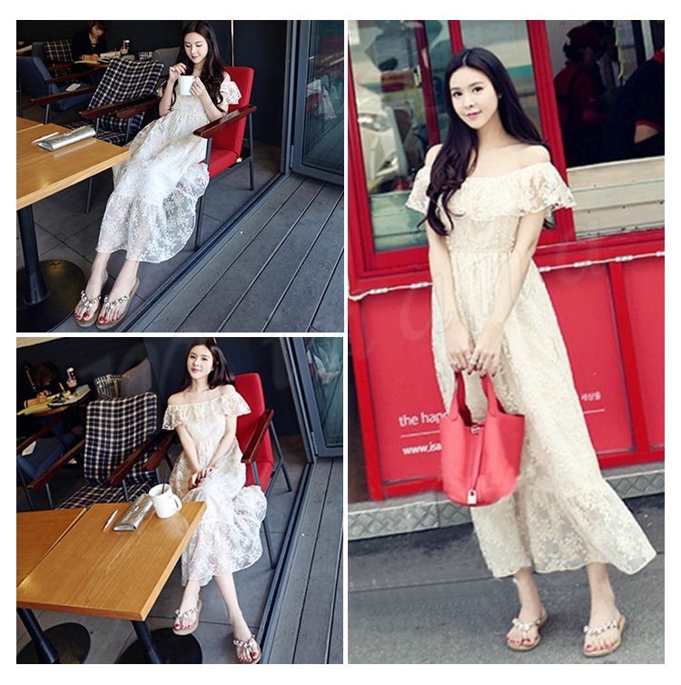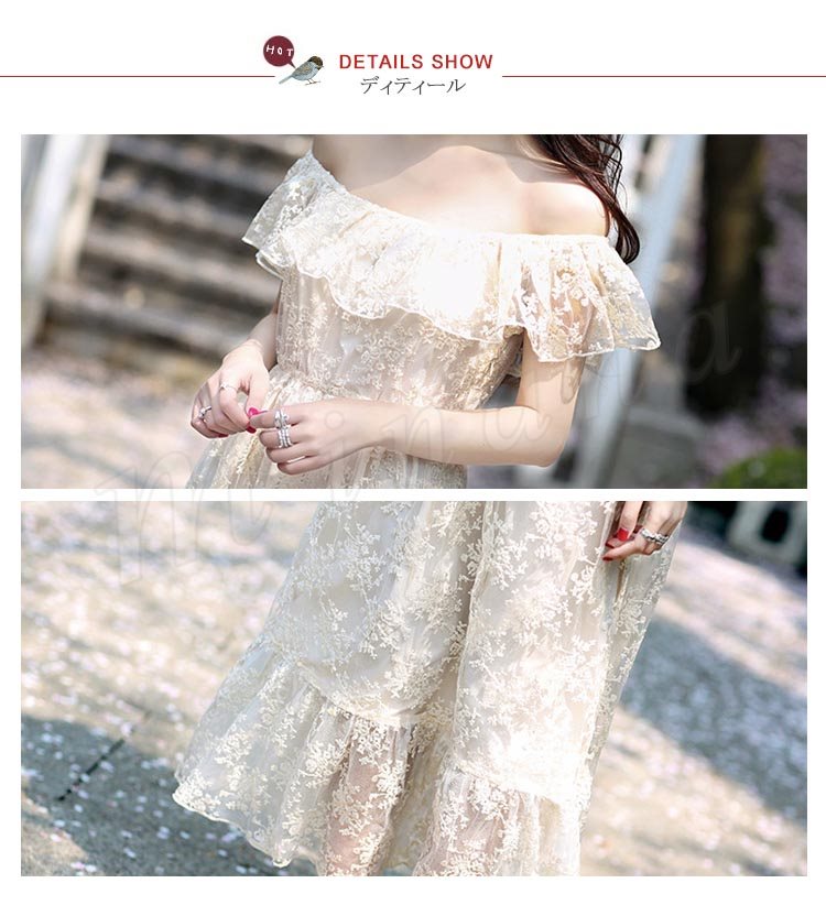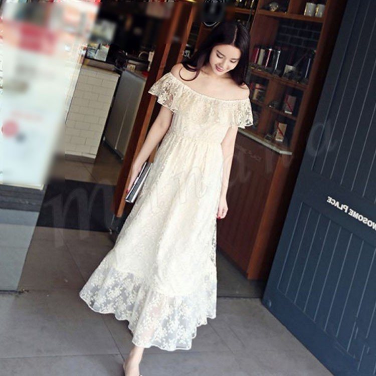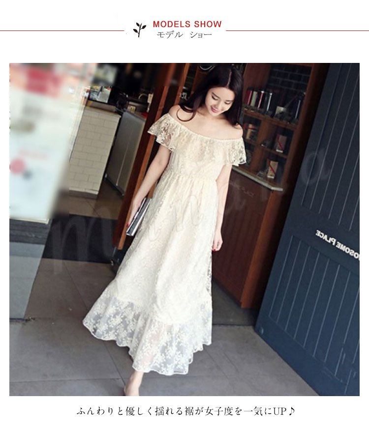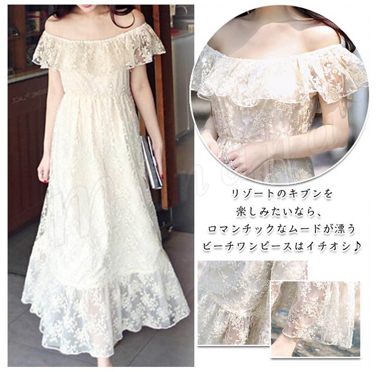 マキシワンピ 夏 リゾート ビーチ レース 胸元フレア オフショルダー 無地 aライン ロング マキシ丈ワンピース パーティードレスとしてもo