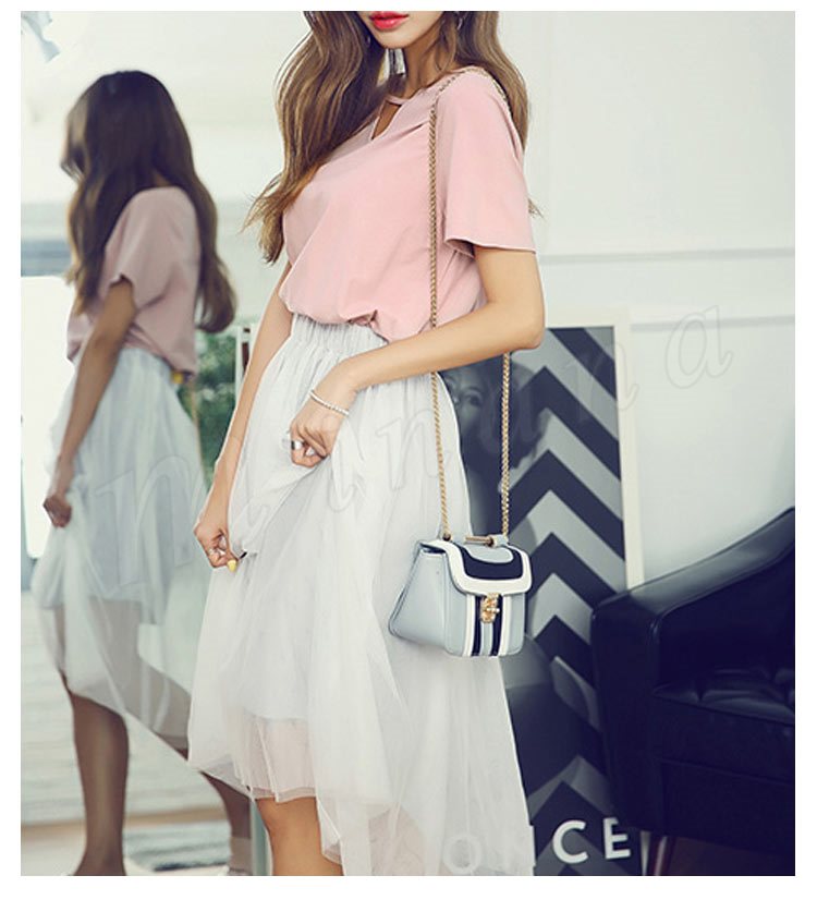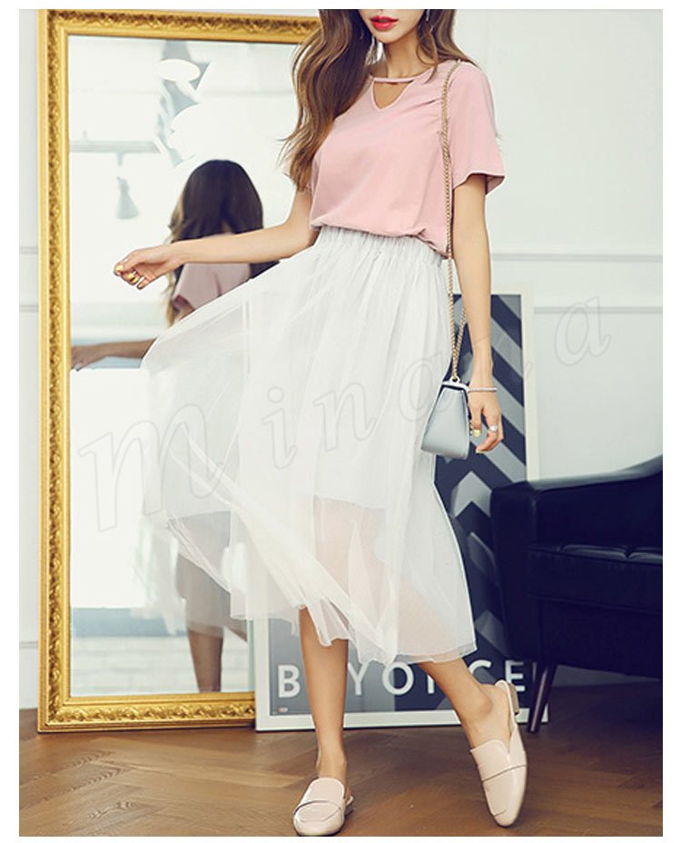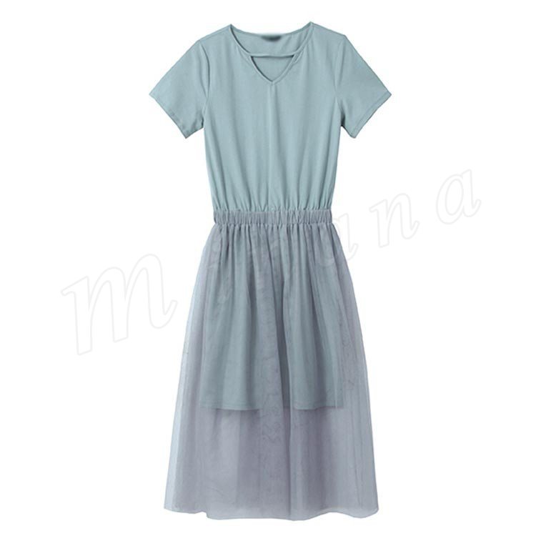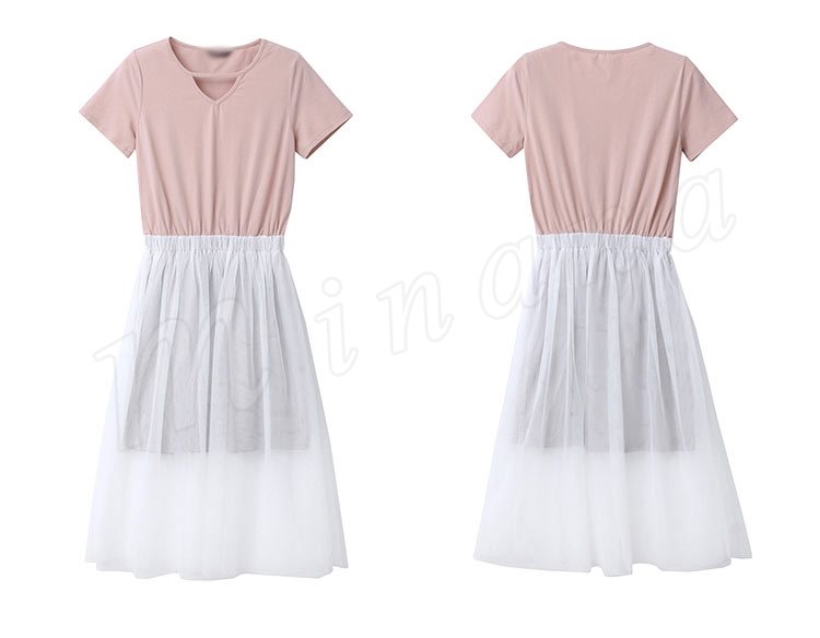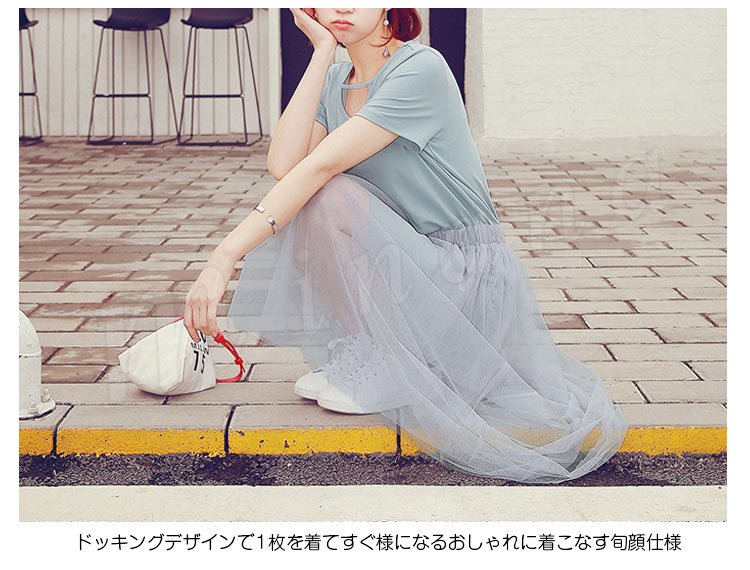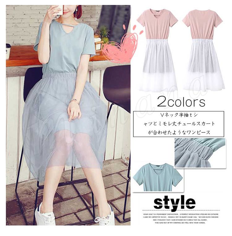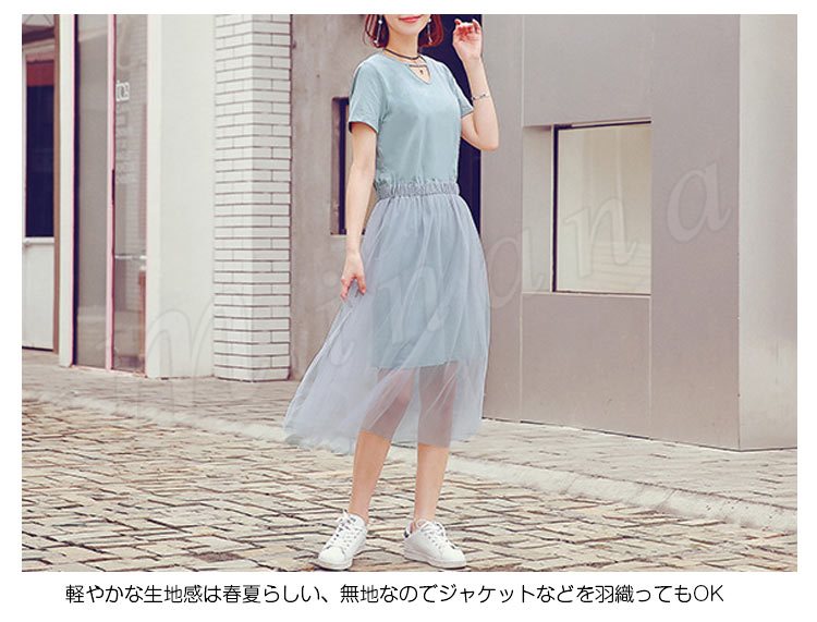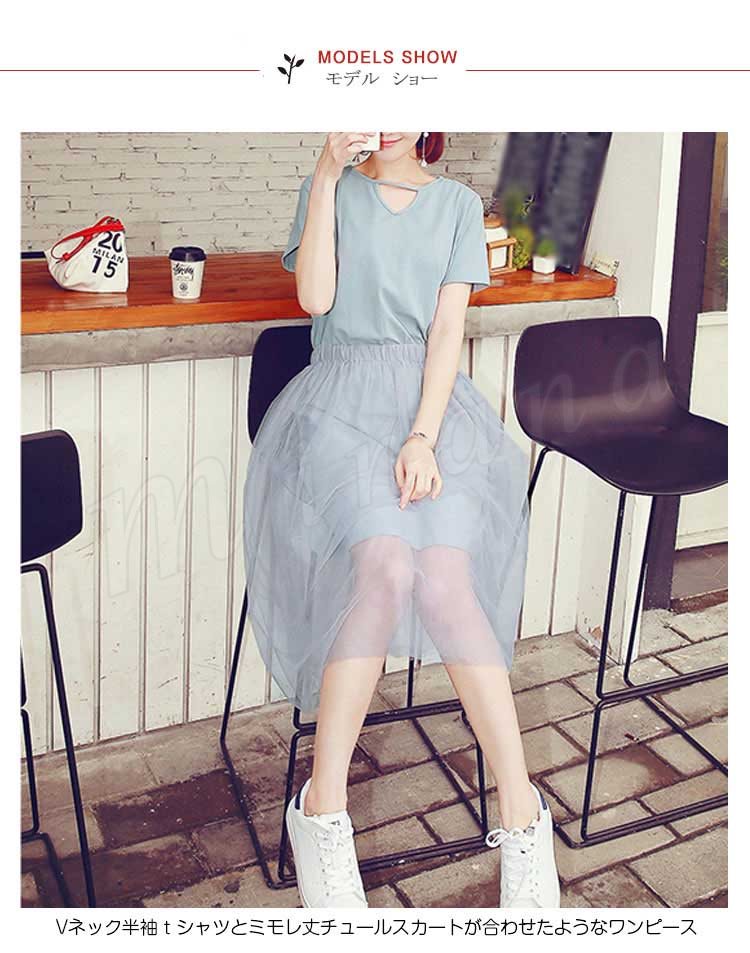 ワンピース レディース tシャツ 半袖 Vネック チュールスカート ミモレ丈