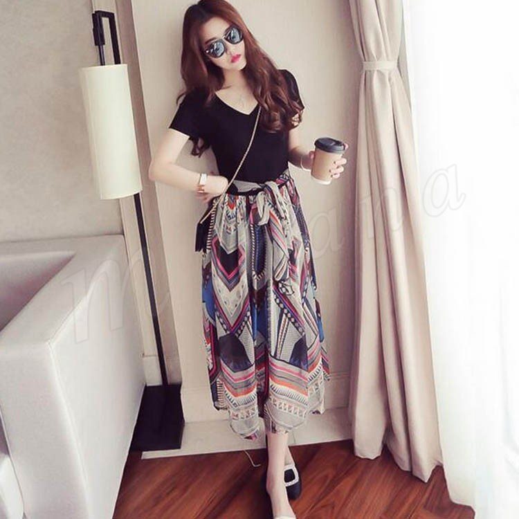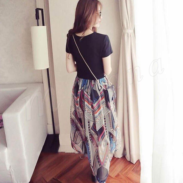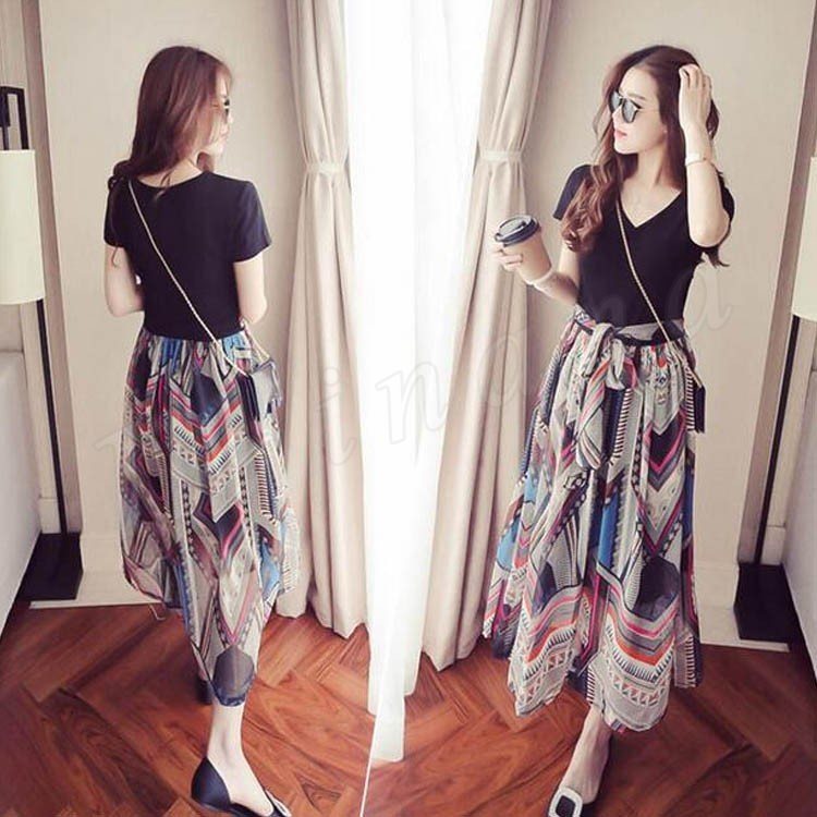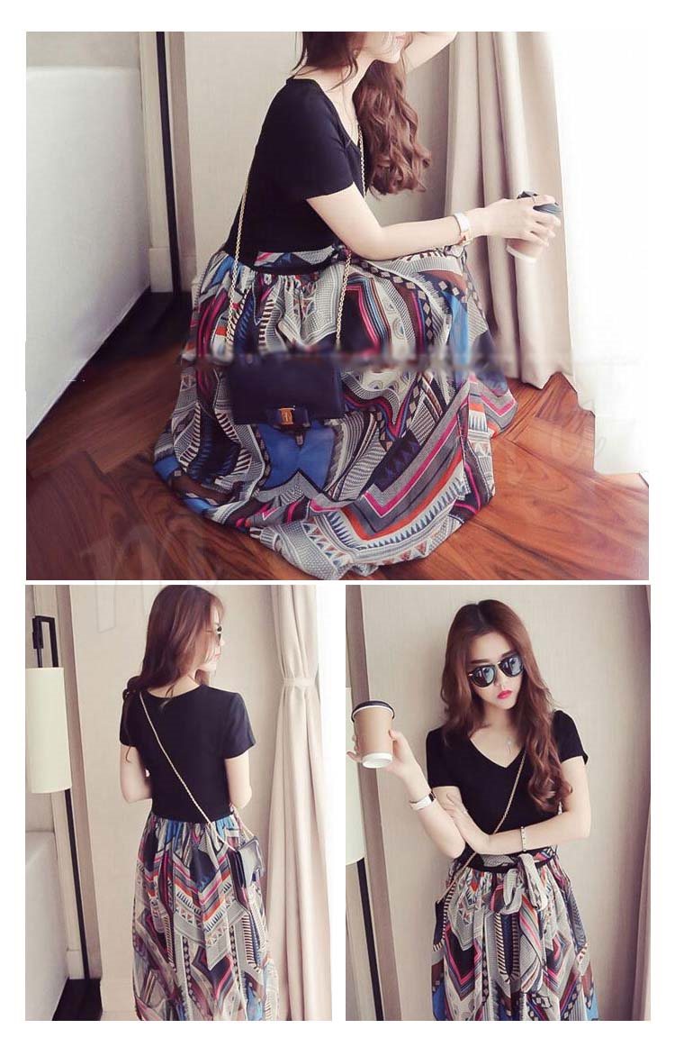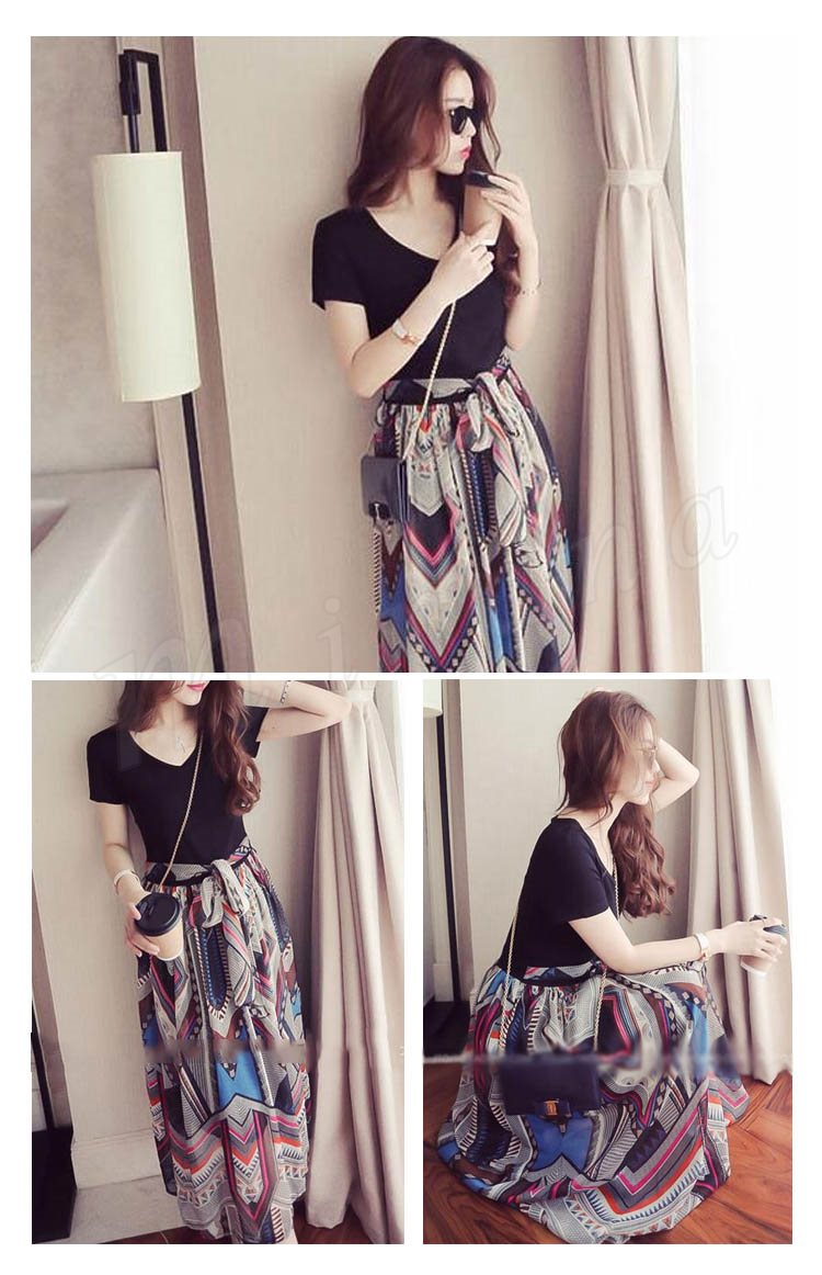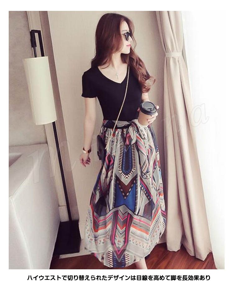 フェイクレイヤードワンピ ロングワンピ フレアワンピ シフォンワンピ レディース 半袖 Vネック 重ね着風 異素材切り替え 2018春新作