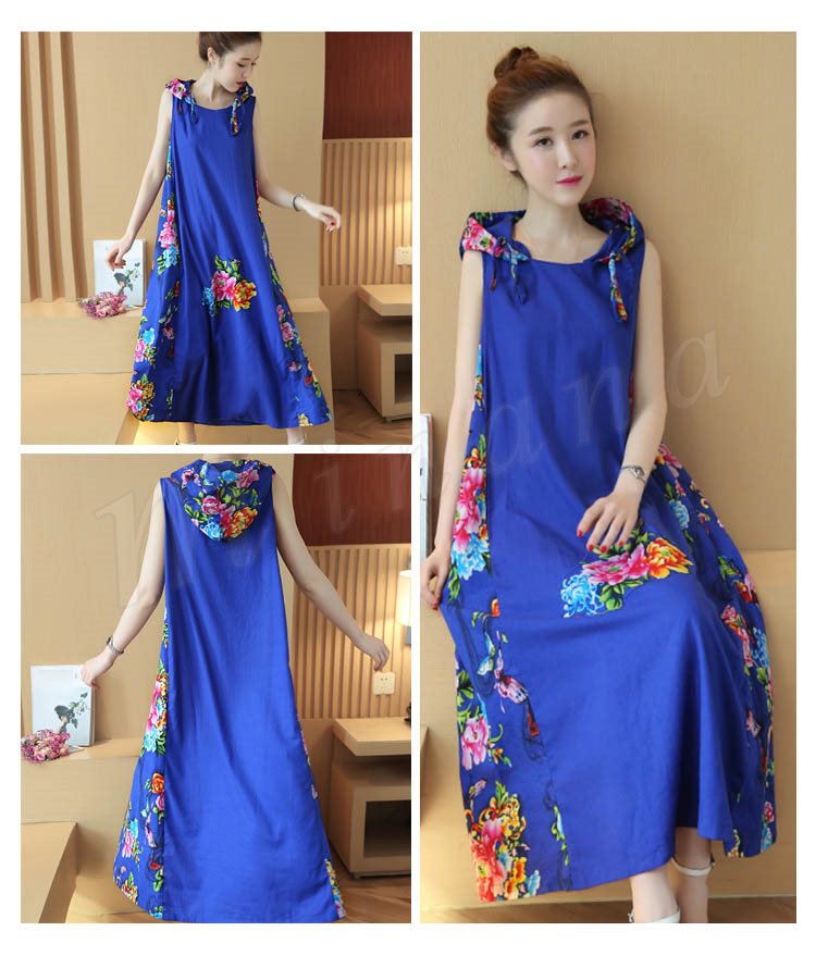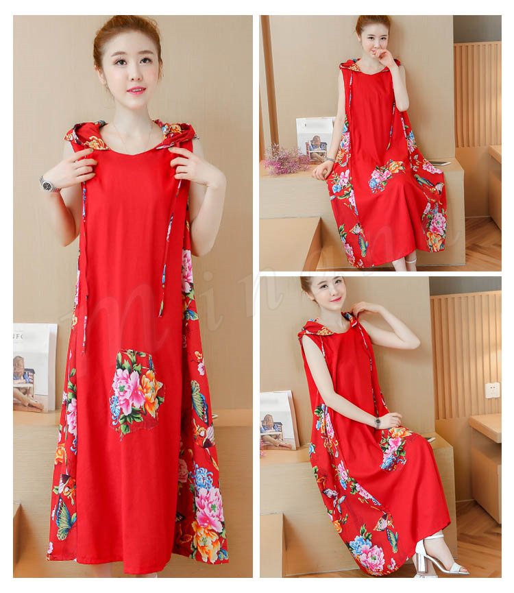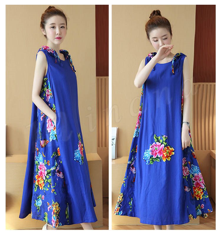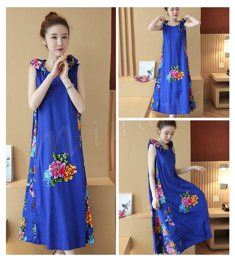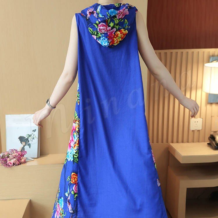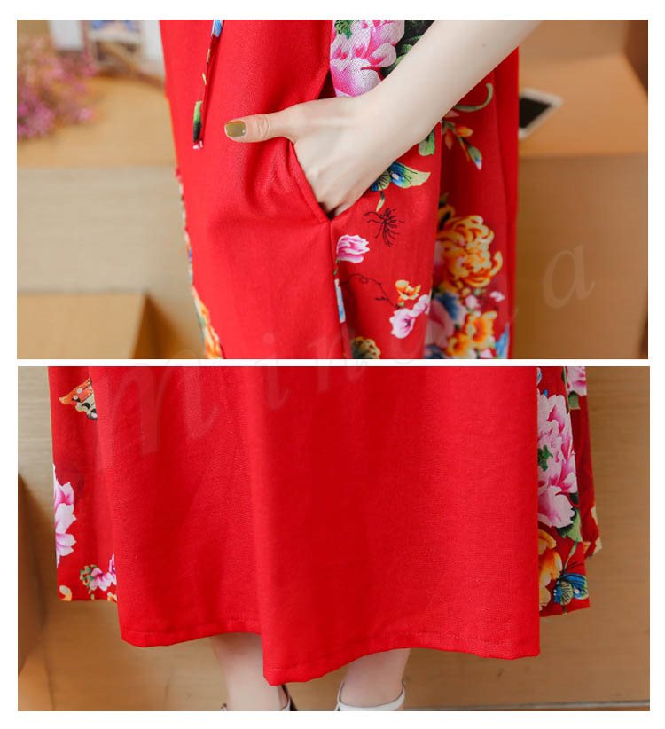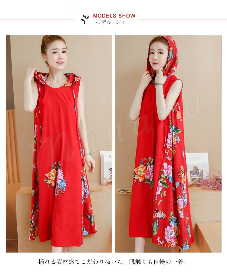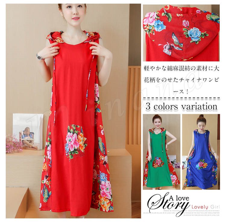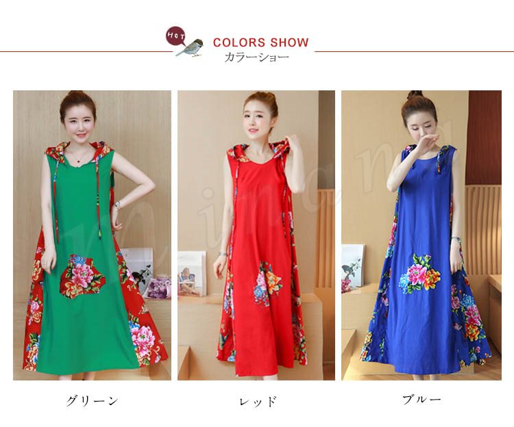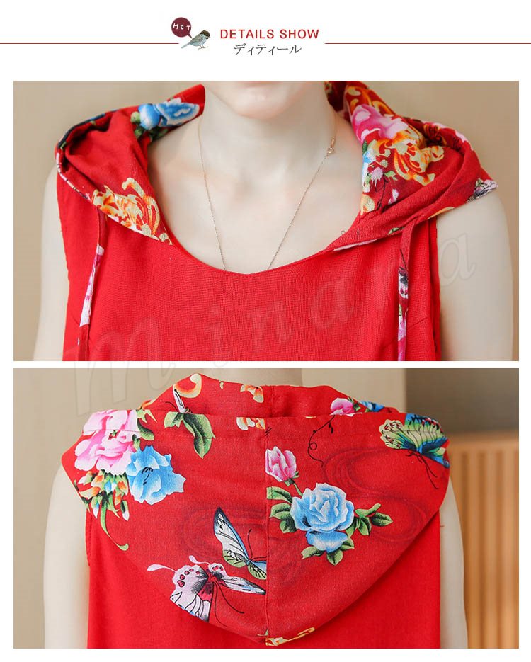 チャイナワンピース 綿麻ワンピース レディース ロングワンピース 切り替えワンピース ノースリーブ 花柄 七分丈 中国風 ゆったり 体型カバー