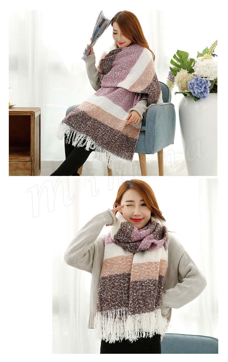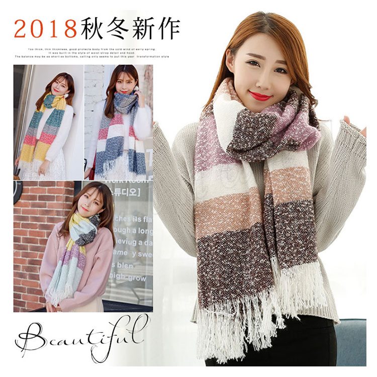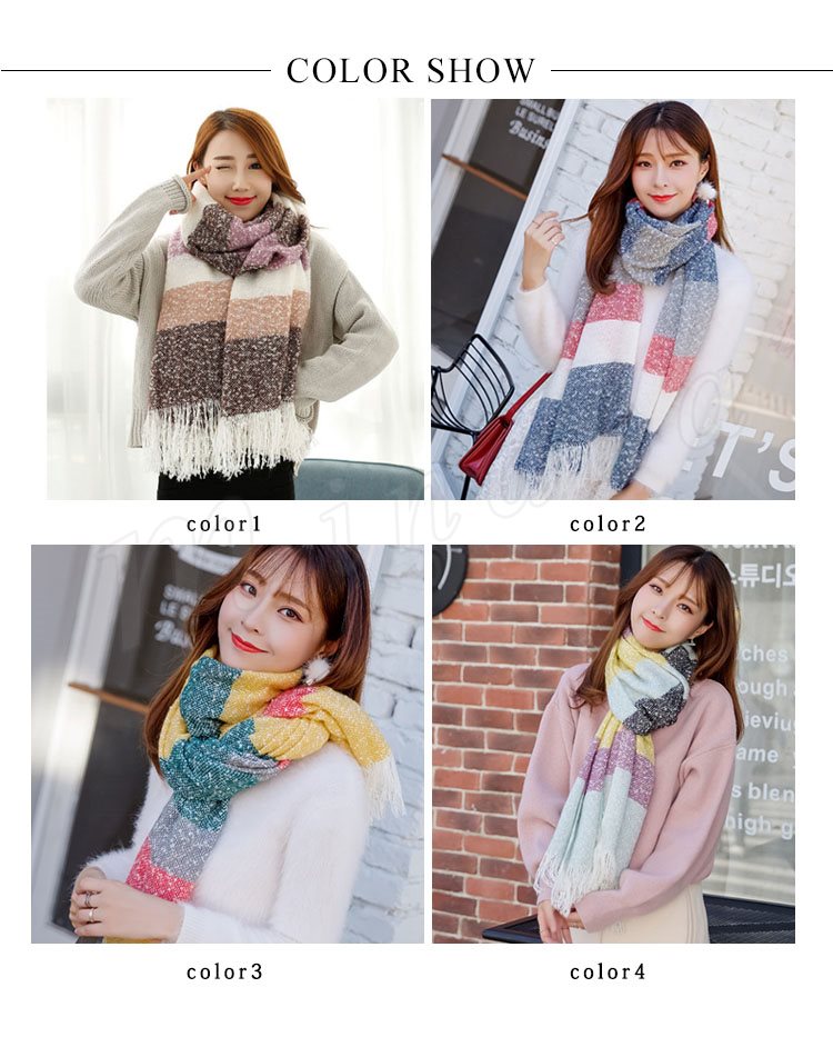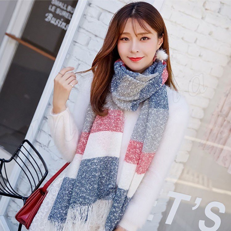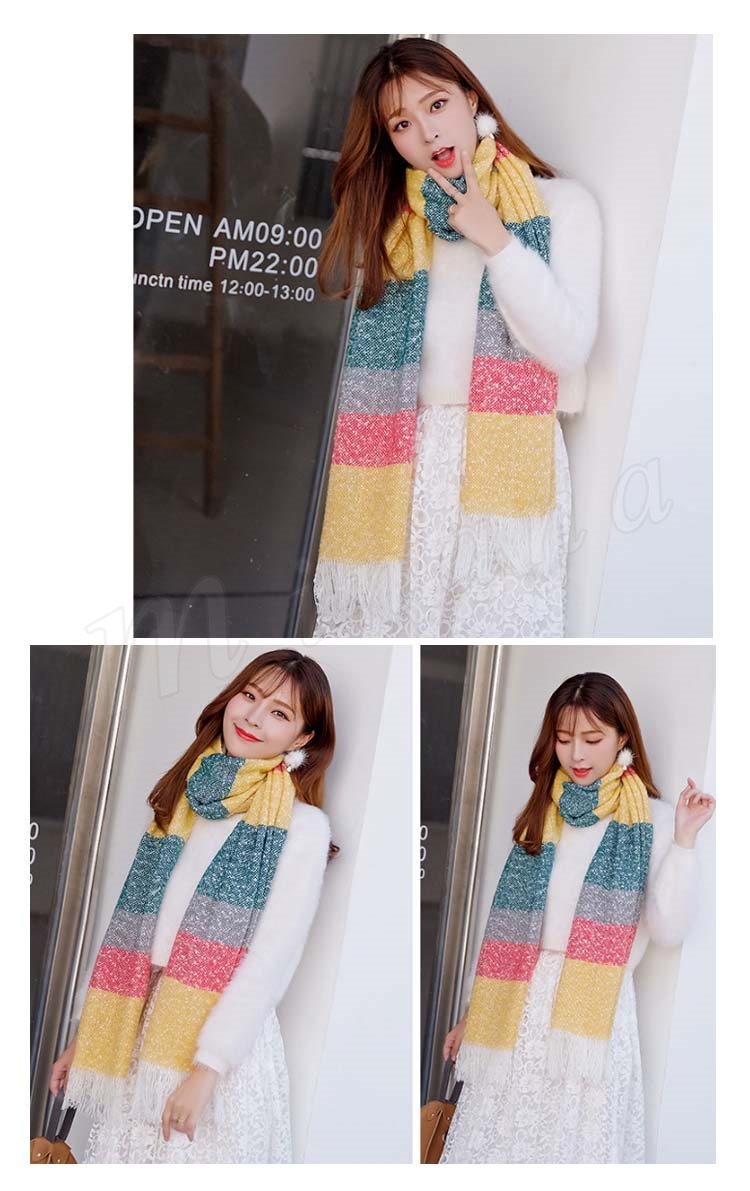 2018秋冬新作/マフラー/ストール/レディース/ニット/ショール/バイカラー/フリンジ/大判/防寒/厚手/あったか/ボーダー柄/ファッション/お