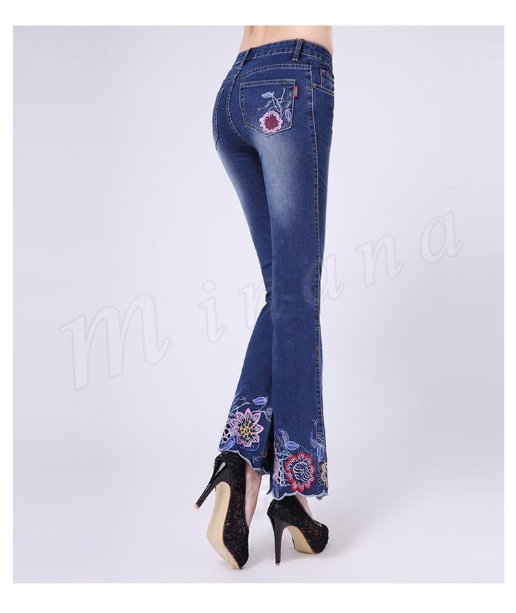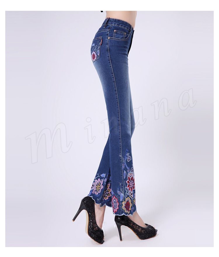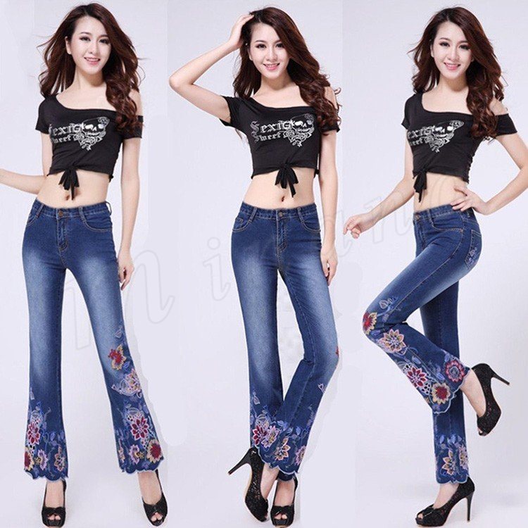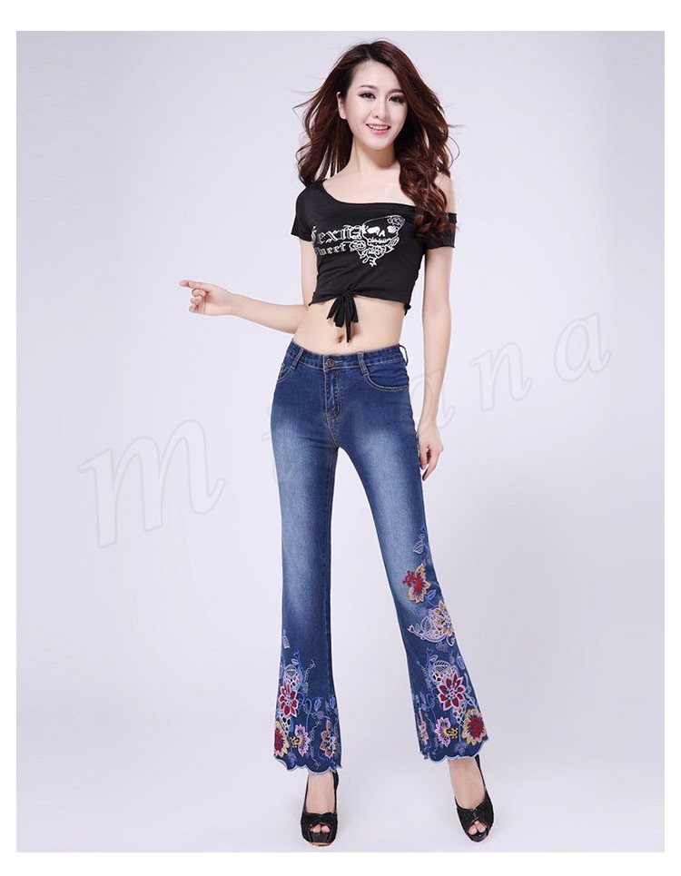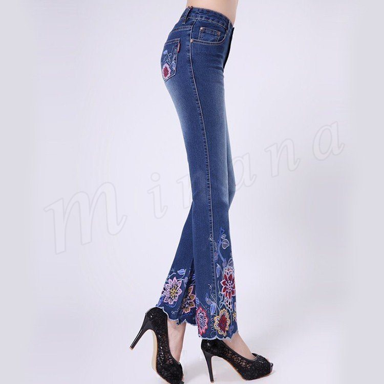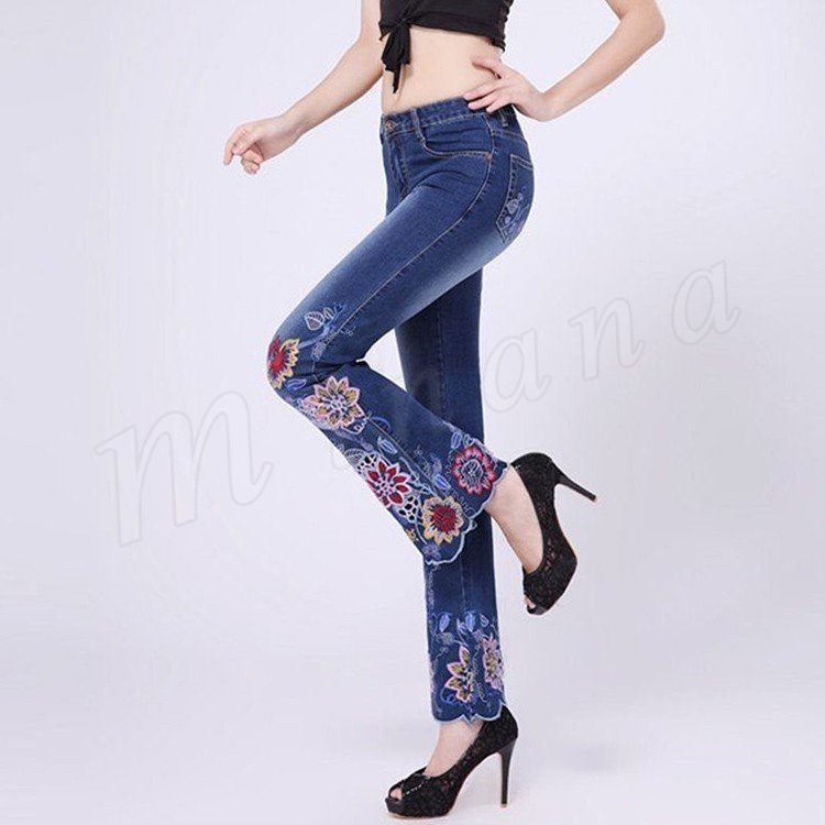 パンタロン デニム 刺繍 スキニー ジーパン 刺繍デニムパンツ 細身 9分丈 おしゃれ クロップドパンツ ワイドパンツ 裾フレア レディース