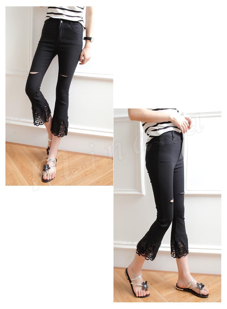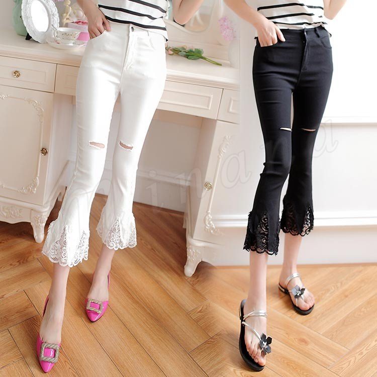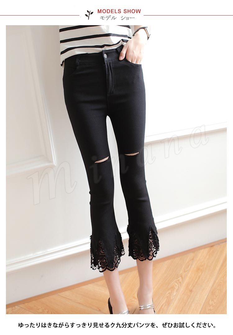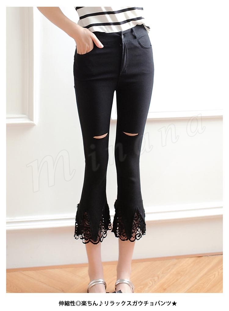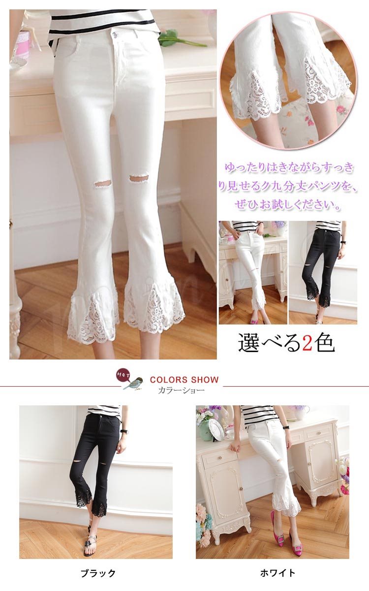クロップドパンツ レディース ガウチョパンツ 裾フレア レース切り替えパンツ カプリパンツ 七分丈パンツ ワイドパンツ 美脚パンツ