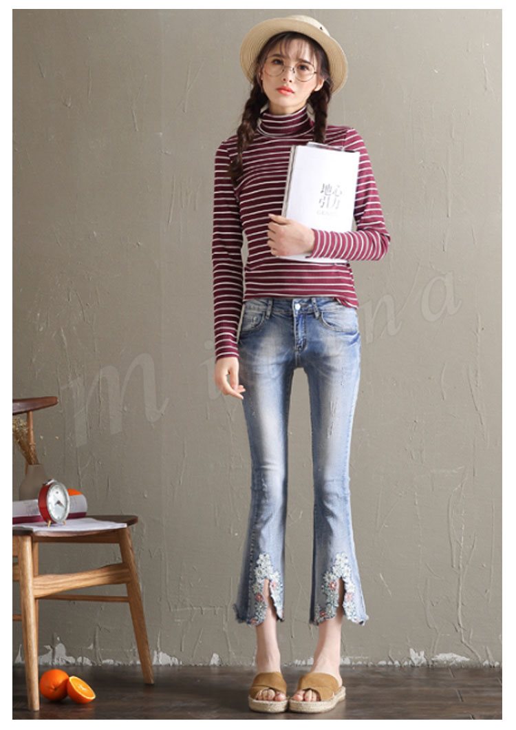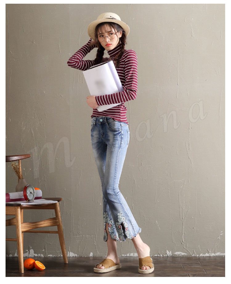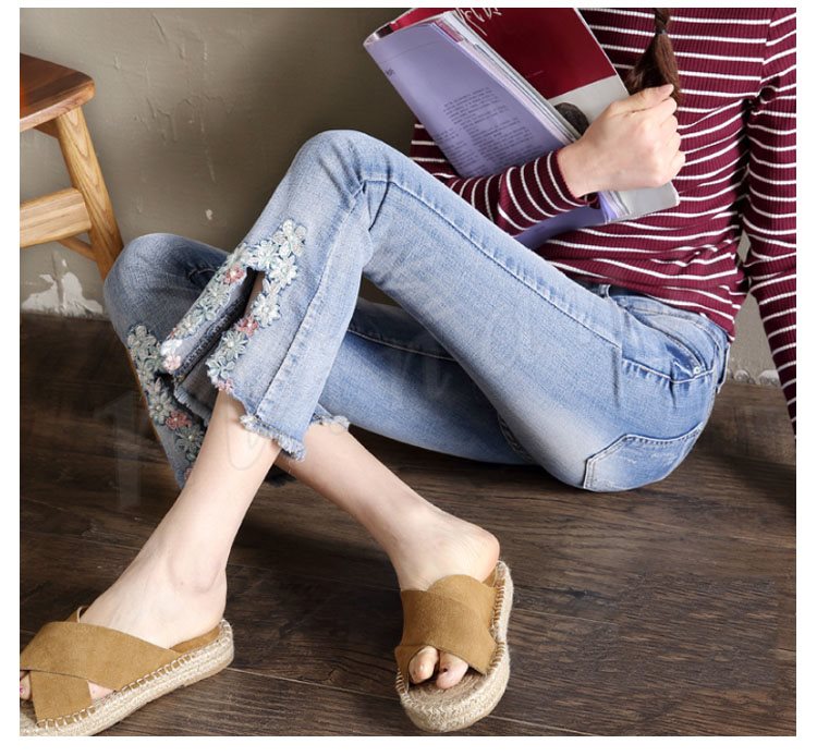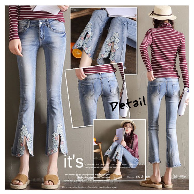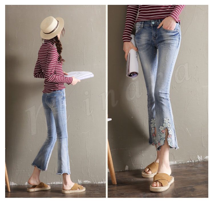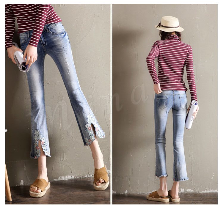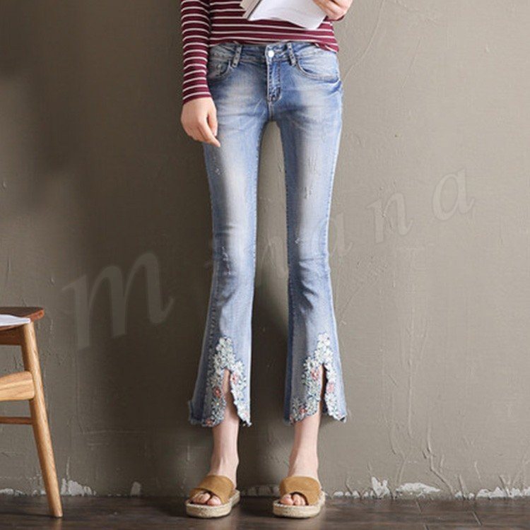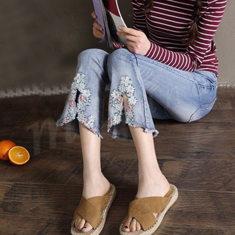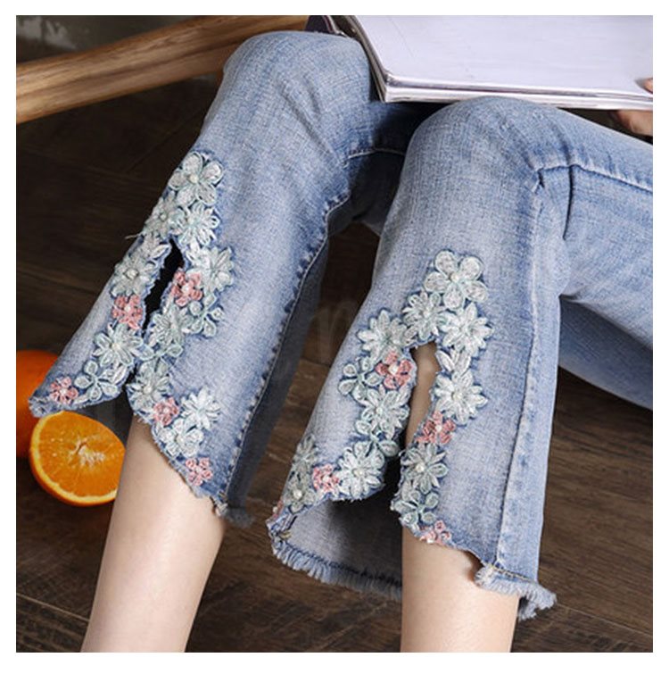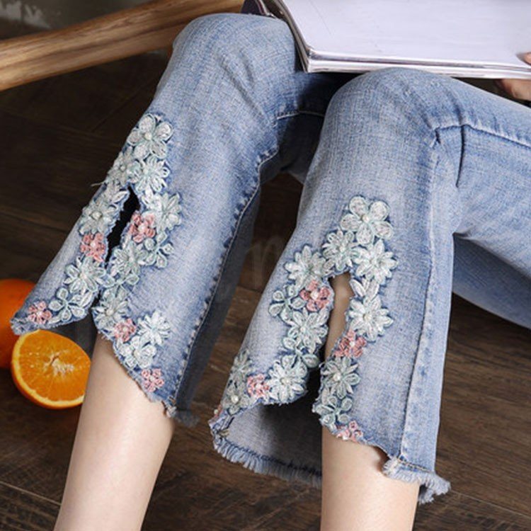 パンタロン デニム 刺繍 スキニー ジーパン 刺繍デニムパンツ 細身 9分丈 おしゃれ クロップドパンツ ワイドパンツ 裾フレア レディース