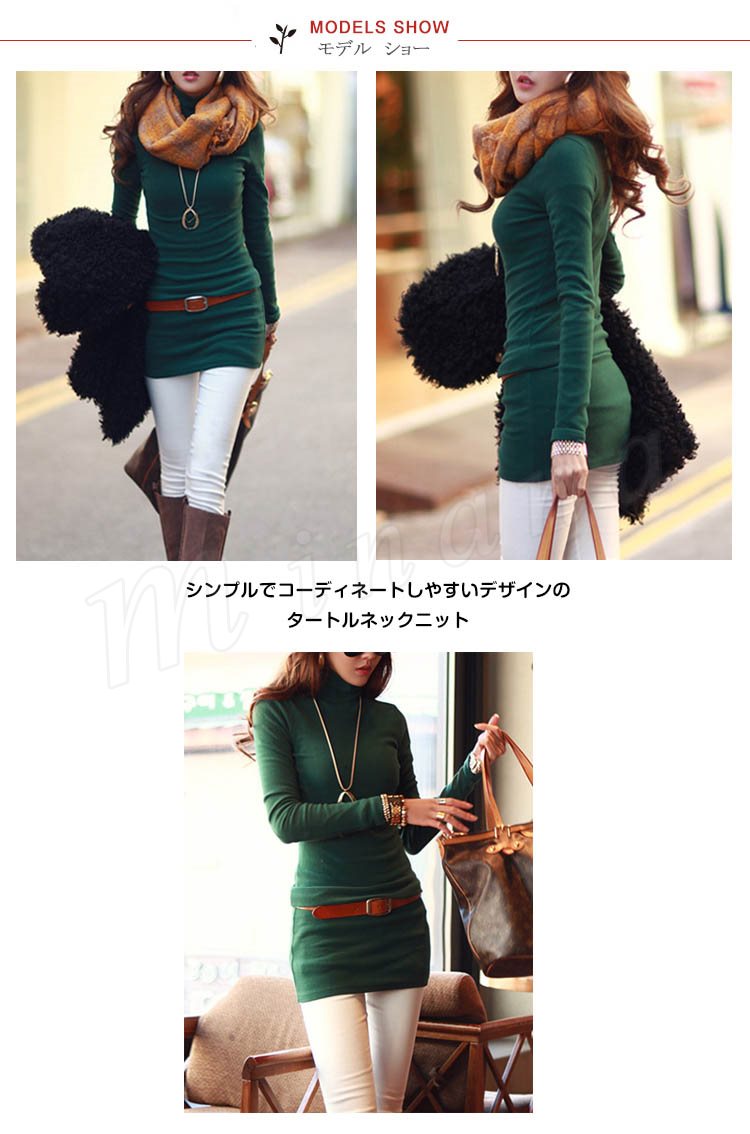 | シンプルでコーディネートしやすいデザインのタートルネックニット 女性らしさを引き立てながら暖かなスタイリングへと導いてくれる、秋冬コーデにかかせないアイテム。 すっきりとスリムなシルエットですが、伸縮性があるので心地よくボディにフィットしてくれそうです。 ヒップにかかる丈感なので、スリムボトムス着用時に気になるヒップをさりげなくカバーしてくれそうですね。 もちろんフレアスカートなどにインたメリハリのあるスタイリングもおすすめです。 | |