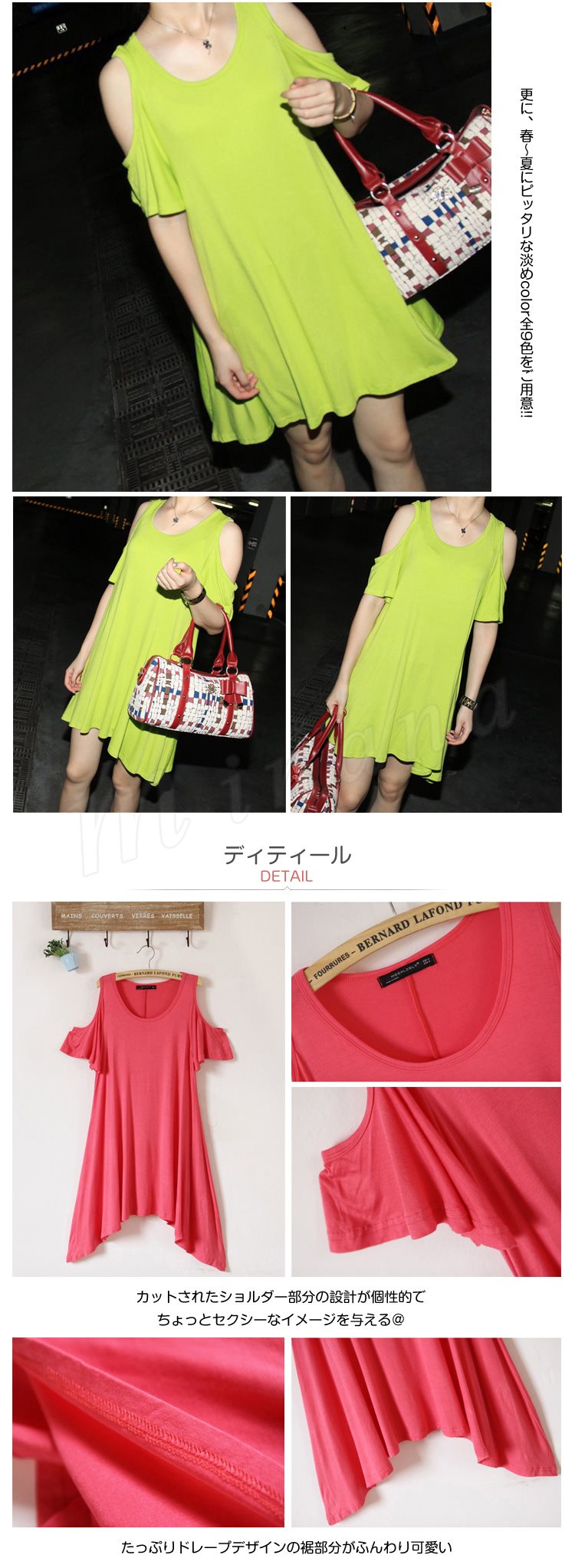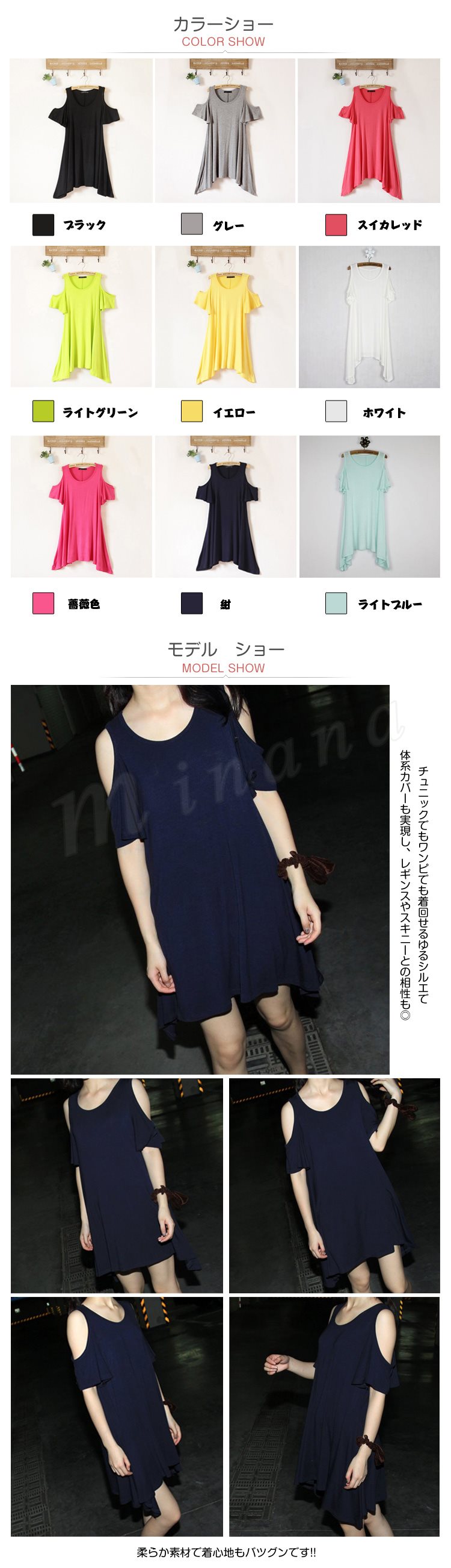 | 春の肌魅せ解禁★肩オープンチュニックワンピ登場♪ 柔らか素材で着心地もバツグンです!! 肩部分が穴あきになって落ち、 肌見せが出来る!ちょいセクシー! チュニックでもワンピでも着回せるゆるシルエで 体系カバーも実現し、レギンスやスキニーとの相性も◎ 更に、春?夏にピッタリな淡めcolor全9色をご用意!! デート服にも、持ってこいの女子必見ITEMです☆ | |