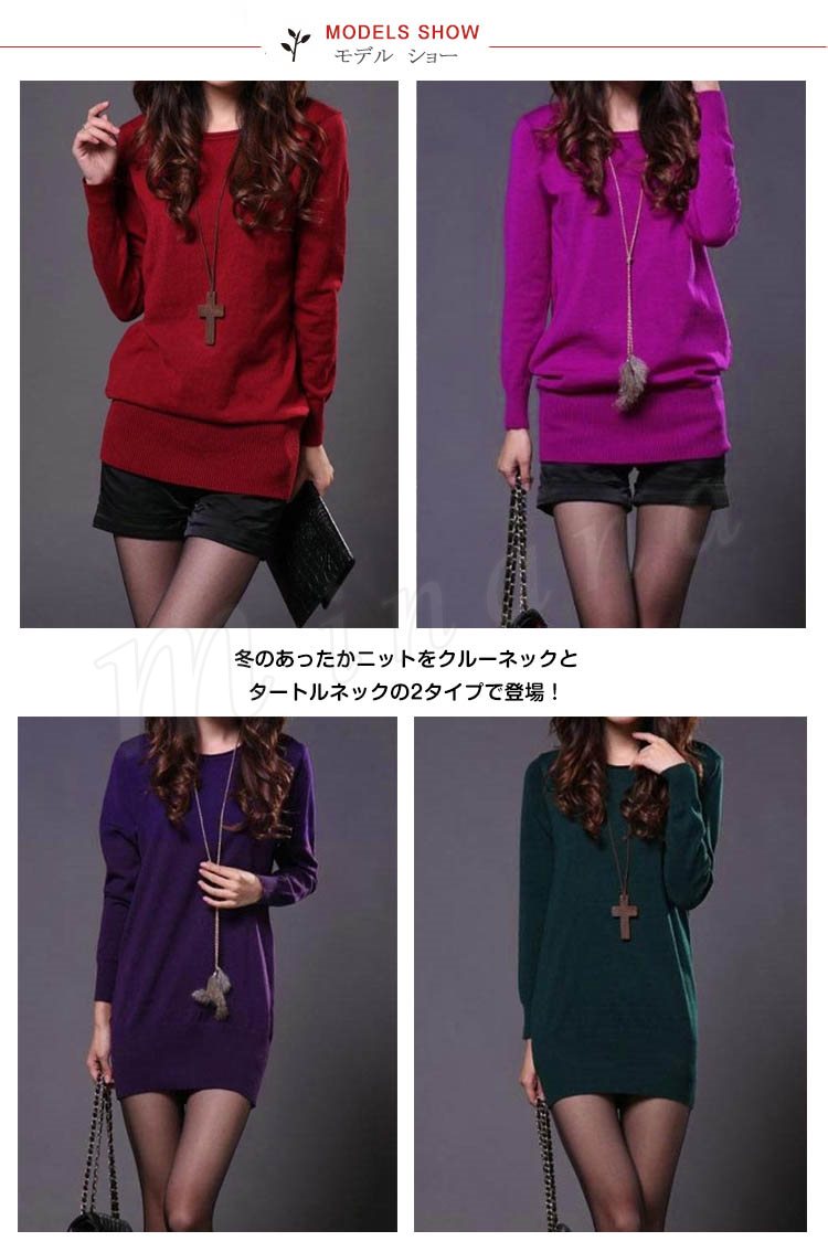 | 冬のあったかニットをクルーネックとタートルネックの2タイプで登場! お尻をすっぽりと包んでくれるチュニック丈はいろいろなシーンで着用できる! ボディフィットするピタピタ感がたまらない! 女性らしいやさしく柔らかな雰囲気に仕上げてくれた表情豊かな一枚! | |