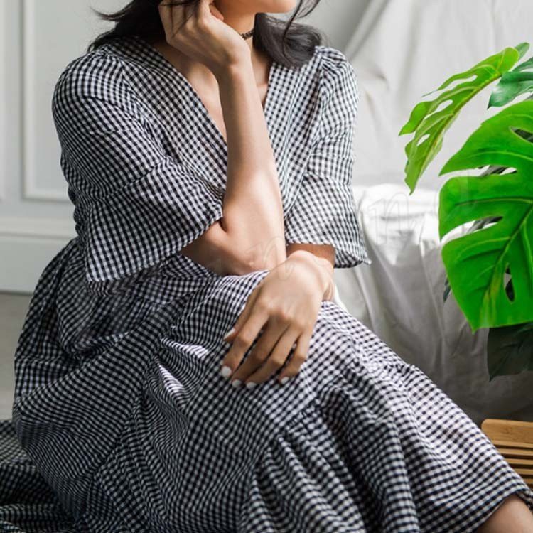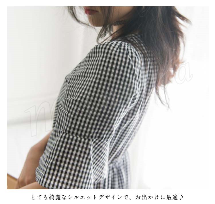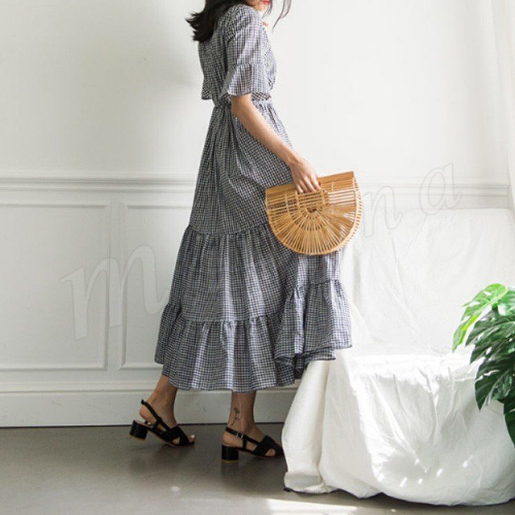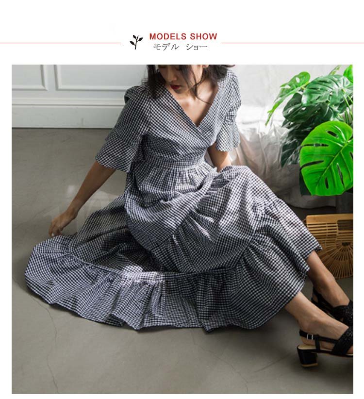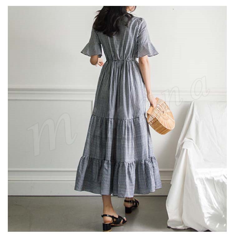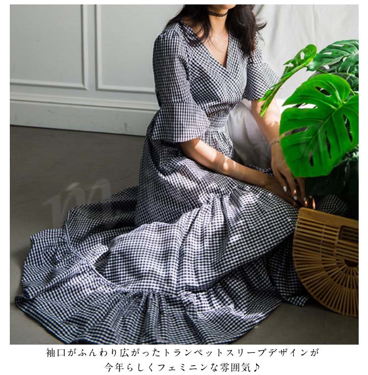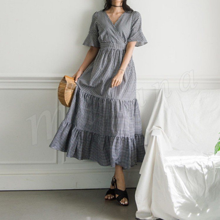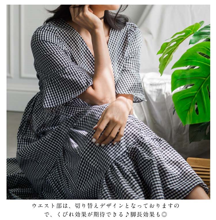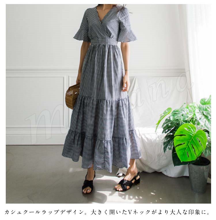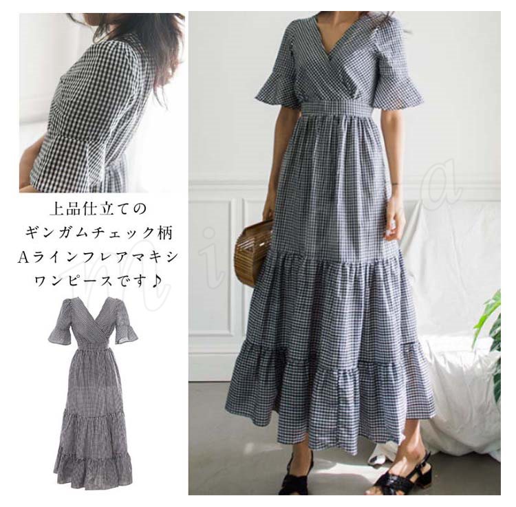 レディース 半袖 ワンピース ロング丈 ギンガムチェック ギャザー マキシワンピース フレアワンピース Vネック Aライン ふんわり シルエット フリ
