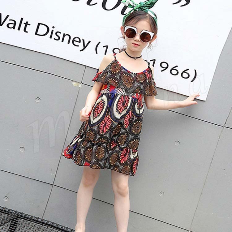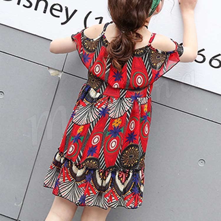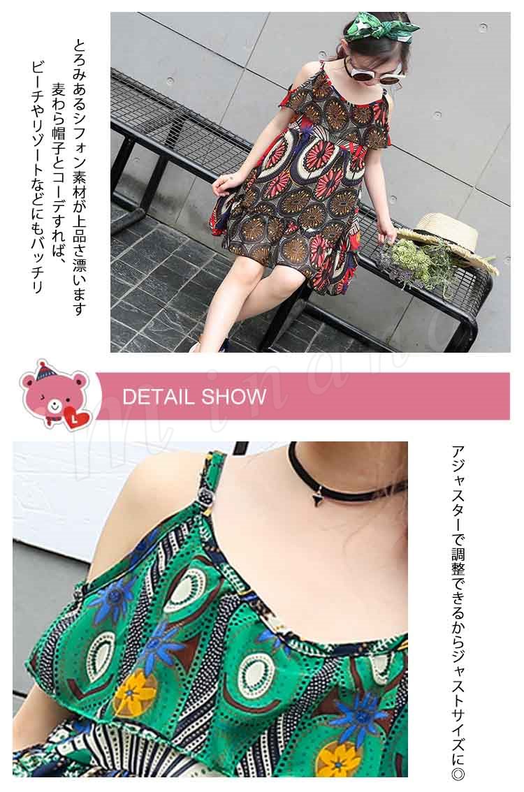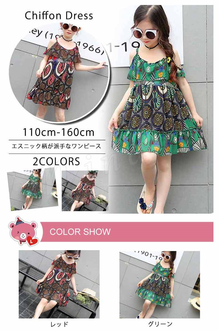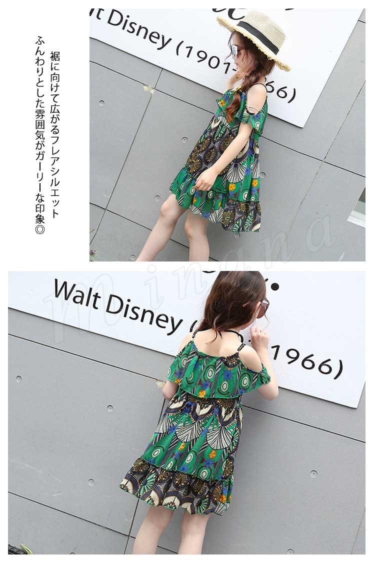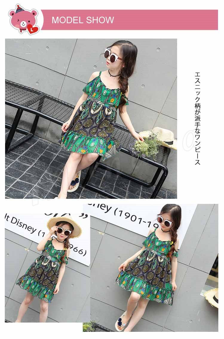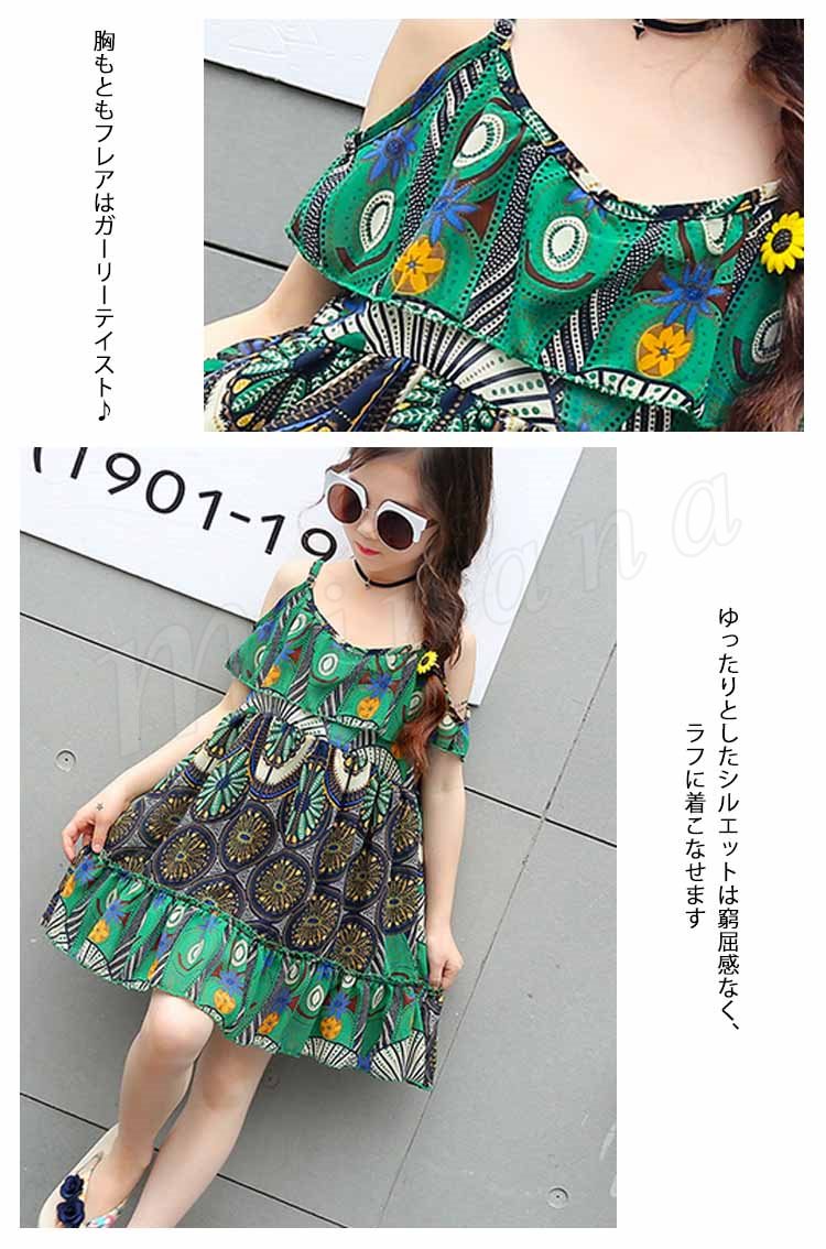 キャミソールワンピース ボヘミア 女の子 キッズ ノースリーブワンピース ワンピース Aライン フレア 肩開き 肩見せ プリント エスニック