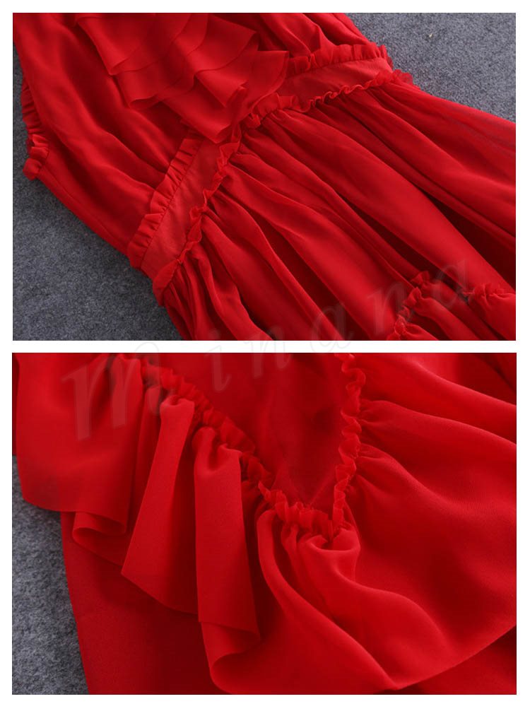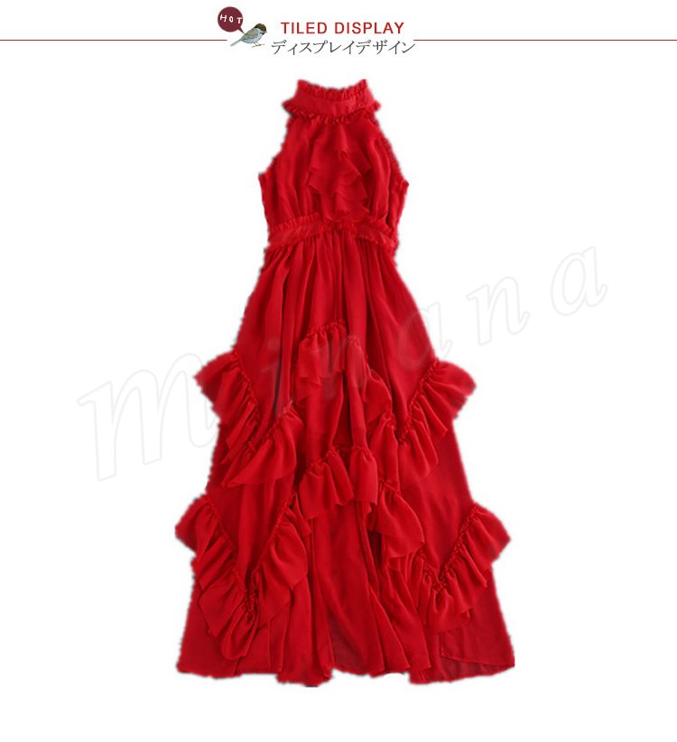フリルとギャザーが女性らしさを際立たせるロングワンピース。
