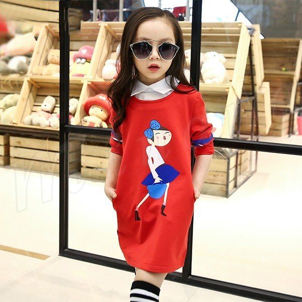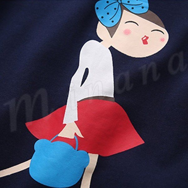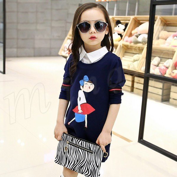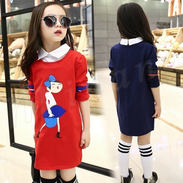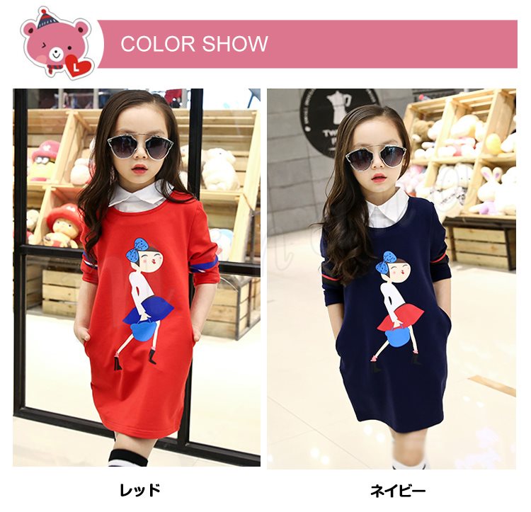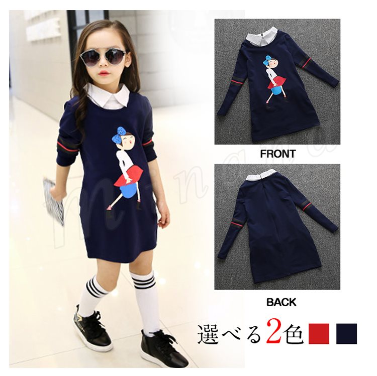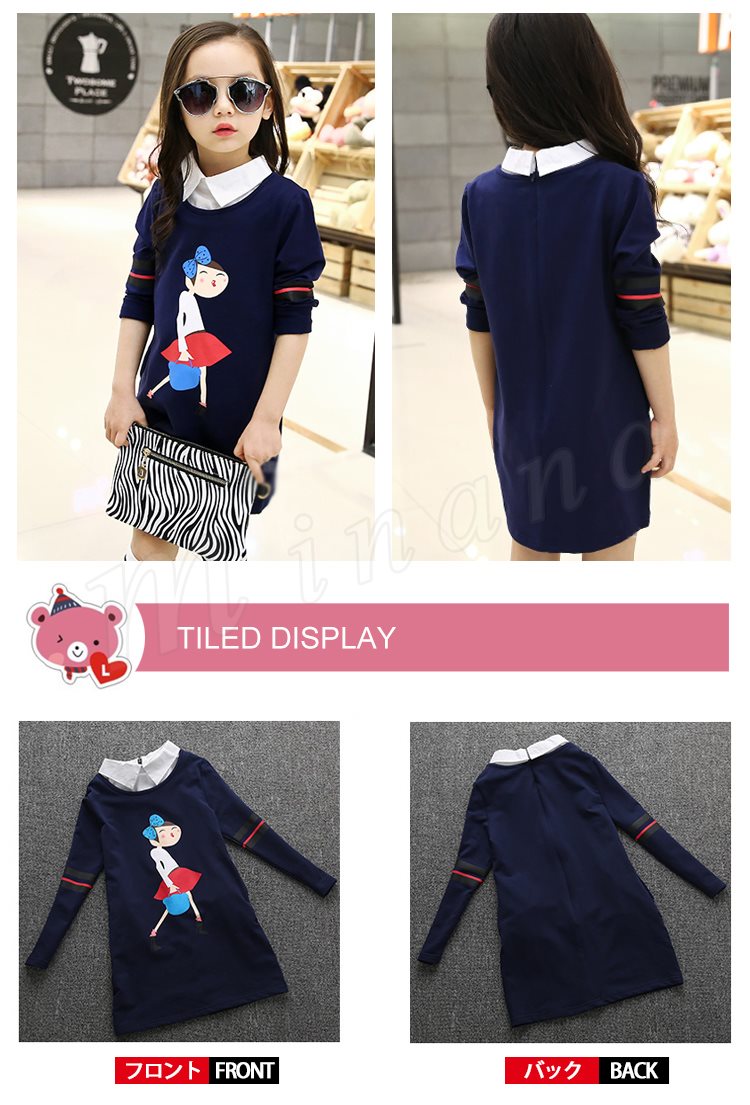 送料無料Tシャツ ロングTシャツ Tシャツワンピース 長袖 プリント カートーン 子供服 ショートワンピ ミニワンピ キュート ボーダー入り