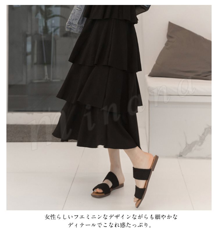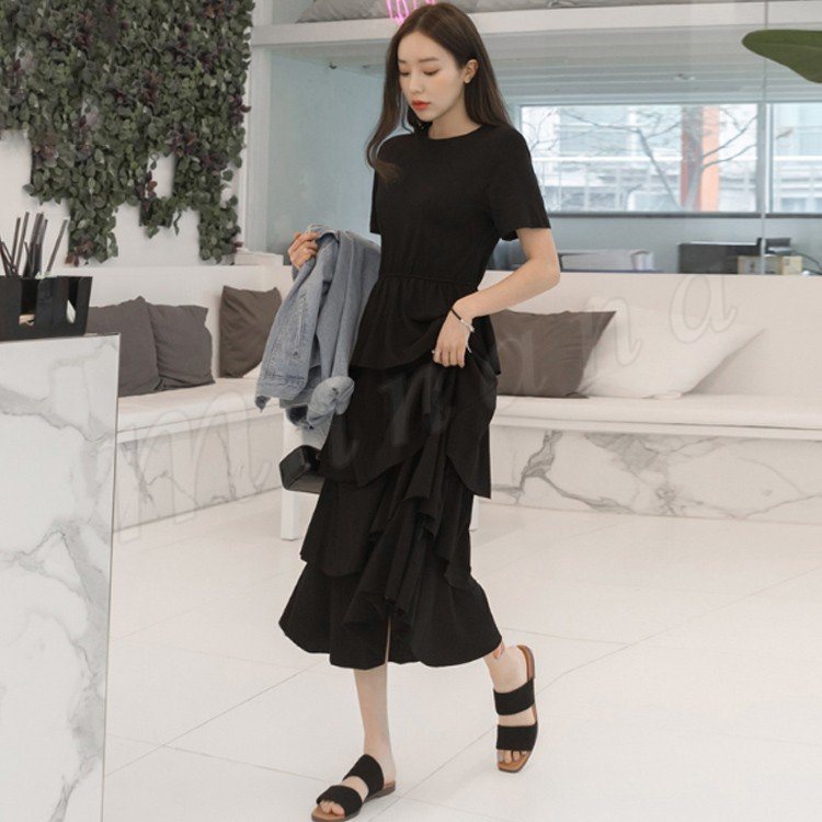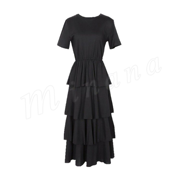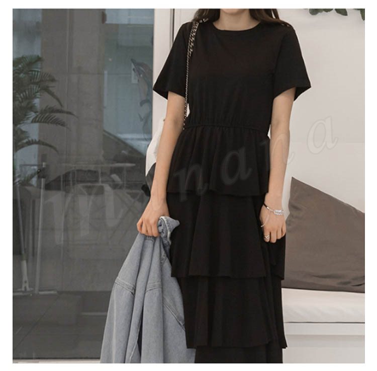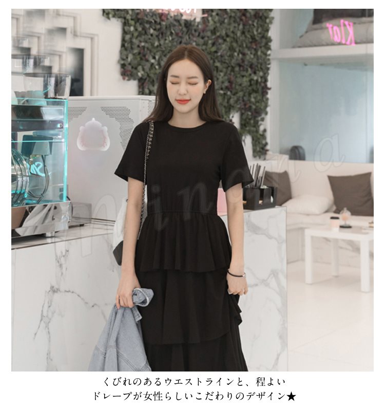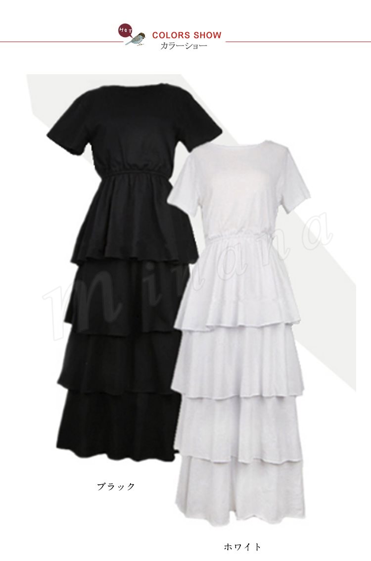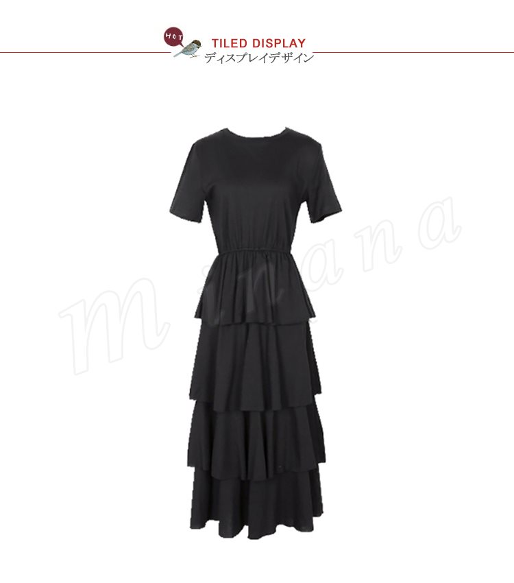 レディース 半袖 ワンピース ロング丈 マキシワンピース ティアード クルーネック Aライン 4段フリル ふんわり 無地 シルエット