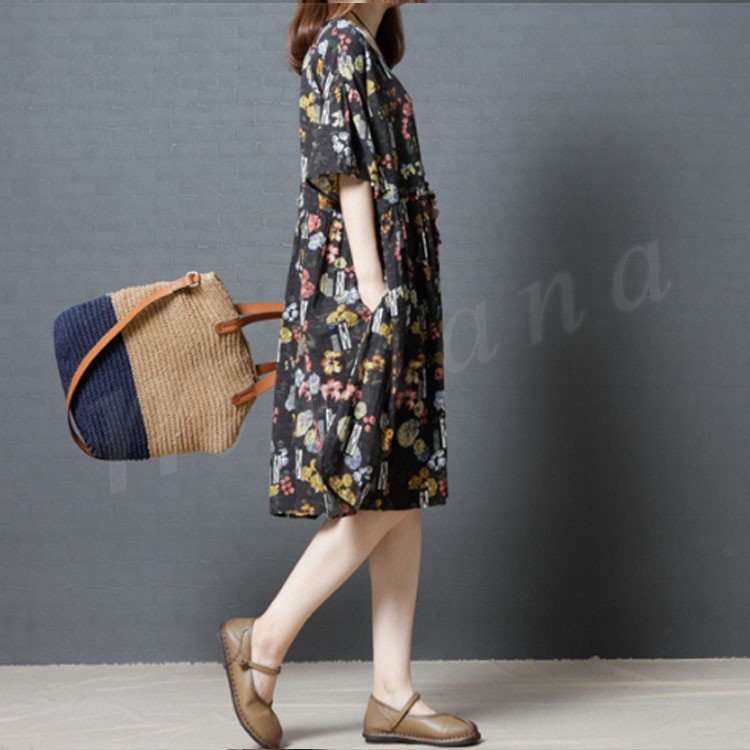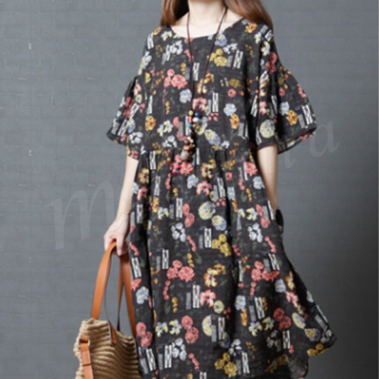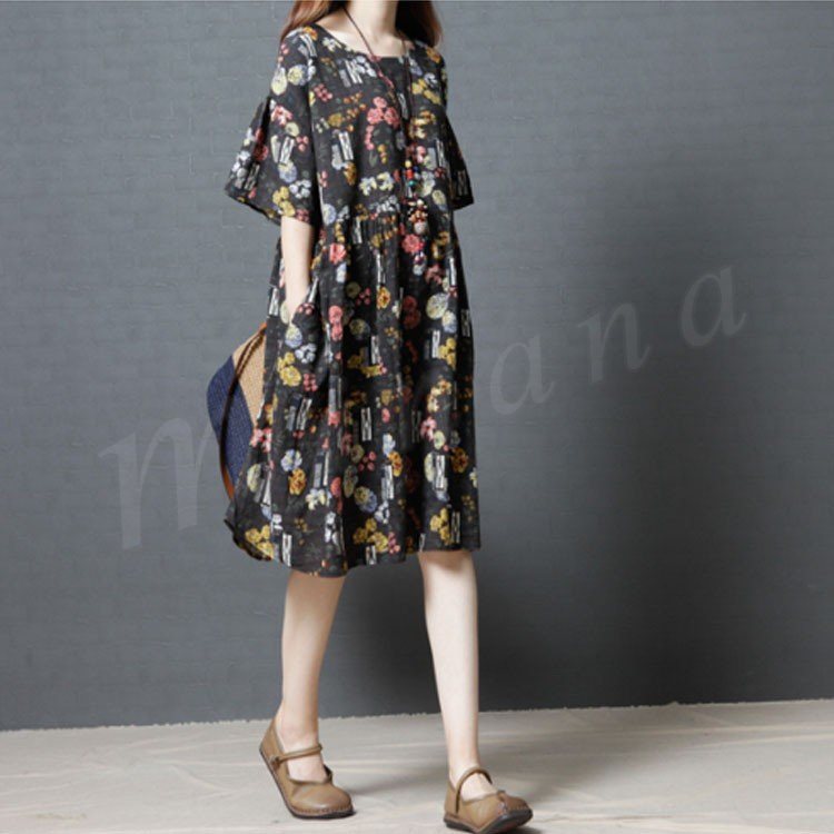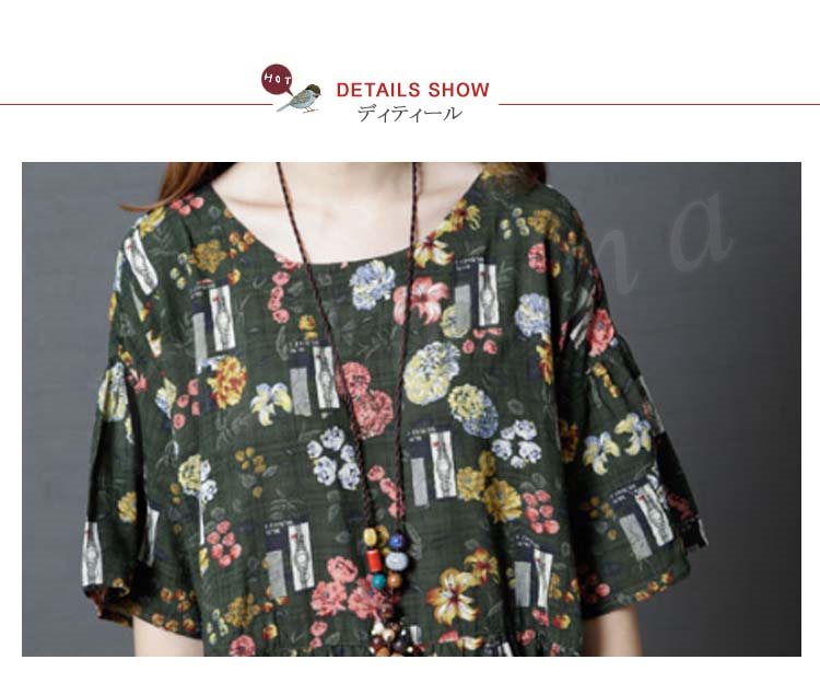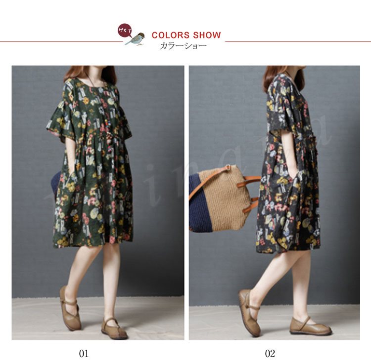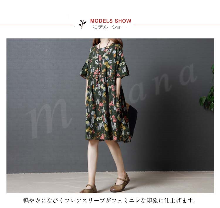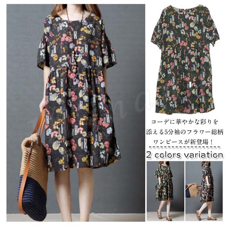 レディース ワンピース チュニック 5分袖 花柄 フレアスリーブ 膝丈 Aライン フレアワンピース 体型カバー 大きいサイズ 3カラー 4サイズ M