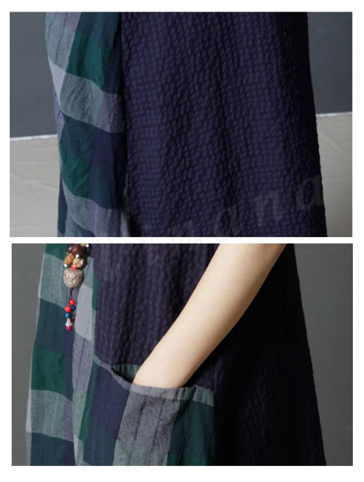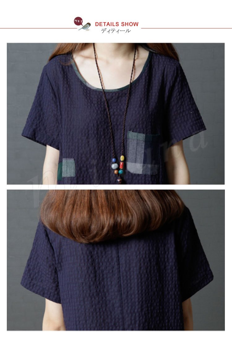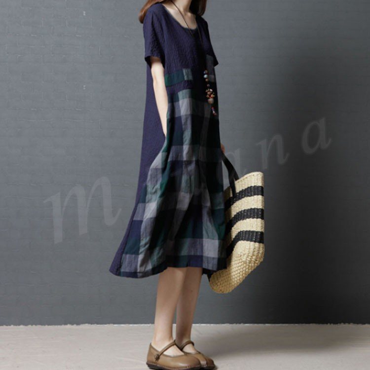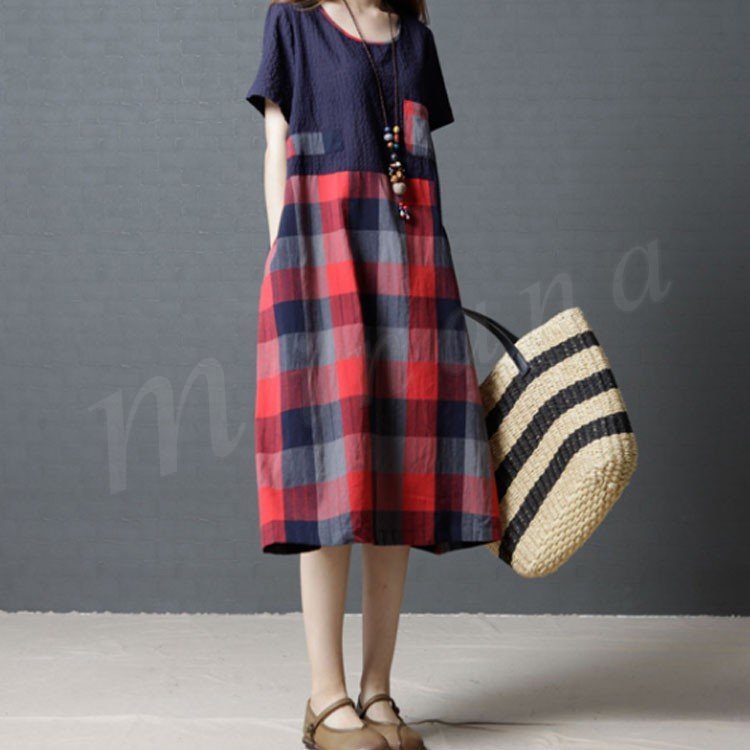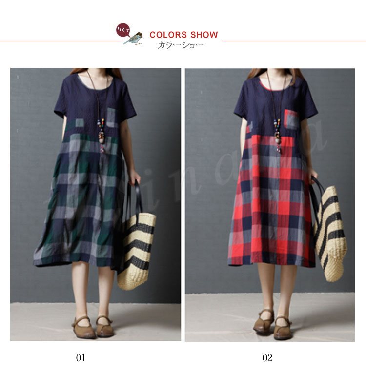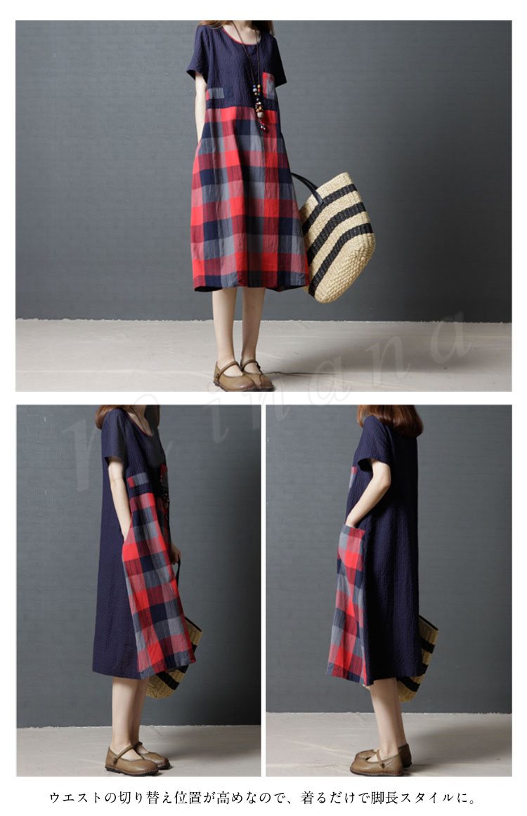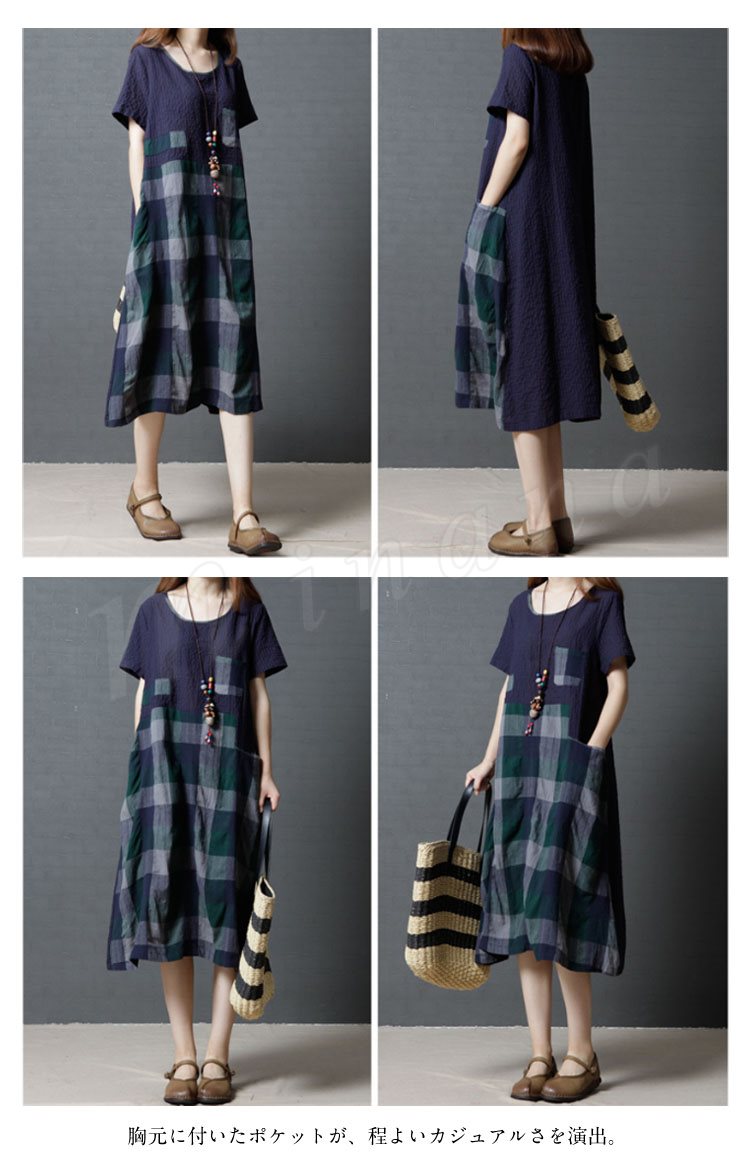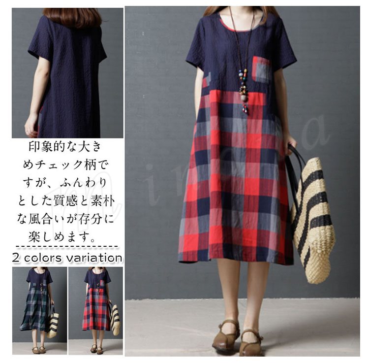 レディース ワンピース 半袖 チュニック チェック柄 Aライン 膝丈 シボ感 フレアワンピース 薄手 ミディアム丈 大きいサイズ 2カラー 4サイズ