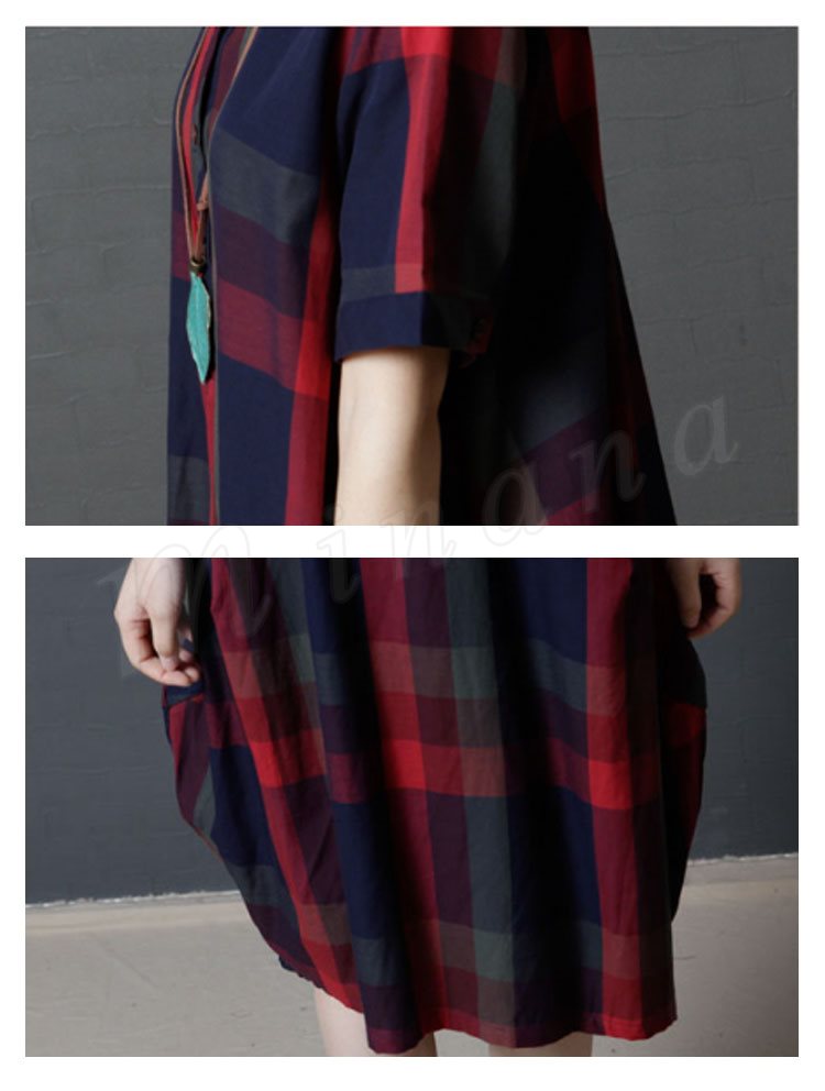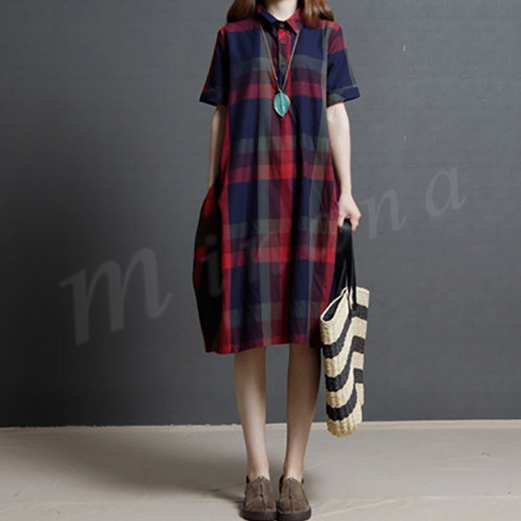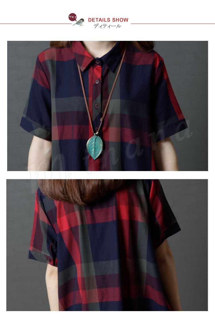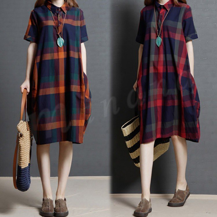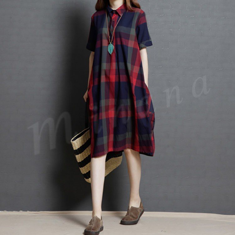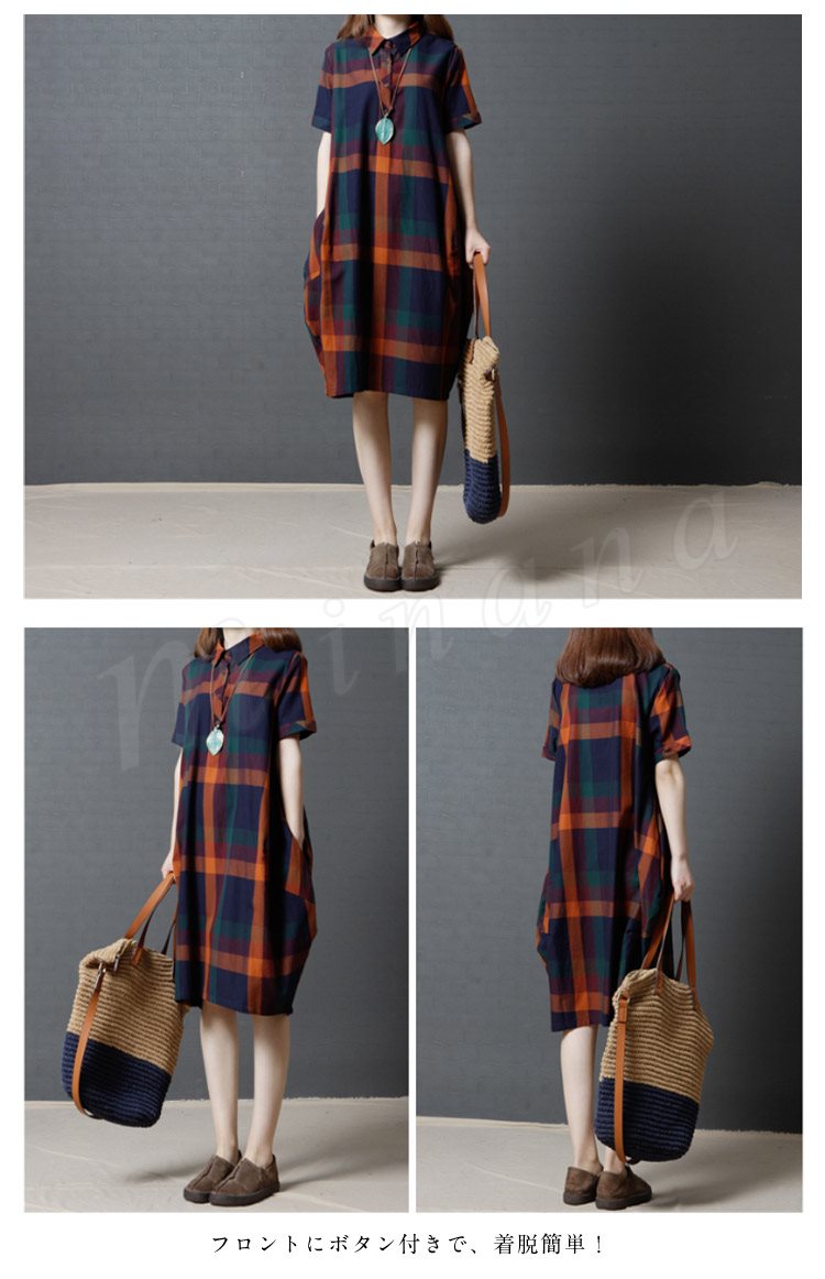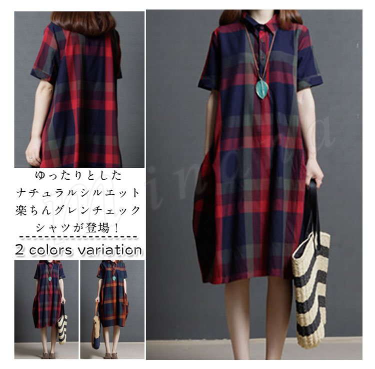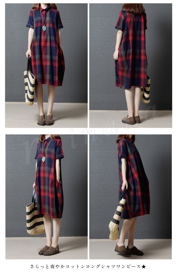 レディース ワンピース 半袖 シャツ チェック柄 シャツワンピース チェックシャツ ロングシャツ 膝丈 ゆったり 大きいサイズ 2カラー 4サイズ M