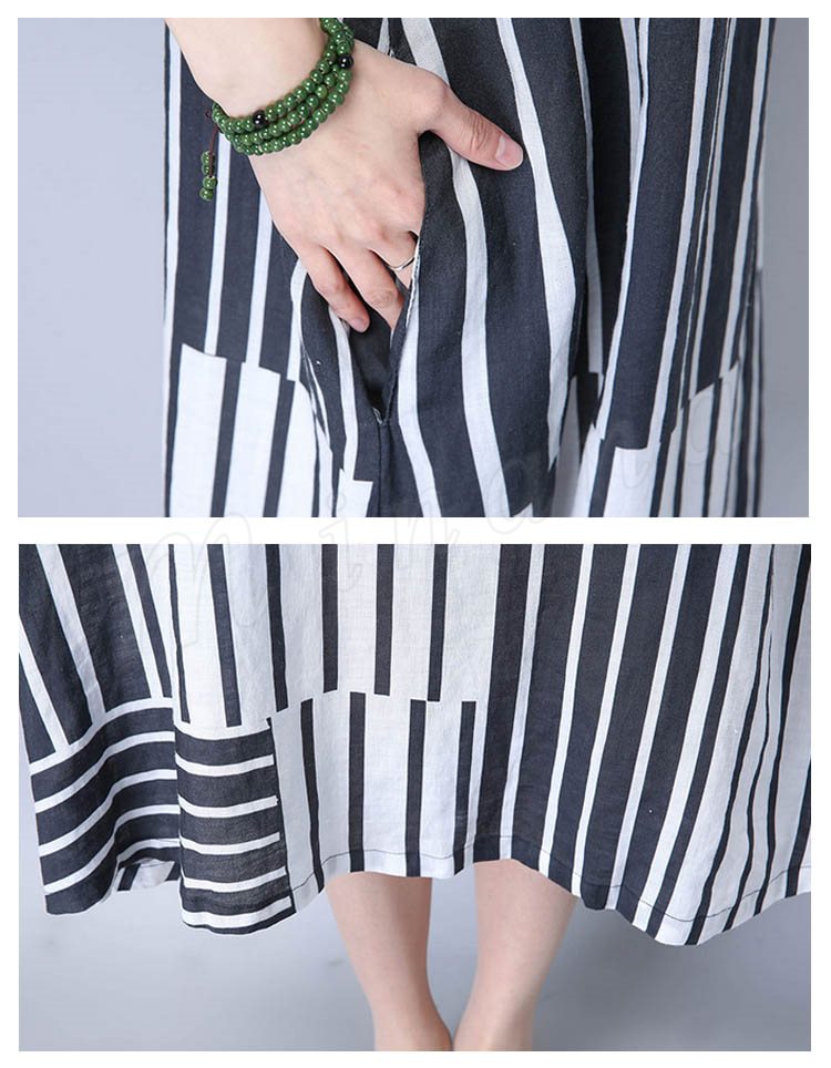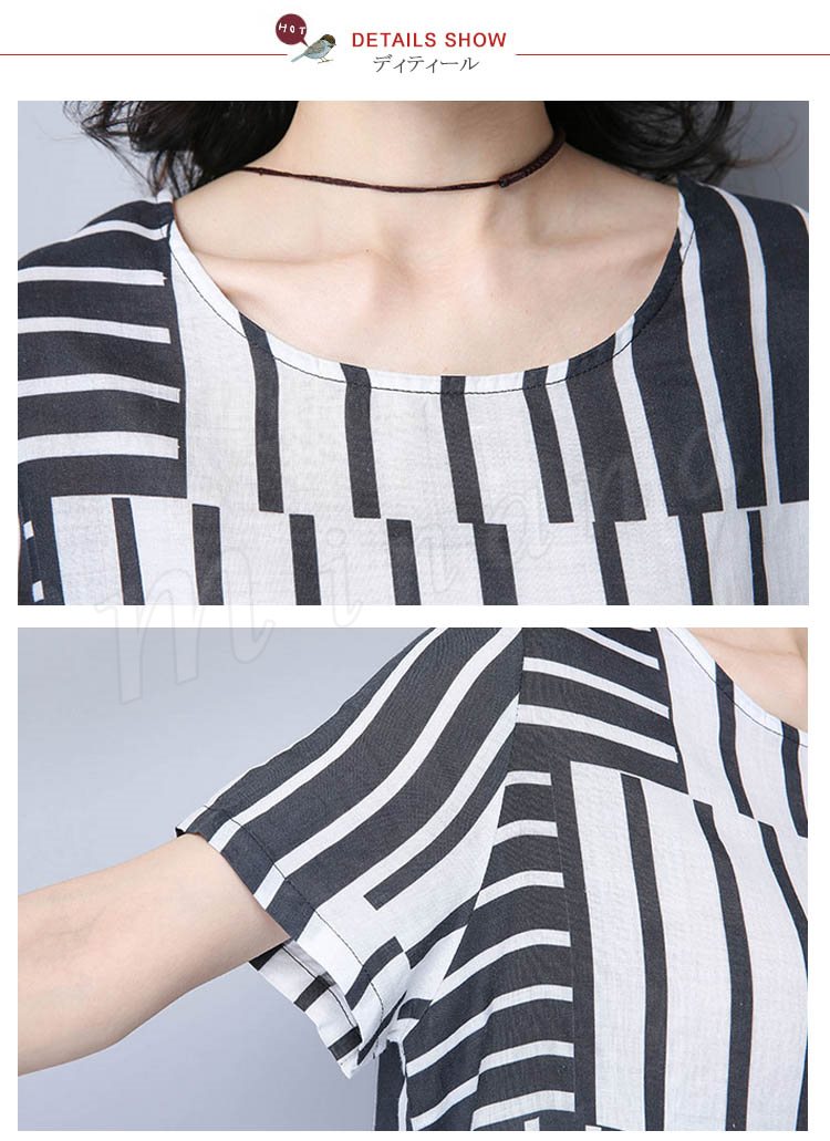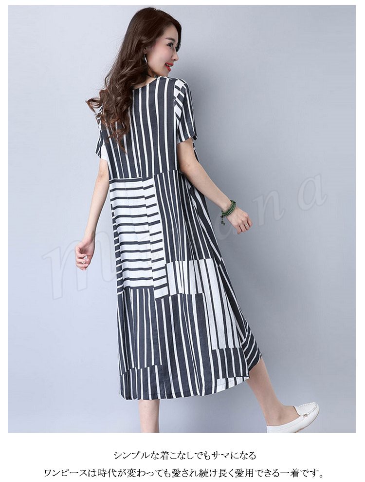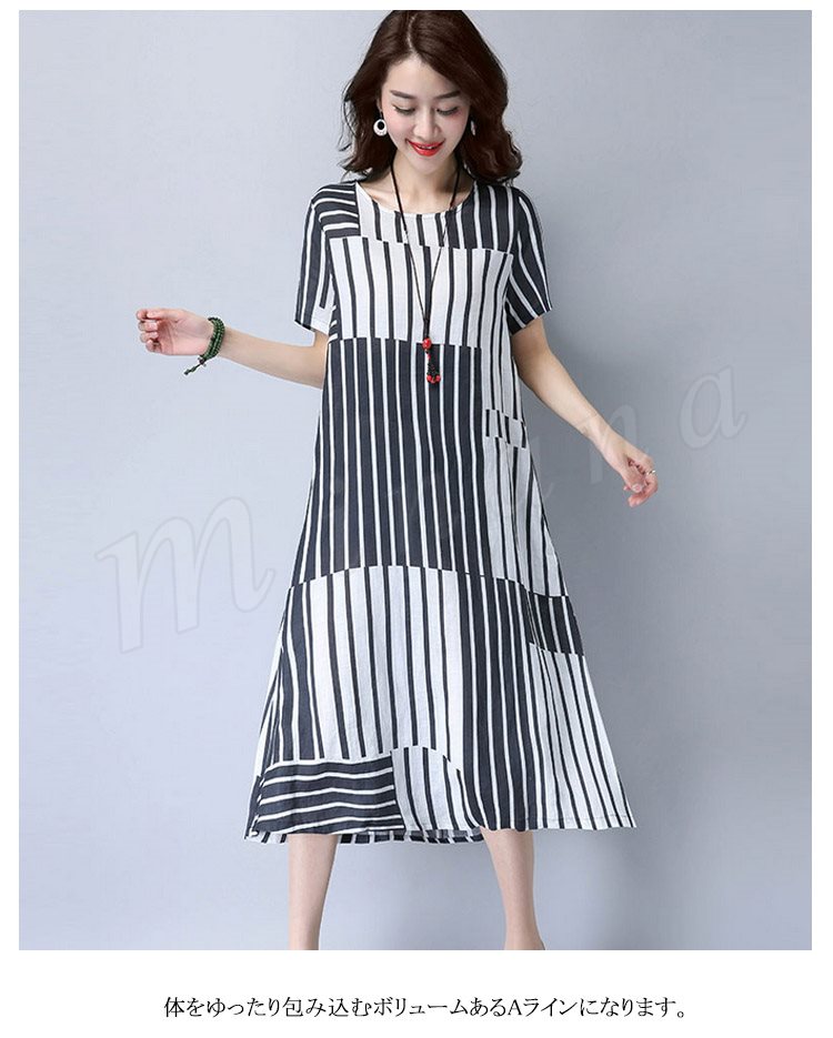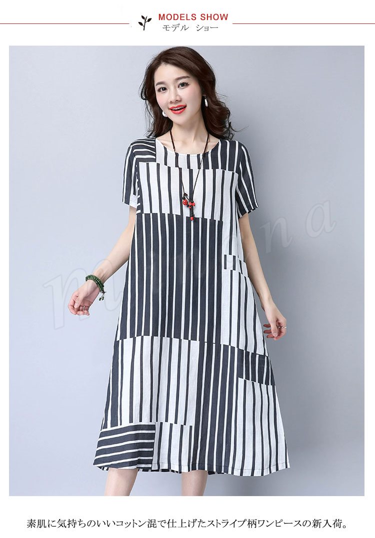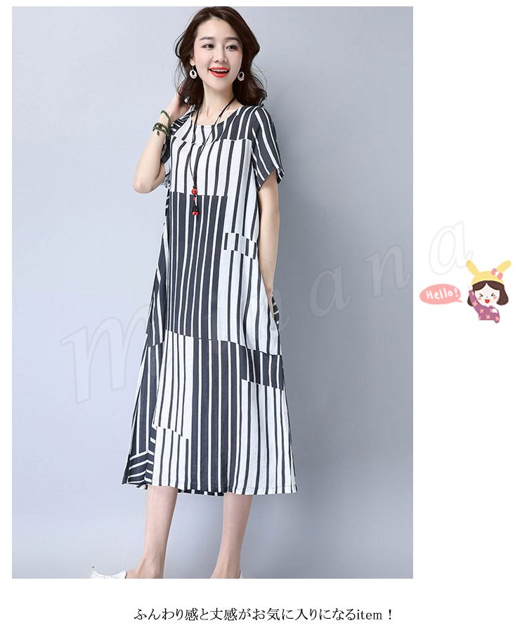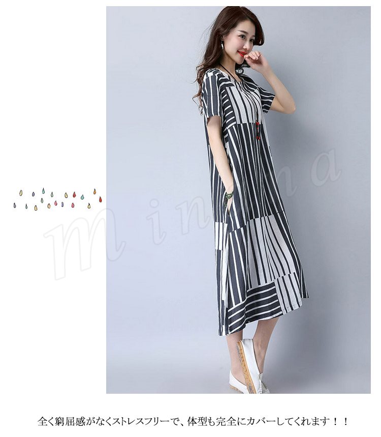 2017夏新作 大きサイズ リネンワンピース ロングワンピース ストライプ柄 綿麻ワンピース 半袖 ワンピース ゆったり ナチュラル 切り替え