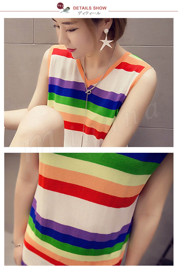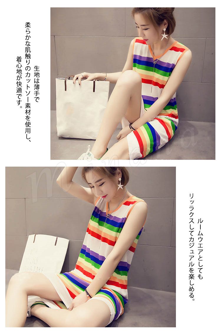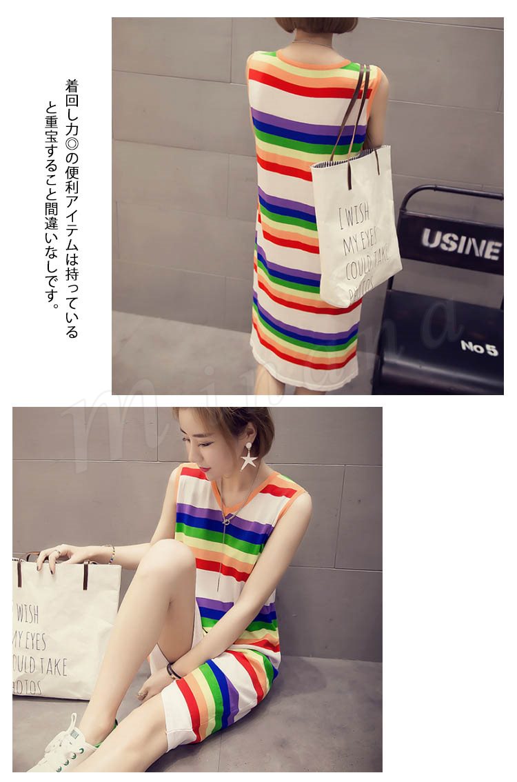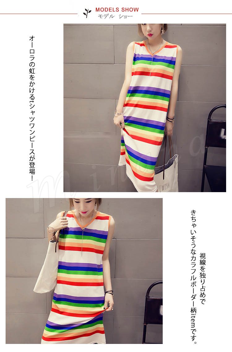 ポップなカラフルボーダーが可愛い♪虹柄 タンクトップ ワンピース ノースリーブワンピース ボーダー ロングワンピース 膝下丈 カラフル 夏 ル