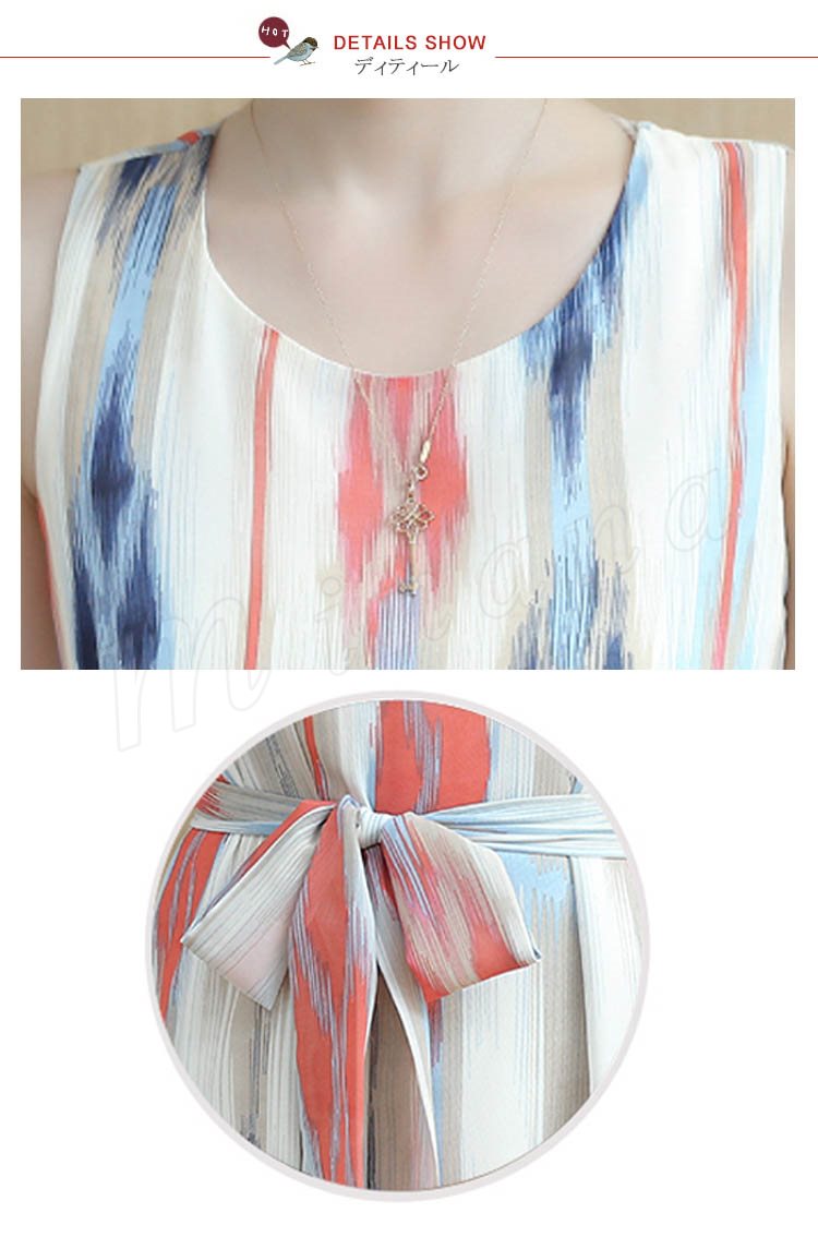 | オシャレなストライプ柄総プリント夏ワンピース登場しました! なかなか見られない存在感のある柄使いと色合いは夏のおしゃれガールにピッタリ! ひんやりとした生地感が気持ちよく、汗も吸ってくれるので、春夏の季節にはピッタリ! 夏らしいノースリーブも爽やかで季節感を演出してくれます。 夏の海旅行のビーチウエアとして大活躍間違いなし。 一枚でさらっと着ても可愛い、夏にぴったりなスタイル決まり♪ | |