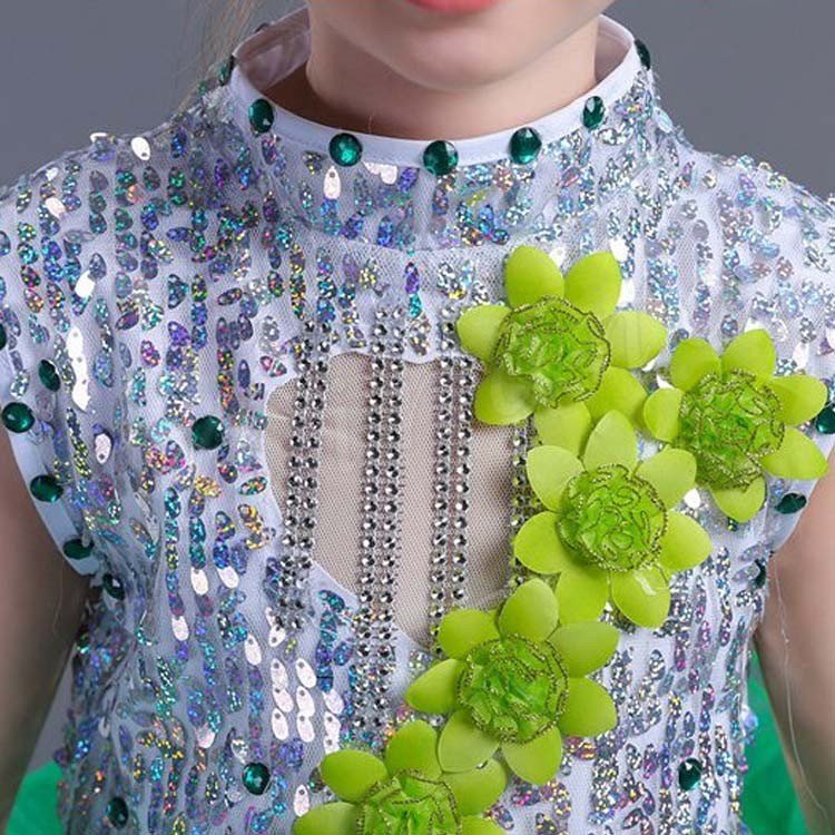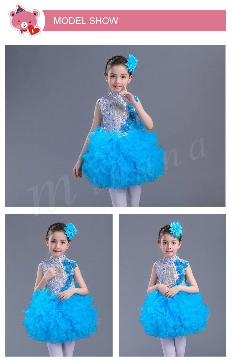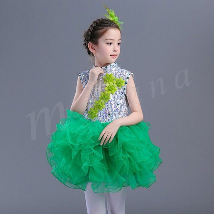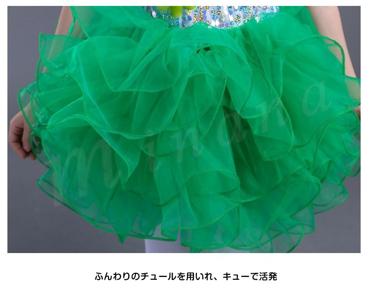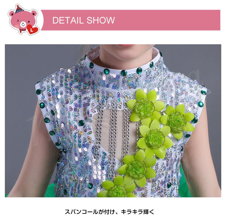 | キラキラ輝いて動感満点のダンスワンピース スパンコールが付けられたトップス、光によって表情が豊かになり 花飾りとネックのビジューが付け、華やかに、さらに顔を立体的に ふんわりとしたディアードスカート、キューで活発満点 ヴィヴィッド色系と素敵なシルエットで、パーティー、出演、ダンスなどにぴったりの一着 | |