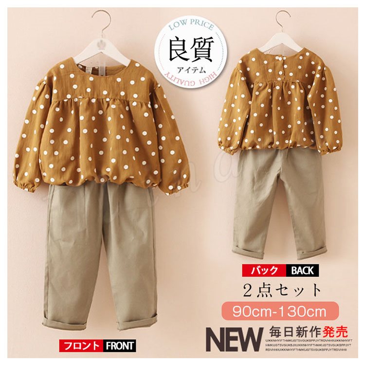 送料無料 水玉柄ブラウス+パンツ 2点セット 女の子 子供 キッズ ジュニア 水玉柄 ブラウス シャツ 長袖 ロングパンツ