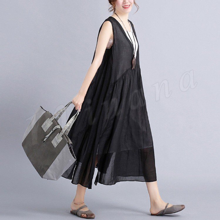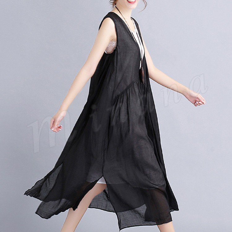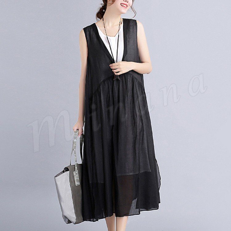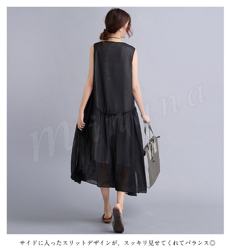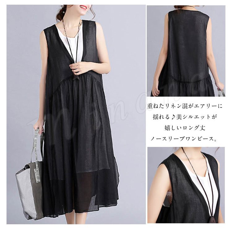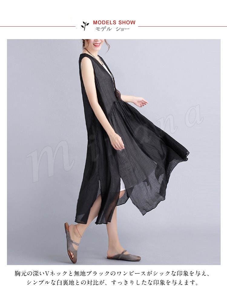 レディース ワンピース ノースリーブ Vネック スリット フェイク2点セット マタニティ フレアワンピ Aライン ロング丈 ブラック フリーサイズ