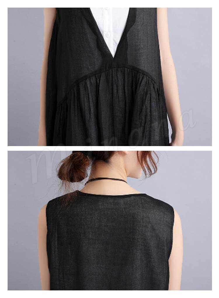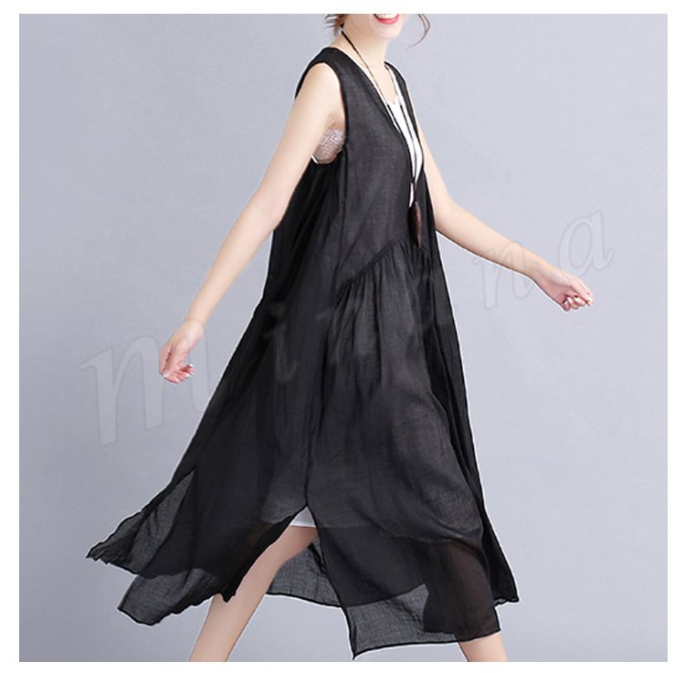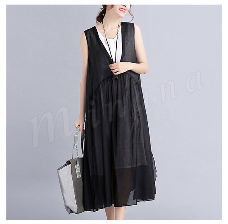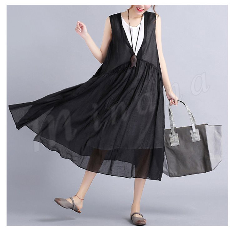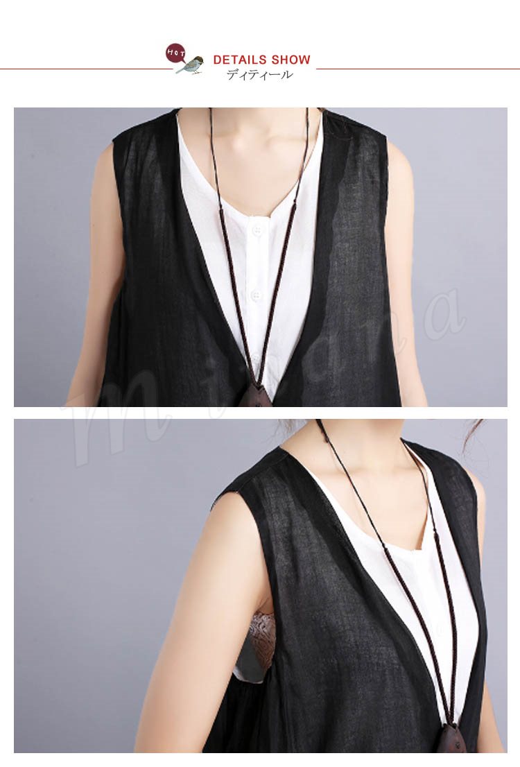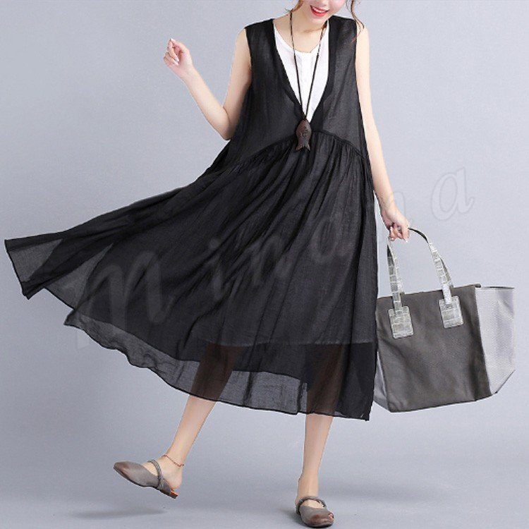 レディース ワンピース ノースリーブ Vネック スリット フェイク2点セット マタニティ フレアワンピ Aライン ロング丈 ブラック フリーサイズ