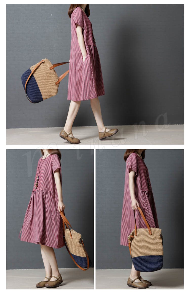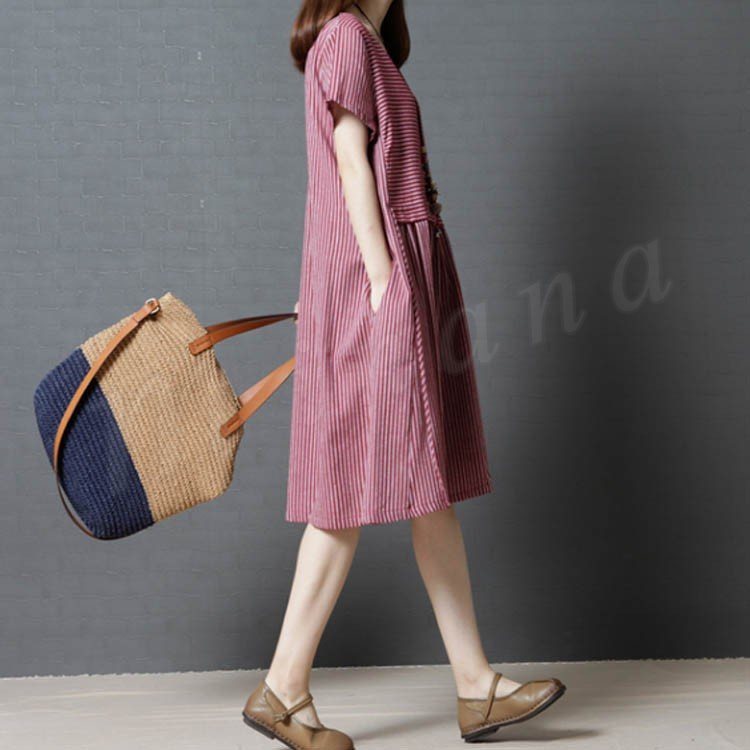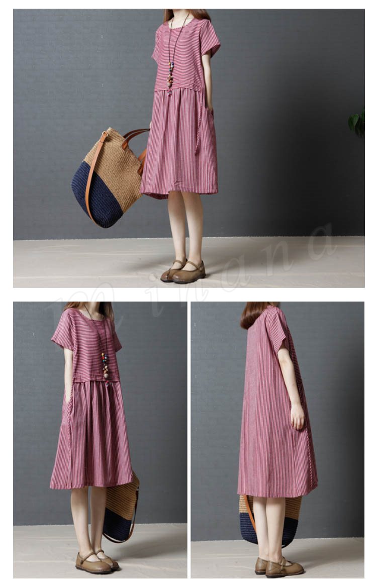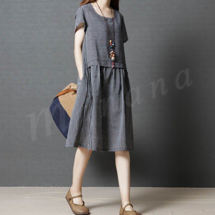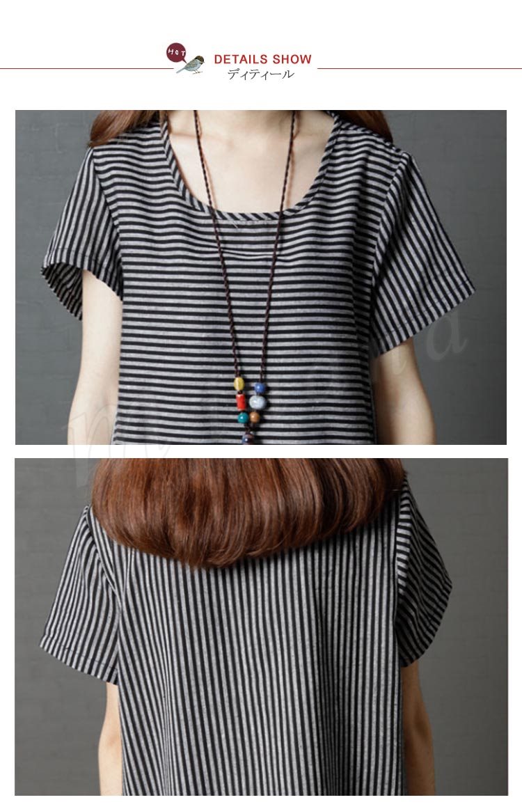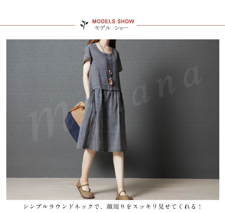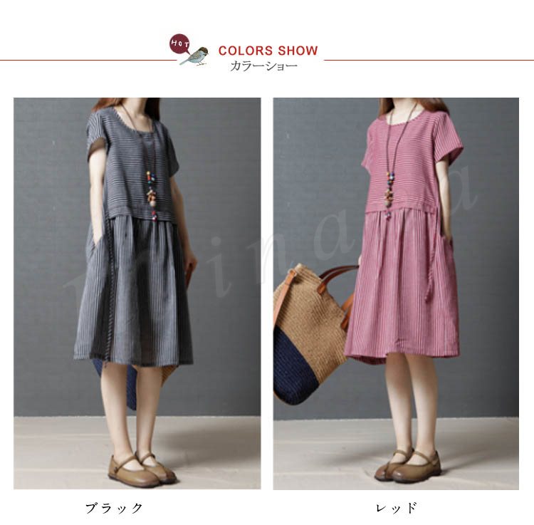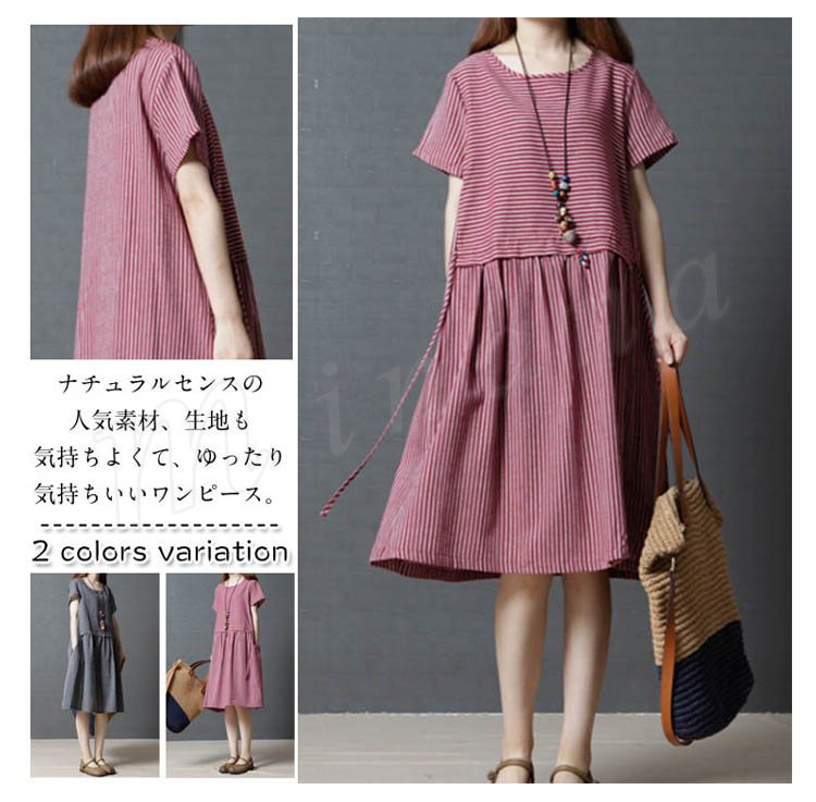 レディース ワンピース チュニック 半袖 Aライン ボーダー 切り替え ストライプ 無地 ゆったり 紐付き シンプル 大きいサイズ 2カラー 4サイズ