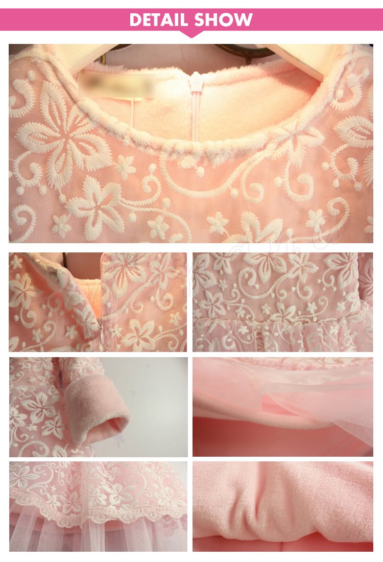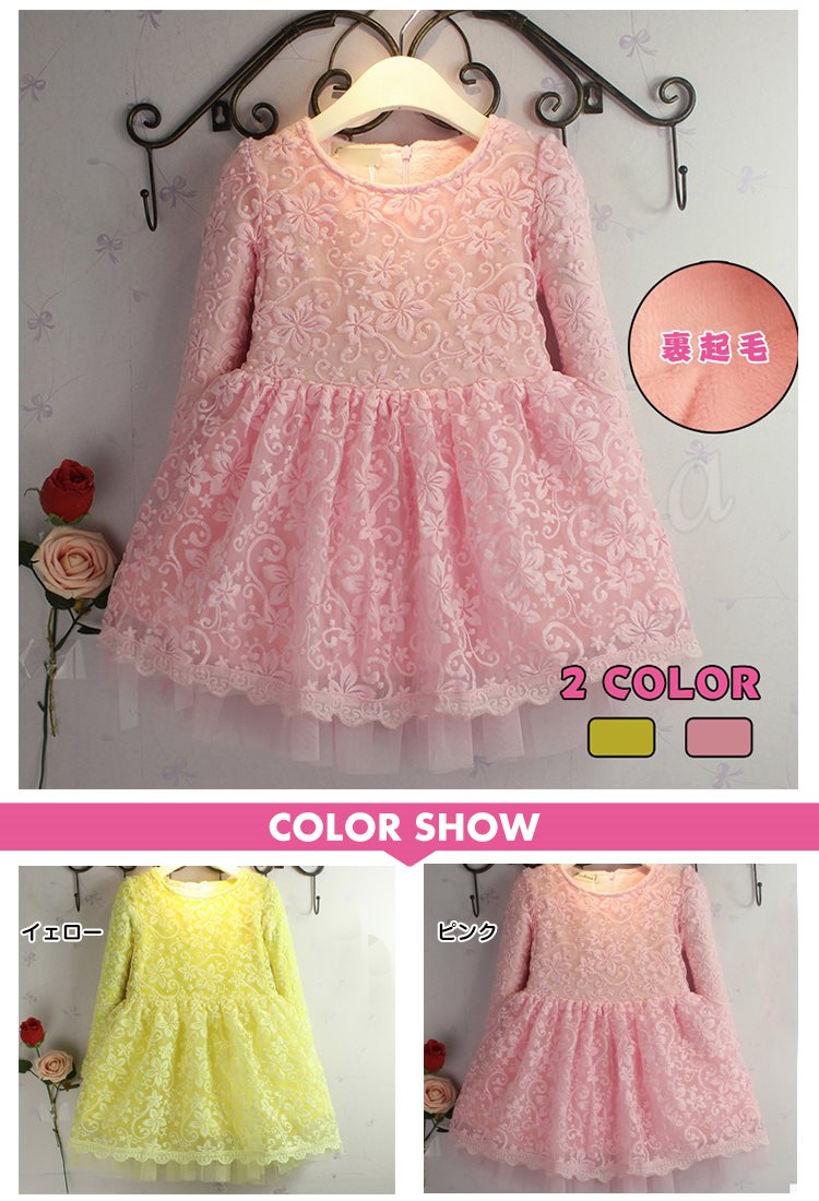 送料無料子供ワンピース 総レース 花柄 チュチュワンピ ハーフ丈 膝丈 裏起毛 厚地 姫様 クルーネック Aライン
