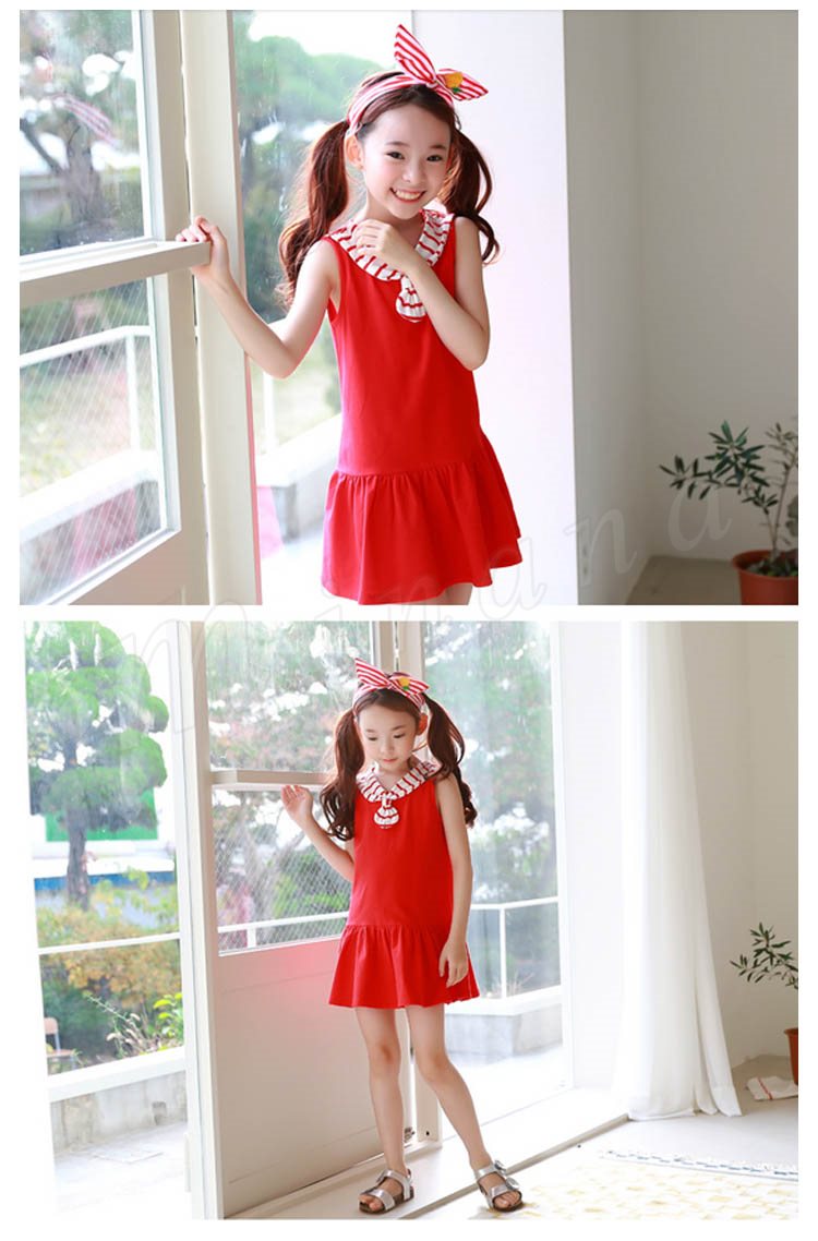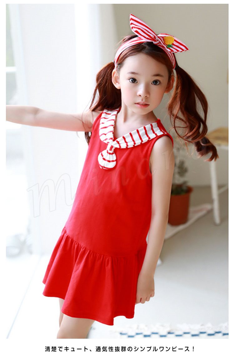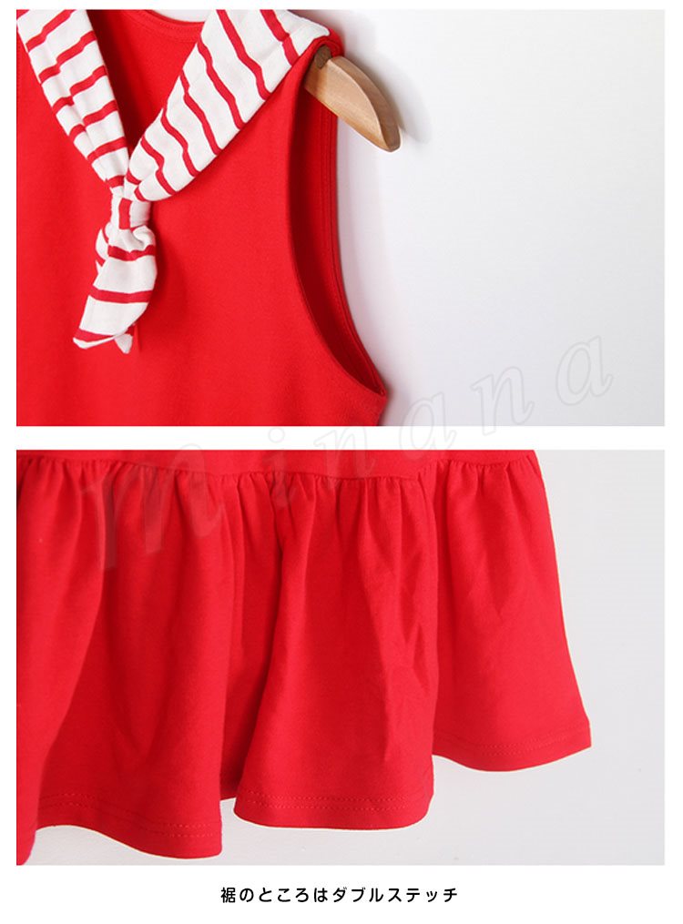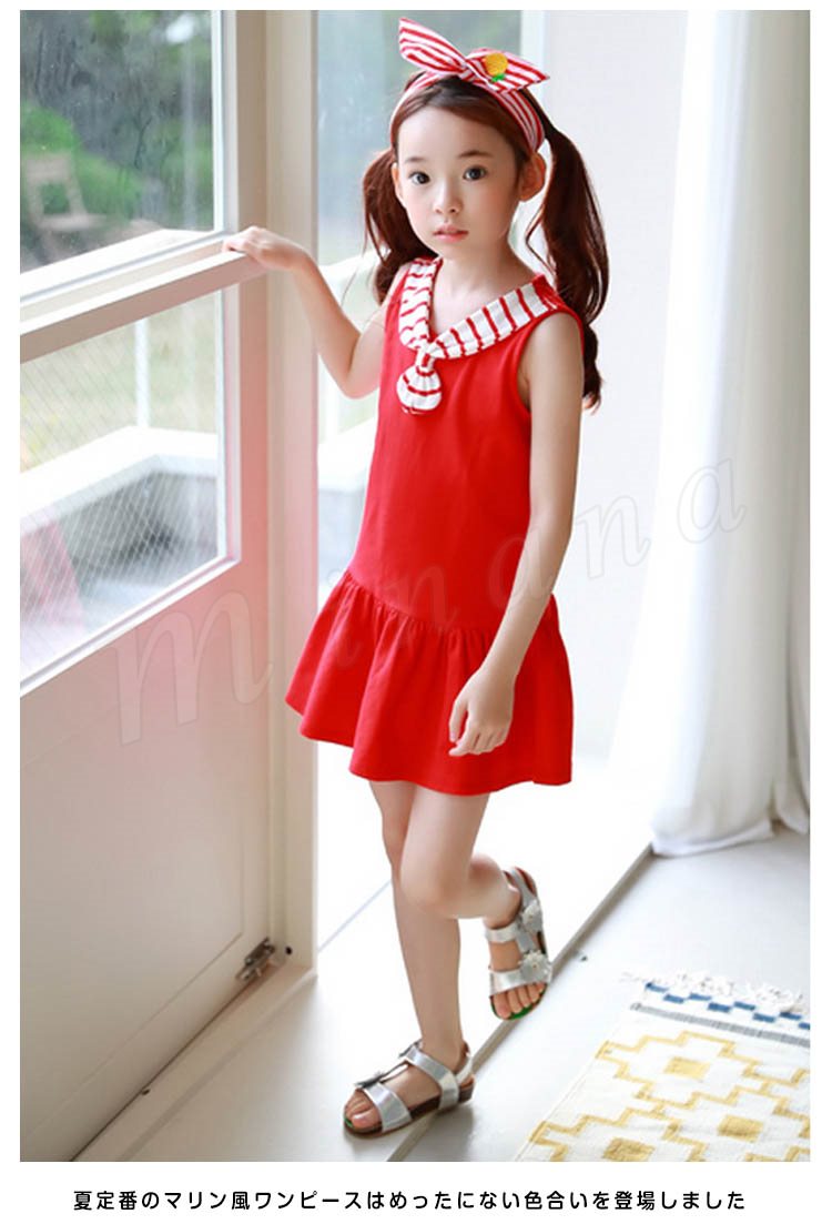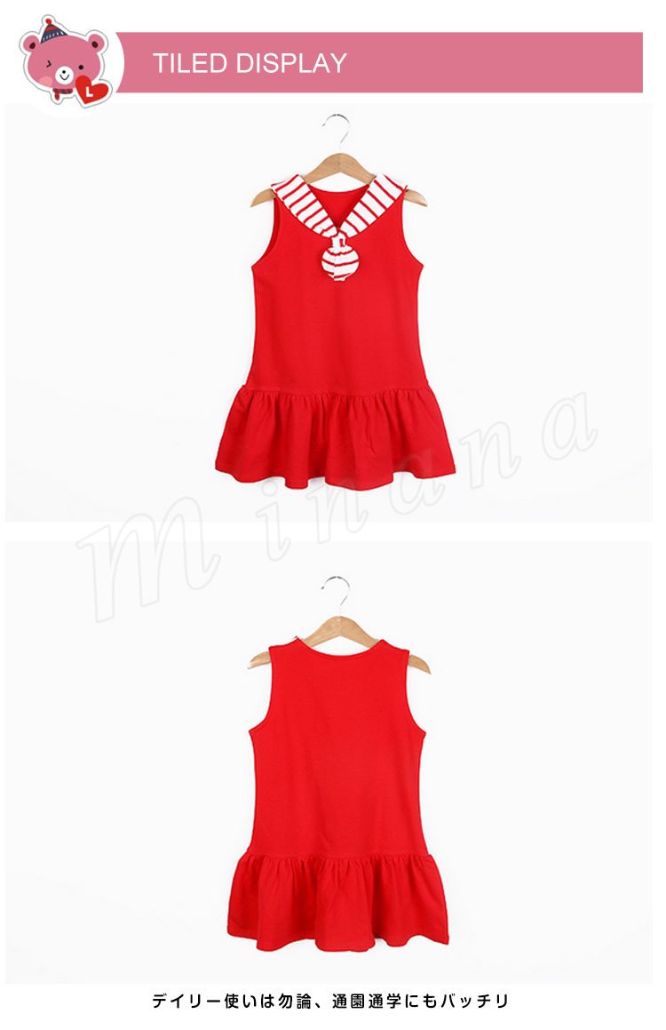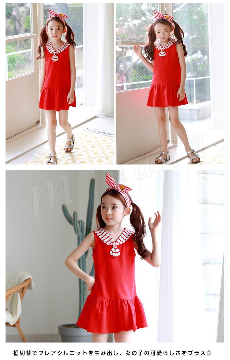 マリン風ワンピース タンクトップワンピース 女の子 子供 セーラー襟 ノースリーブ Aライン フレア 切替 ワンピース ショートワンピース ミ