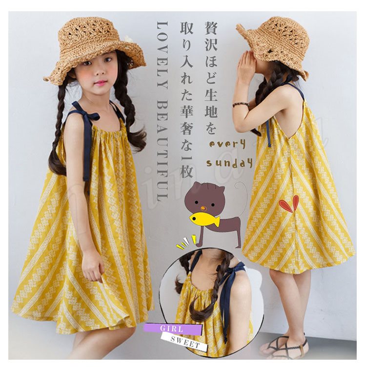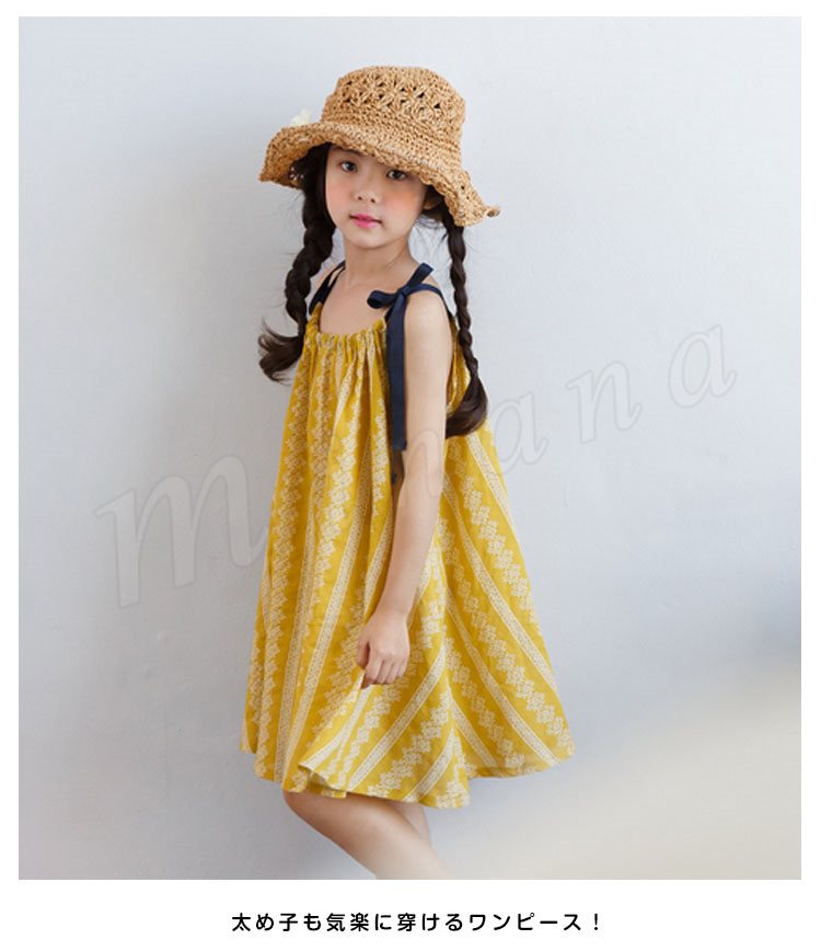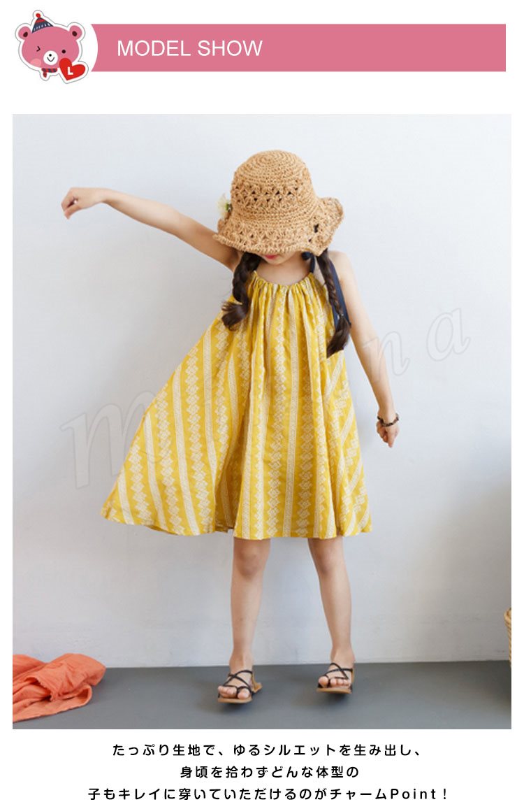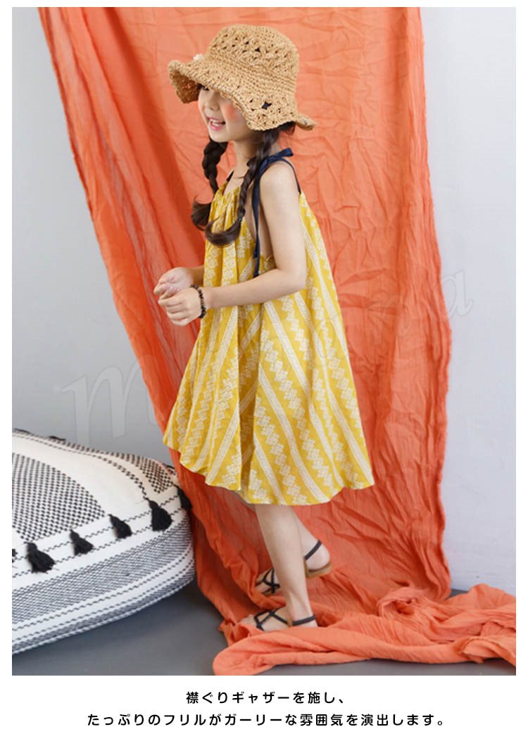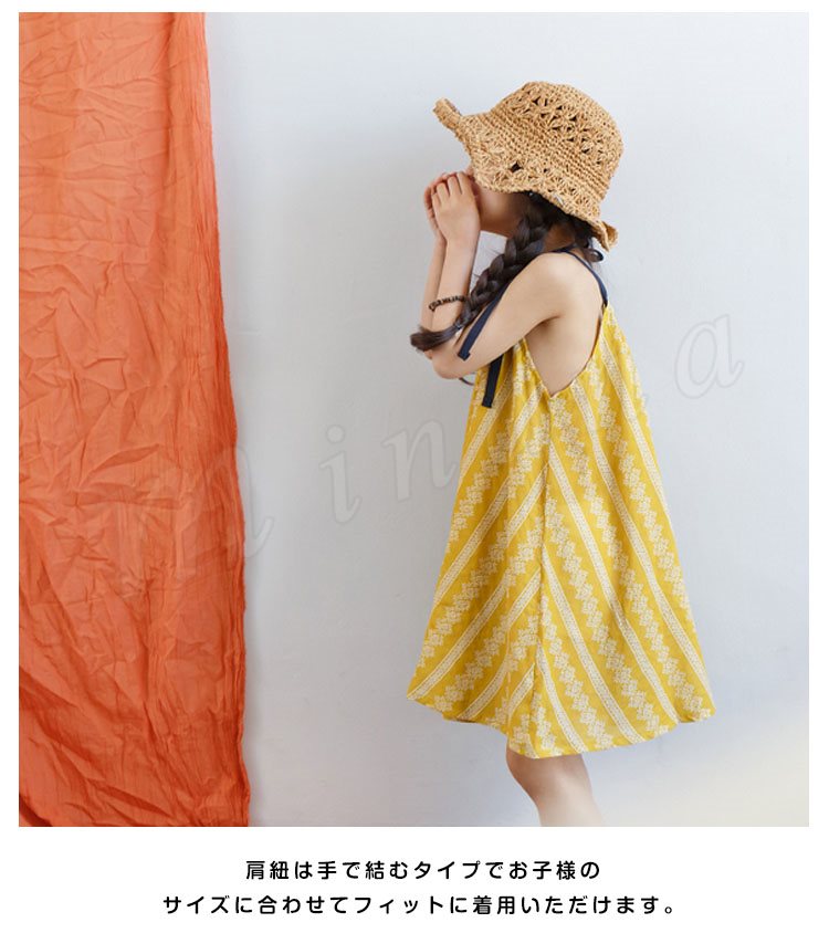 | 贅沢ほど生地を取り入れた華奢な1枚。 太め子も気楽に穿けるワンピース! たっぷり生地で、ゆるシルエットを生み出し、身頃を拾わずどんな体型の子もキレイに穿いていただけるのがチャームPoint! 襟ぐりギャザーを施し、たっぷりのフリルがガーリーな雰囲気を演出します。 肩紐は手で結むタイプでお子様のサイズに合わせてフィットに着用いただけます。 普段着はもちろん、お水遊びなど場合、水着の上にプラスしても可愛い。 | |