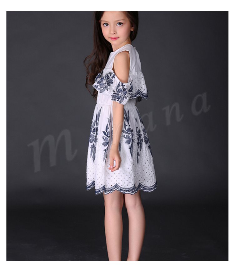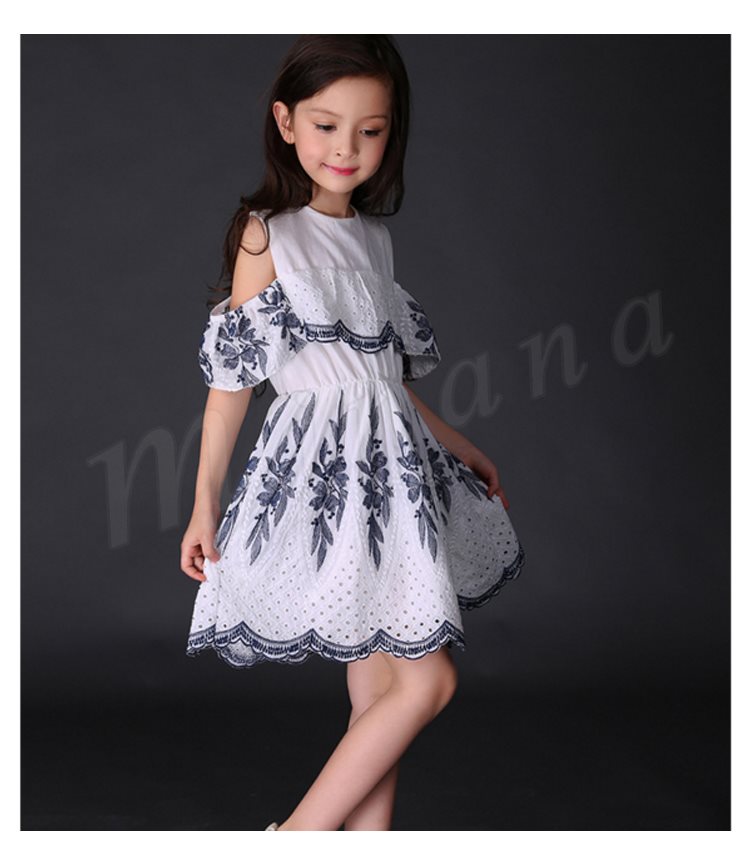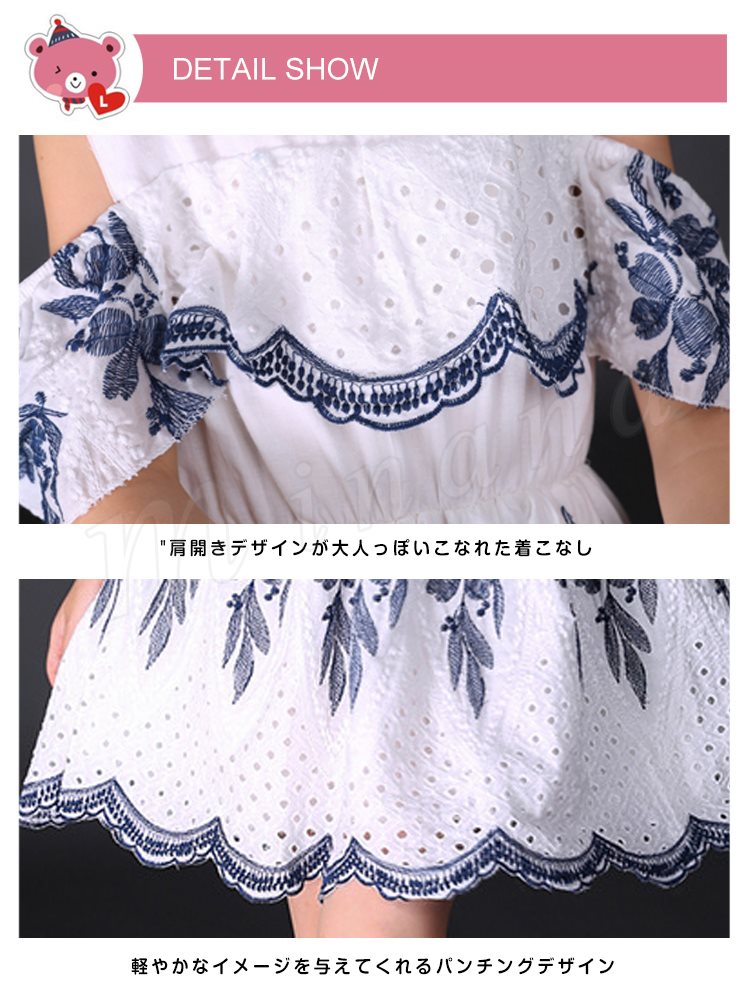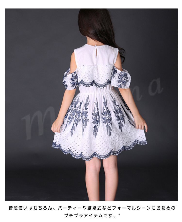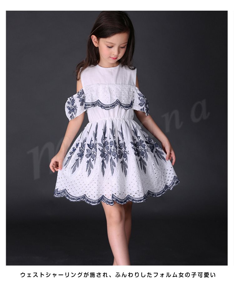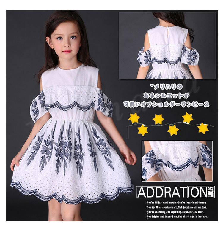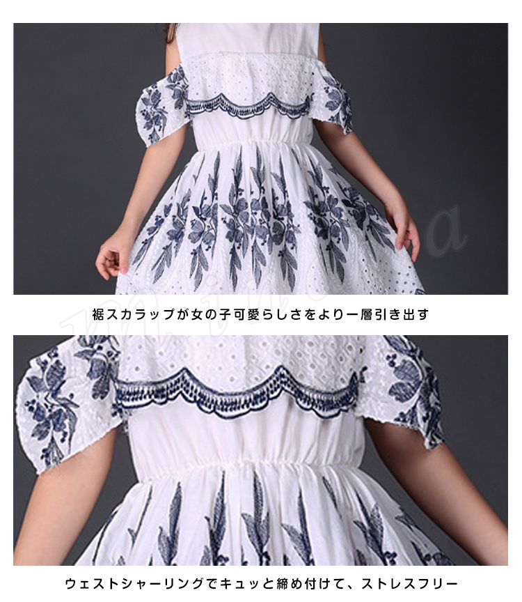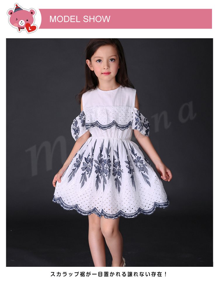オフショルダーワンピース 女の子 キッズ 花柄 お姫様 レース パンチング スカラップ フリル フレア ワンピース 半袖 肩開き 肩見せ ドレ