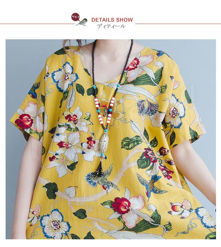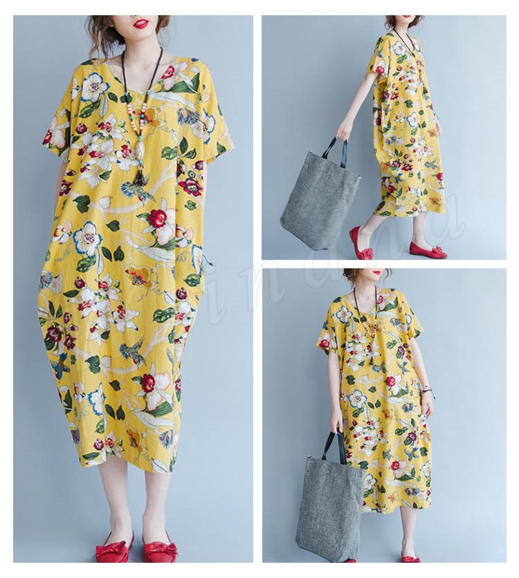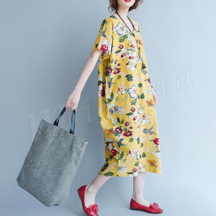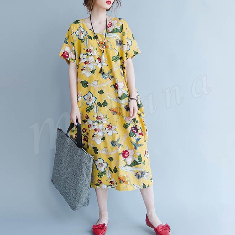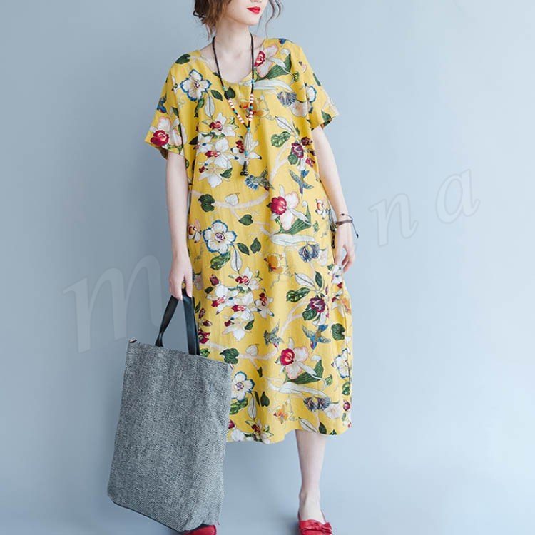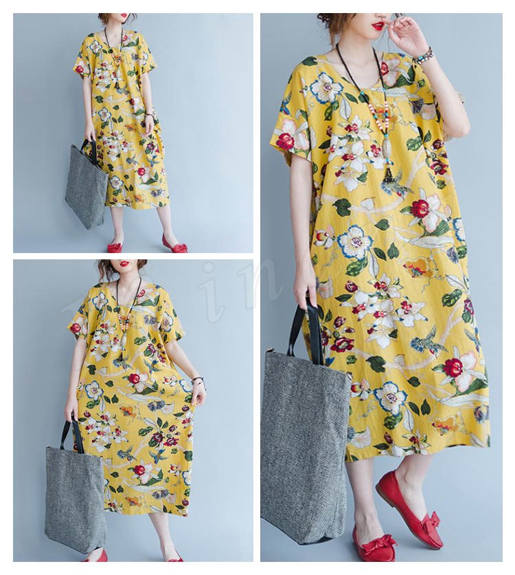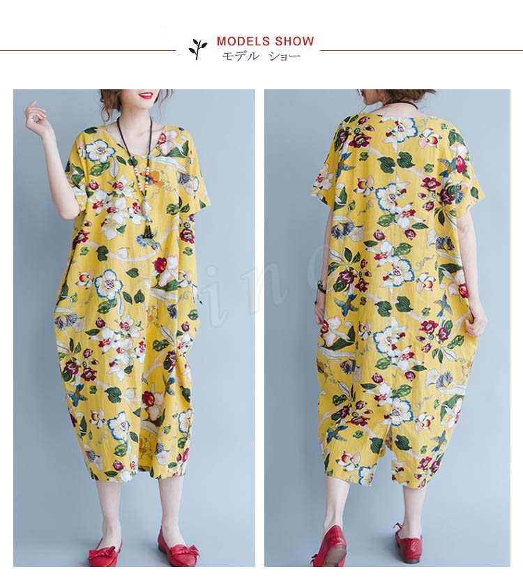 マキシワンピース 半袖 リゾート ワンピース レディース 花柄 ワンピース Aライン 大きいサイズ ロング リネン ワンピース 2018春夏新作