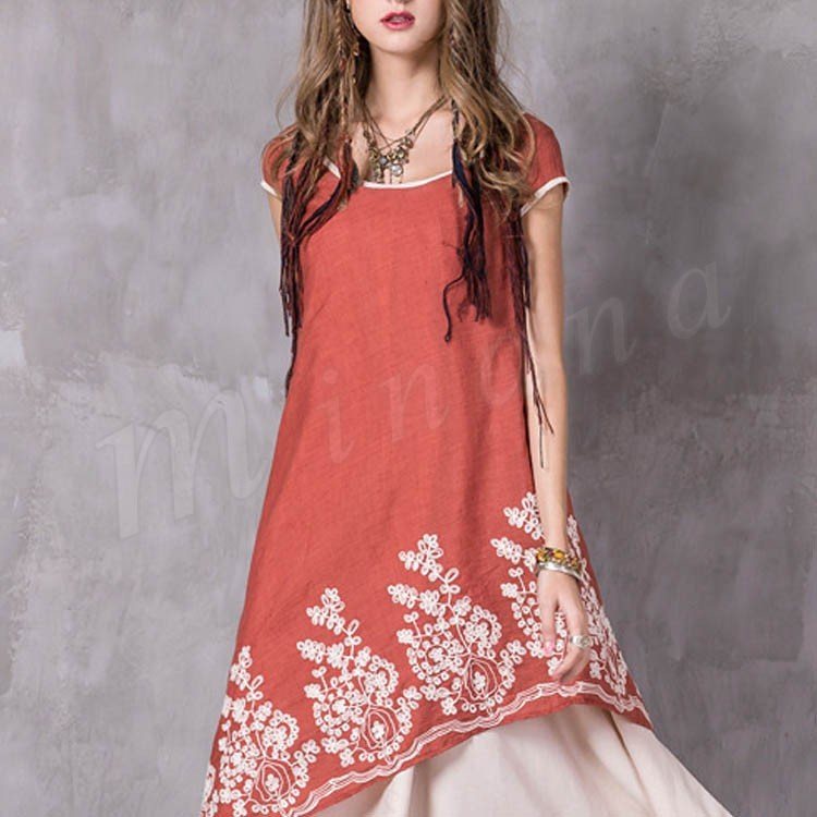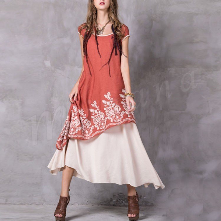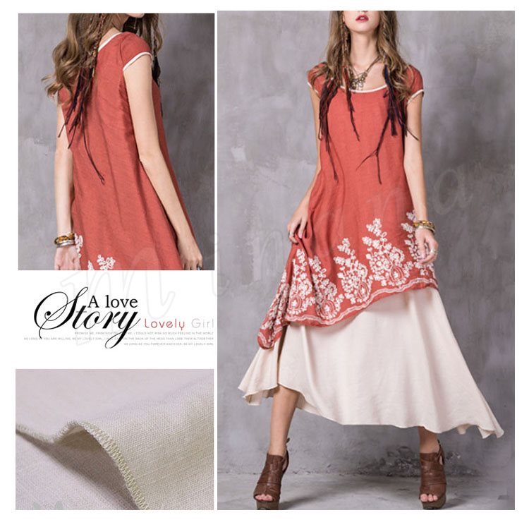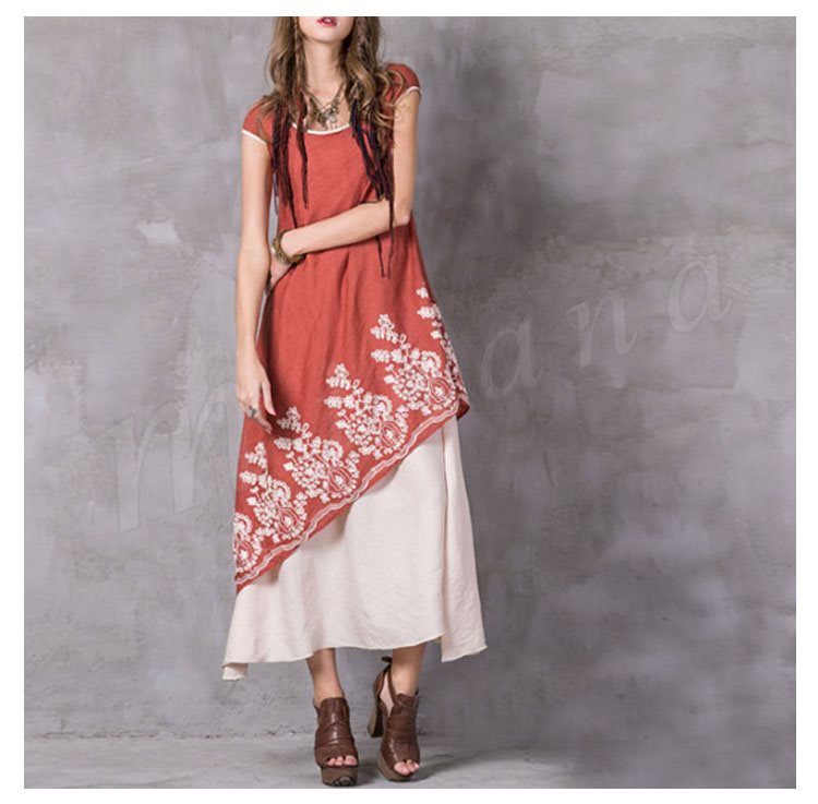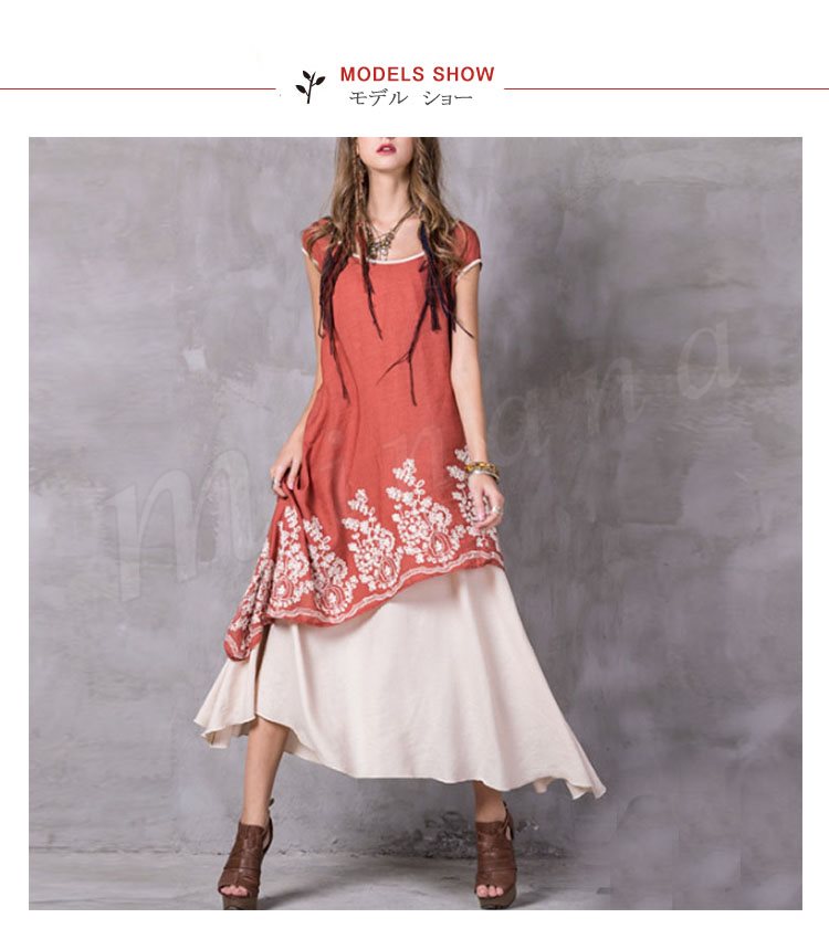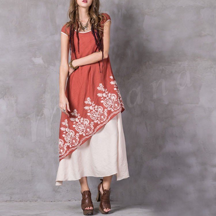 オリジナルデザイン アシンメトリー マキシ丈 ワンピース 綿麻素材 刺繍 レイヤード風 ロング丈ワンピ 半袖 民族風 ラウンドネック