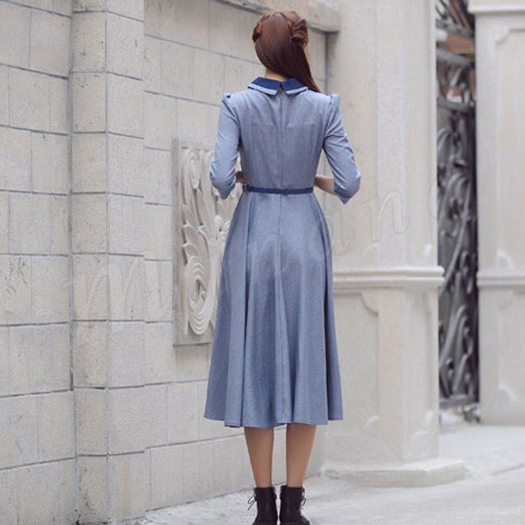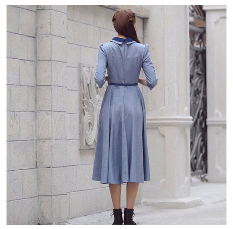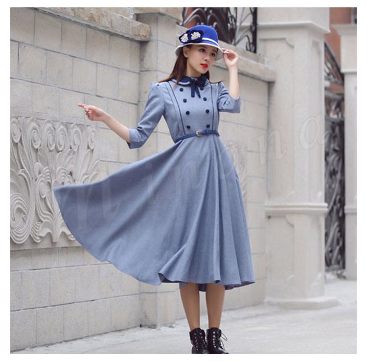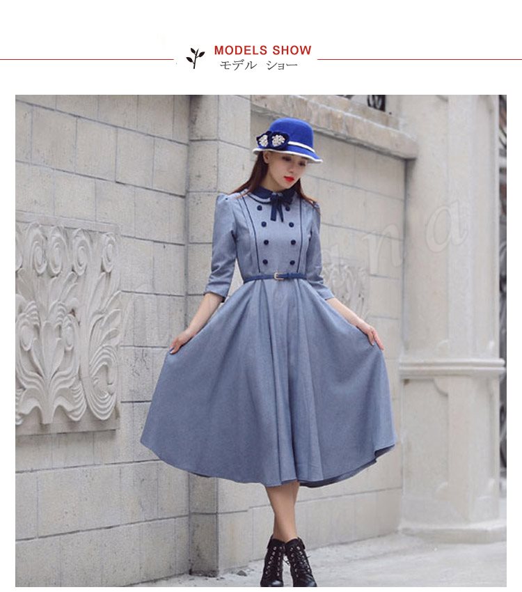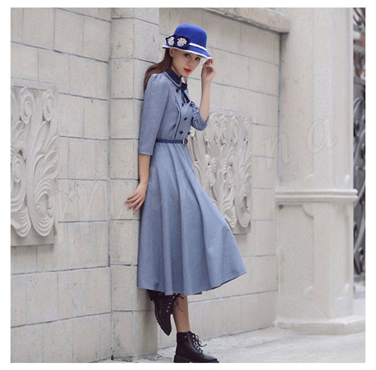 ワンピース 襟付き コットン レディース ネックリボン 七分袖 フレアスカート ロング丈 レトロ クラシカル カレッジ風 エレガント 春秋コーデ 春