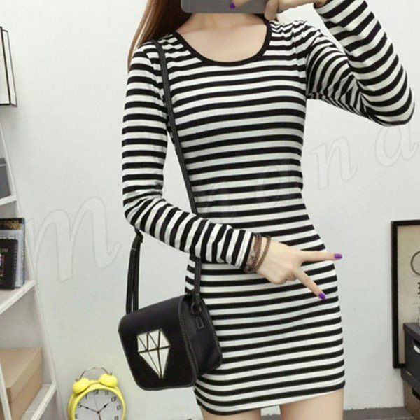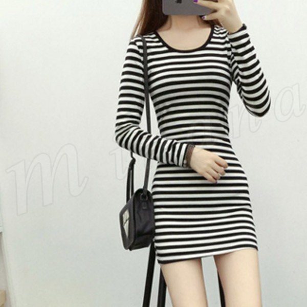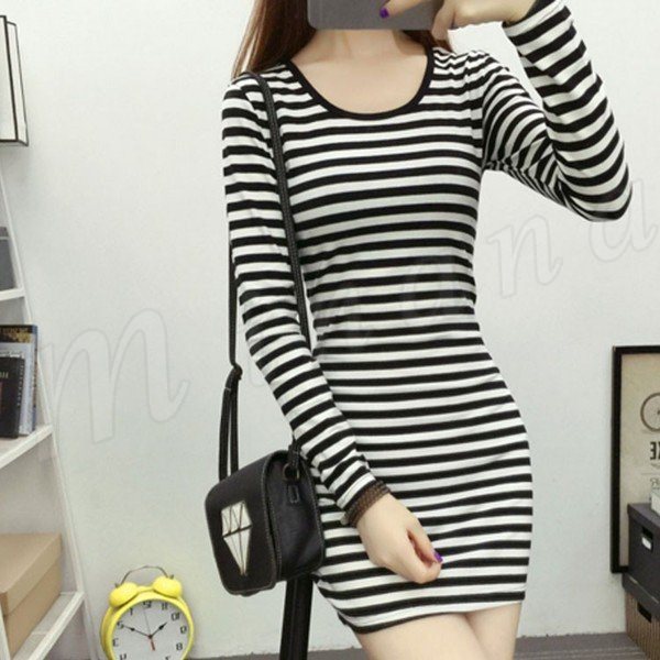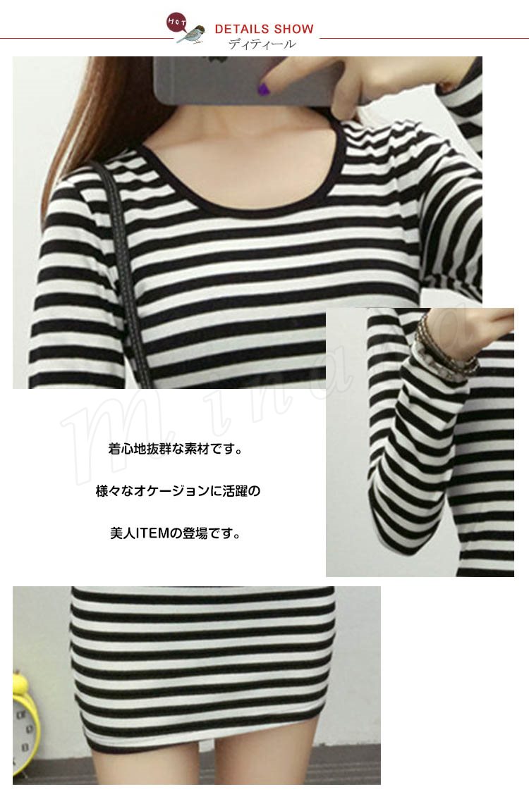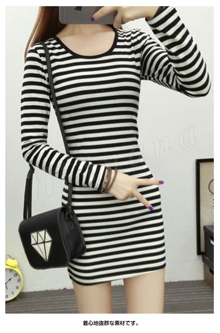 ボーダー柄 ワンピース美ライン長袖ブラック