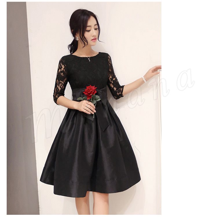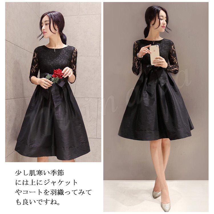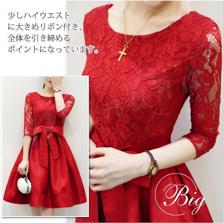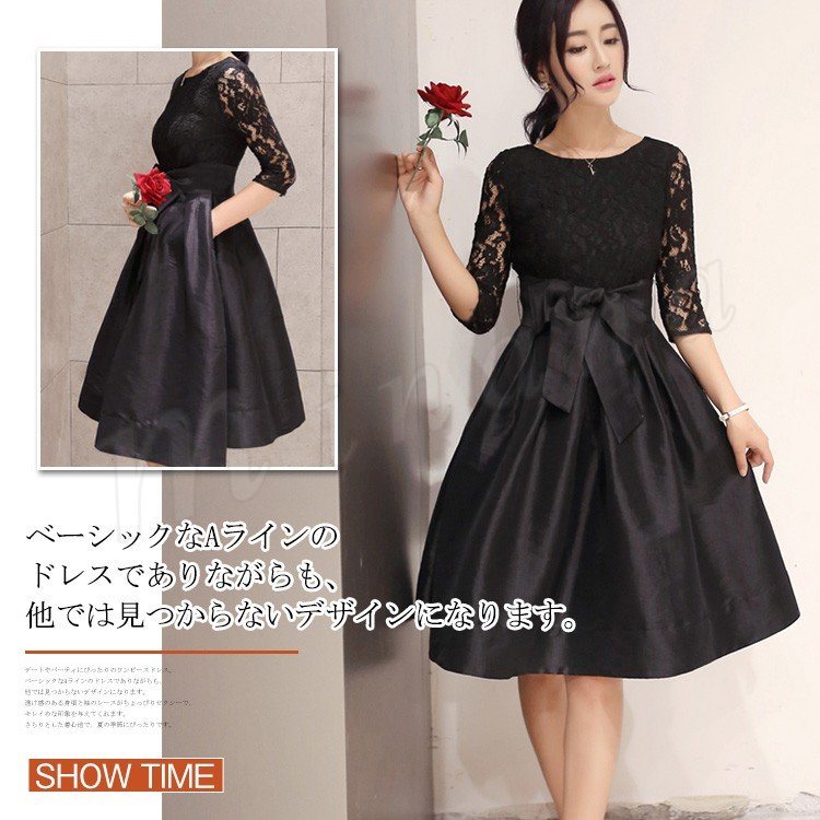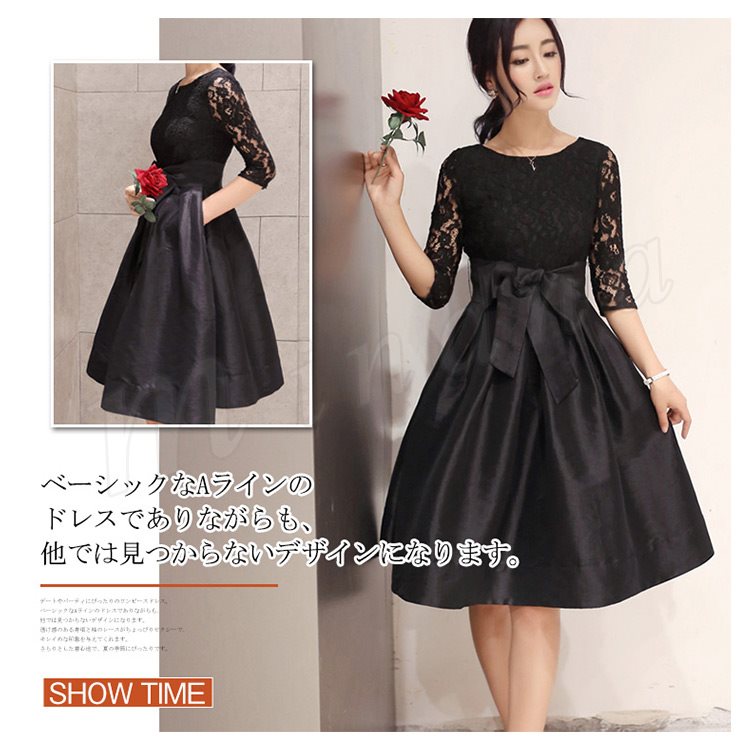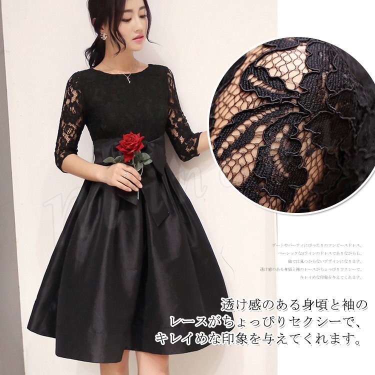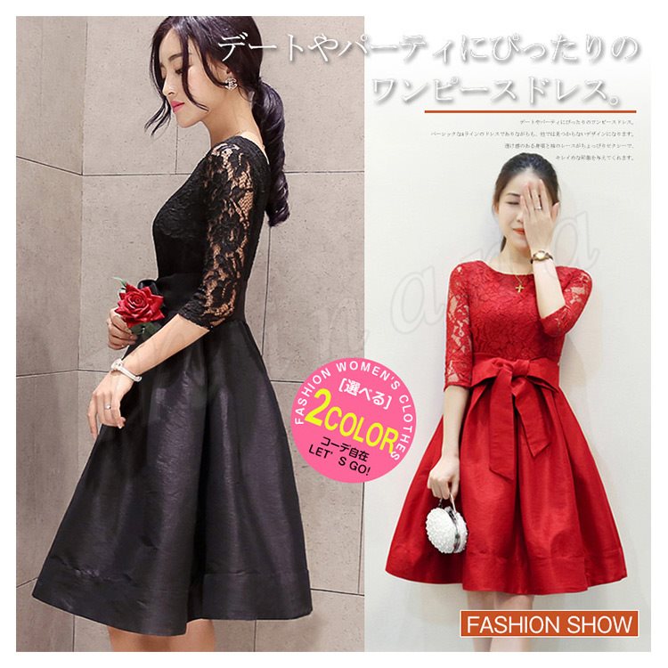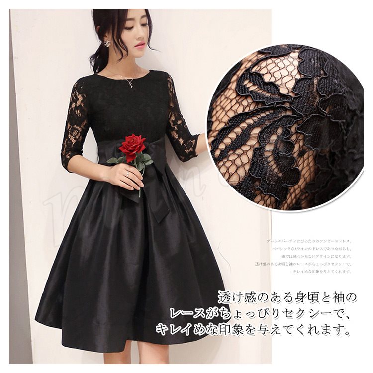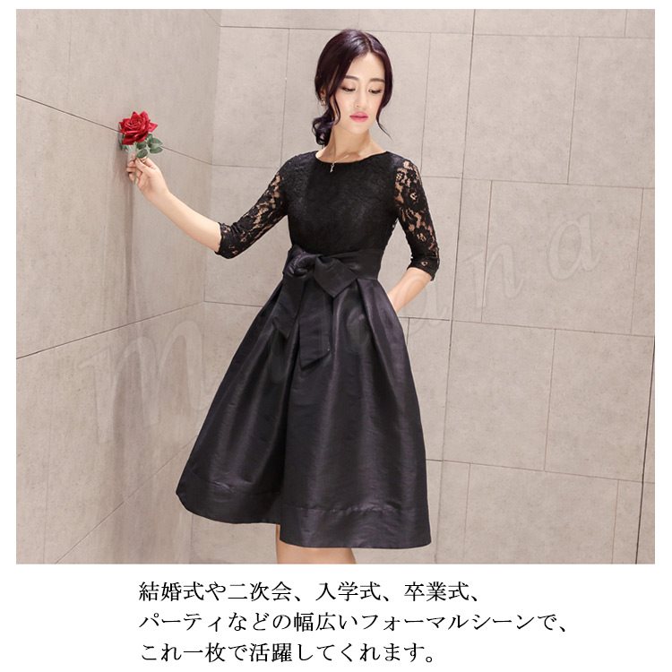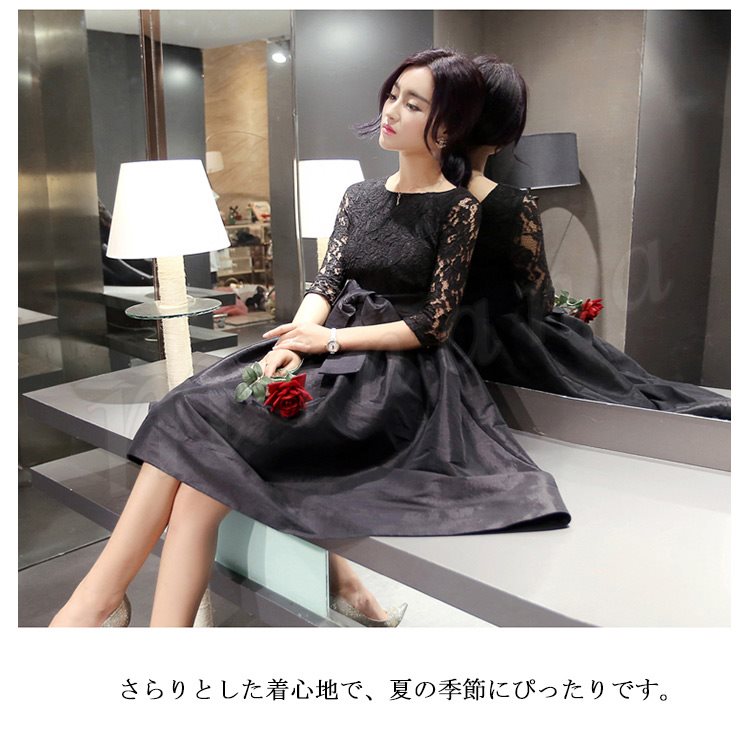ドレス フォーマルドレス ワンピース レース Aライン ワンピ ウエストリボン ひざ丈 半袖 五分袖 フォーマル お呼ばれ パーティー 結婚式