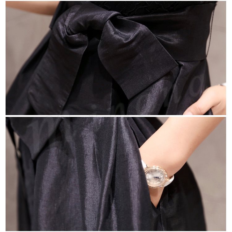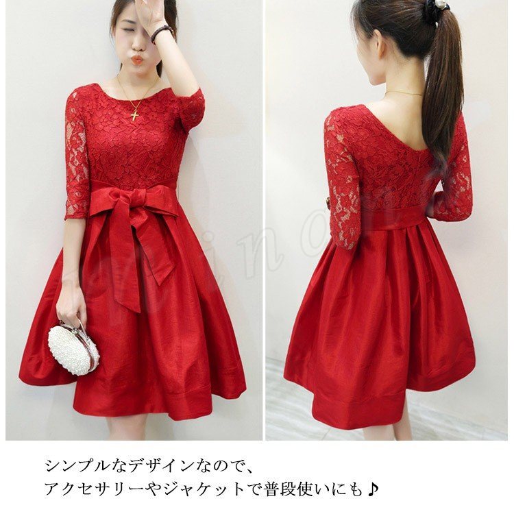 | デートやパーティにぴったりのワンピースドレス。 ベーシックなAラインのドレスでありながらも、他では見つからないデザインになります。 透け感のある身頃と袖のレースがちょっぴりセクシーで、キレイめな印象を与えてくれます。 少しハイウエストに大きめリボン付き、全体を引き締めるポイントになっています。 シンプルなデザインなので、アクセサリーやジャケットで普段使いにも♪ さらりとした着心地で、夏の季節にぴったりです。 少し肌寒い季節には上にジャケットやコートを羽織ってみても良いですね。 結婚式や二次会、入学式、卒業式、パーティなどの幅広いフォーマルシーンで、これ一枚で活躍してくれます。 | |