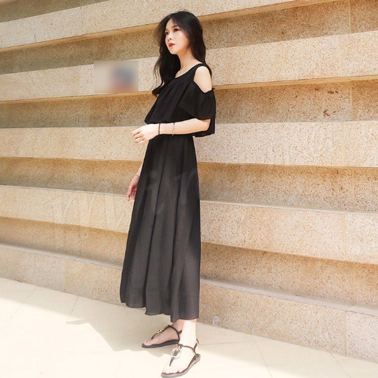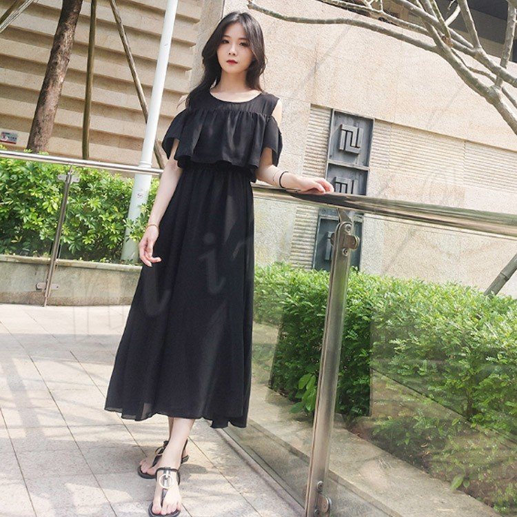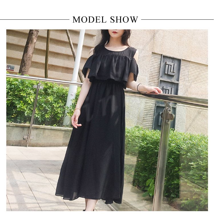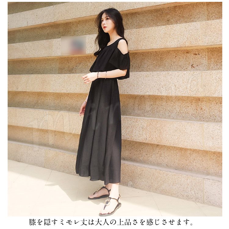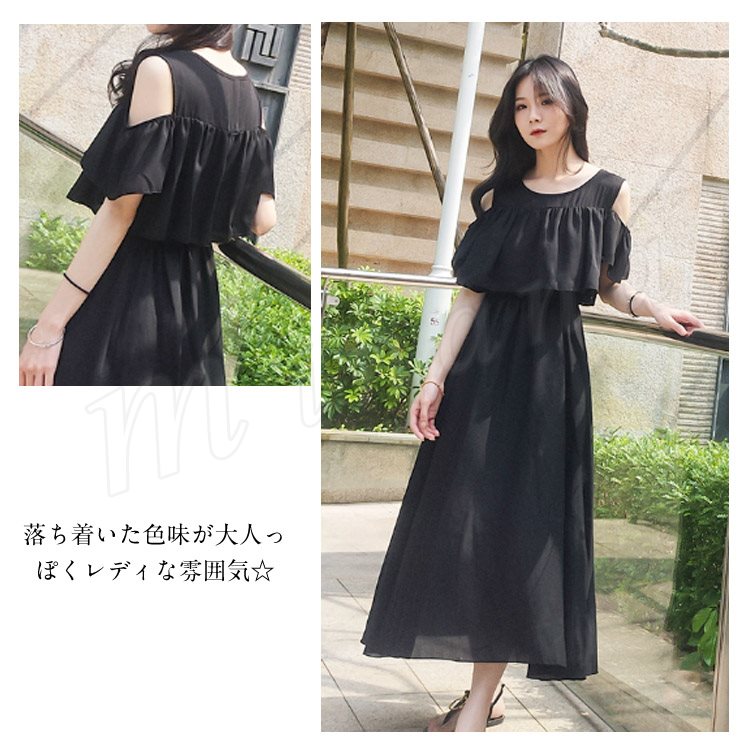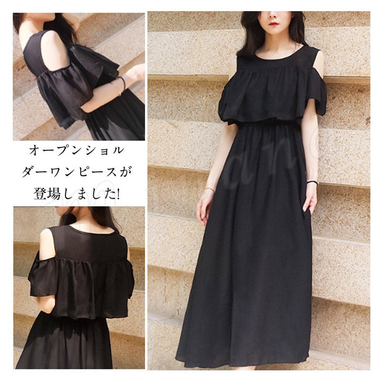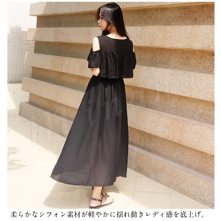 肩見せ ワンピース ロング丈 ミモレ丈 オープンショルダー シフォンワンピース 半袖 ロングワンピース シフォン フレアワンピース レディース