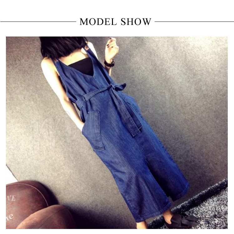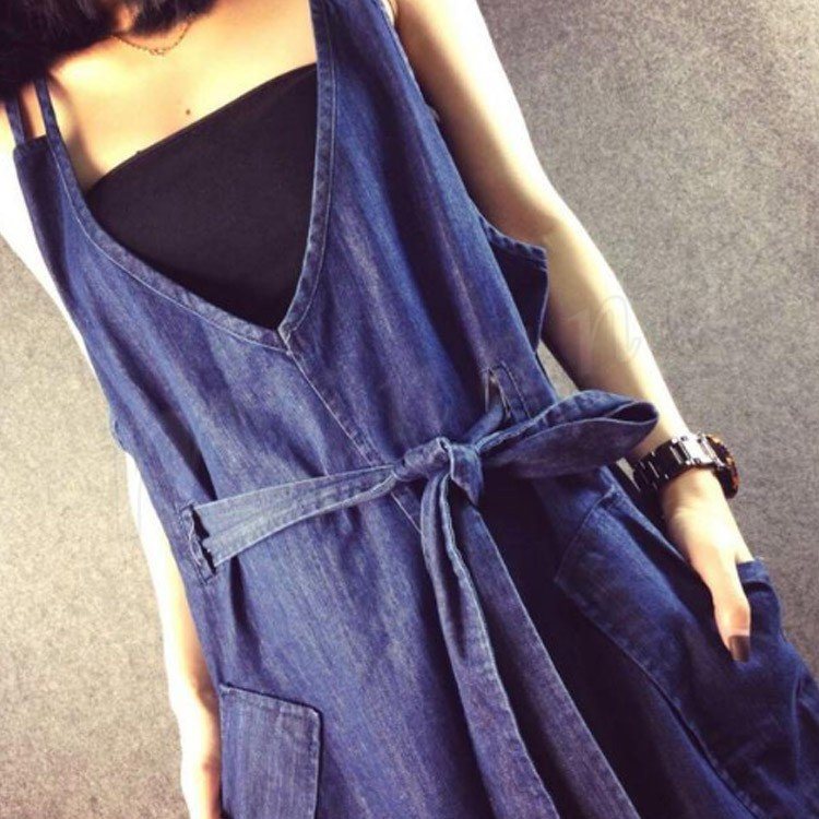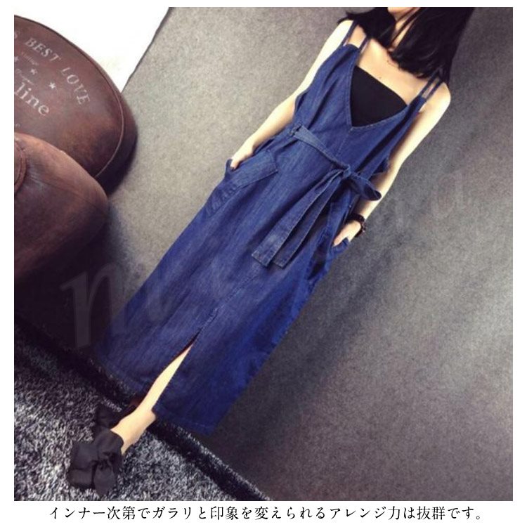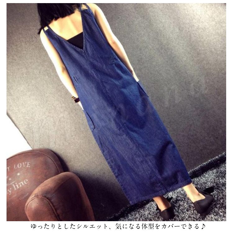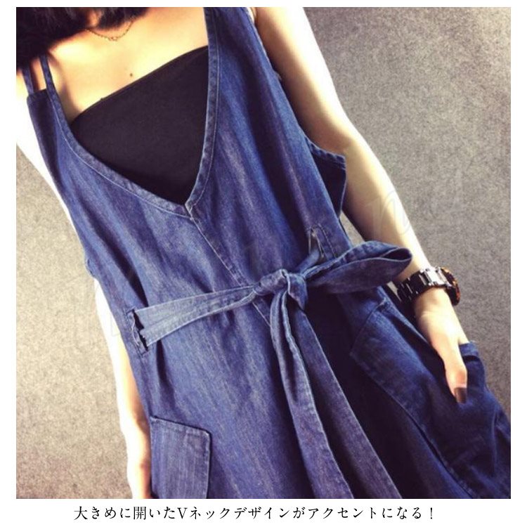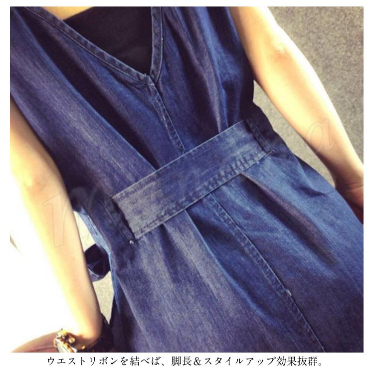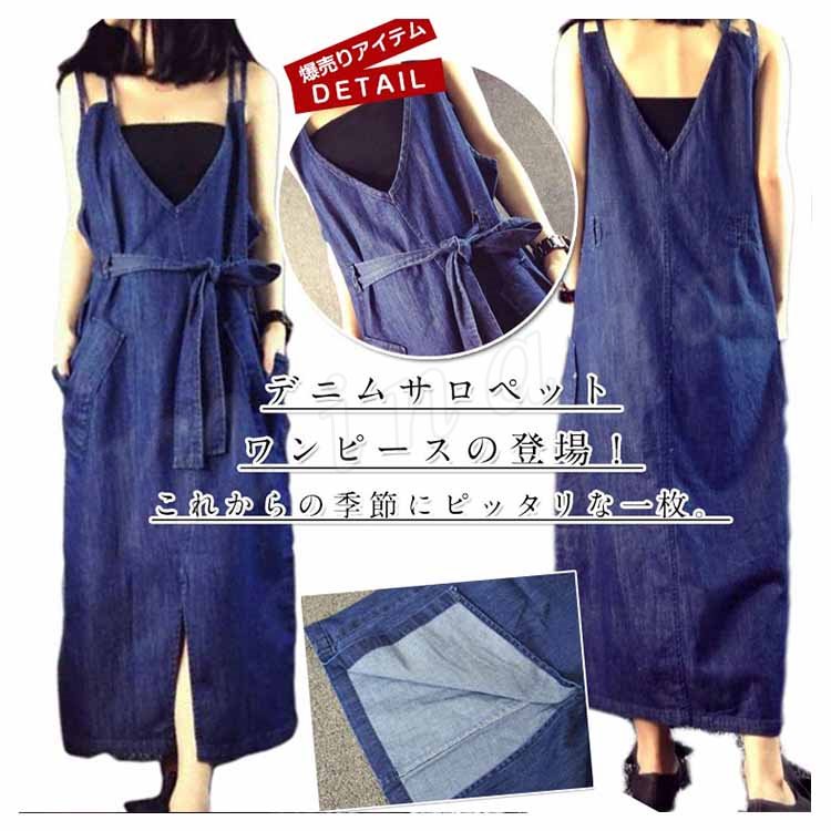 デニム ワンピース マキシ丈 デニム サロペットワンピース サロペット オールインワン ロング丈 ウエストベルト付き オーバーオール レディース