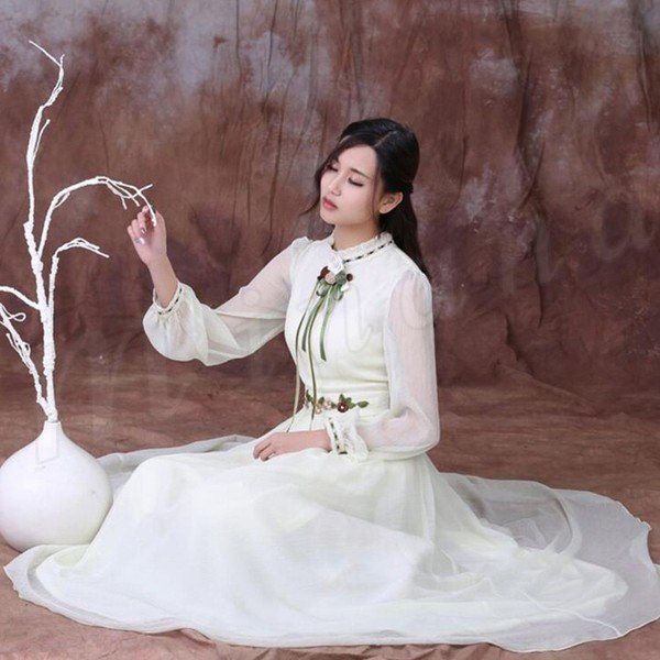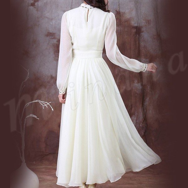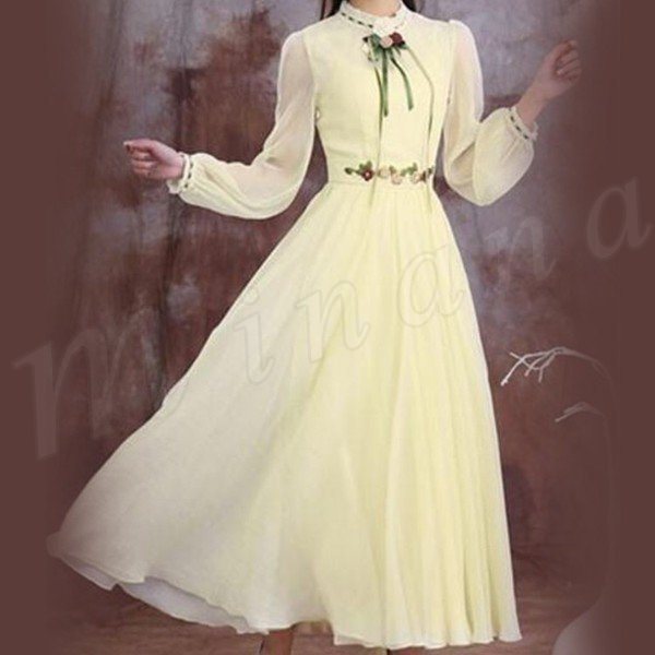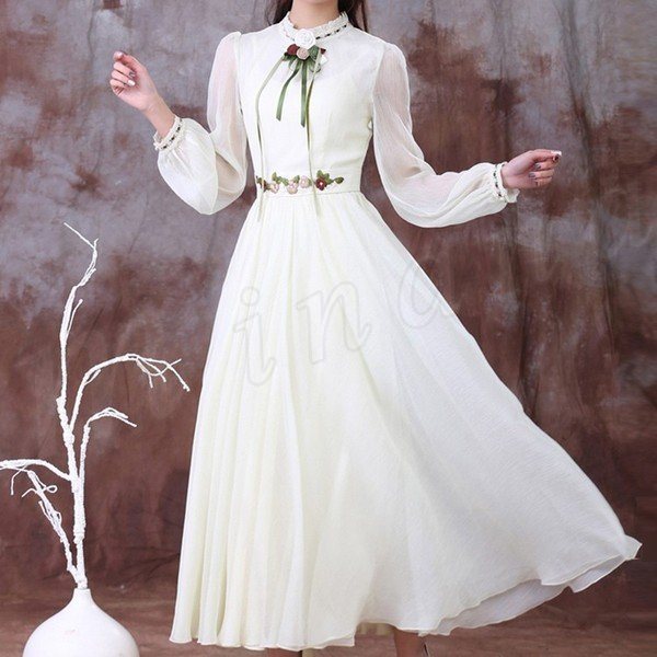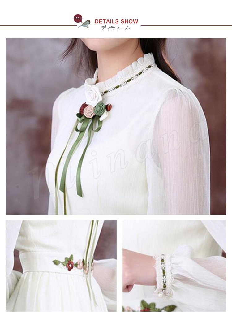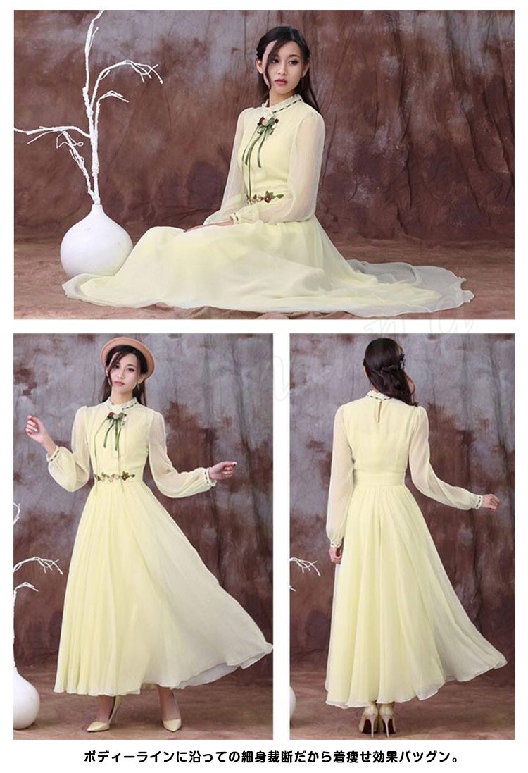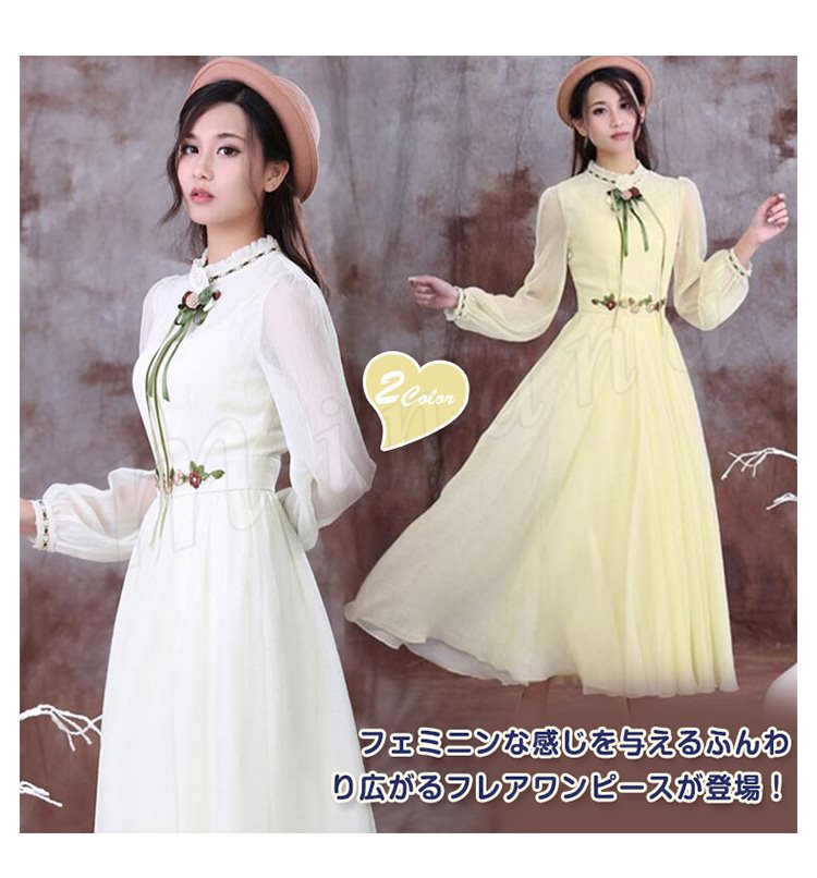 ロングフレアワンピースフリル衿シフォンワンピウエスト花柄刺繍復古系ワンピースヴィンテージ風ワンピース長袖/半袖2タイプ