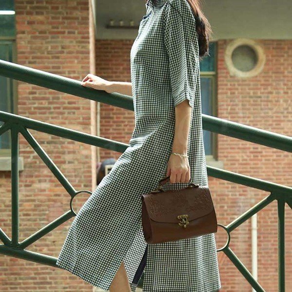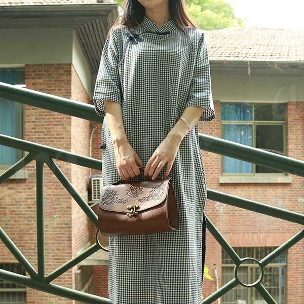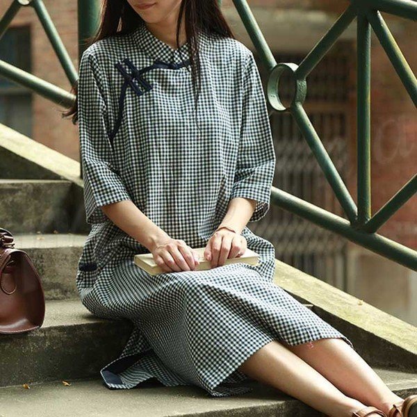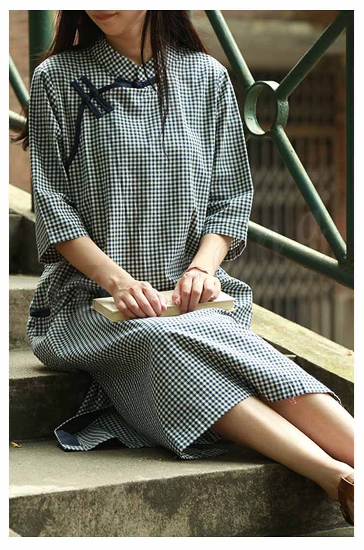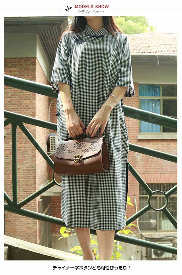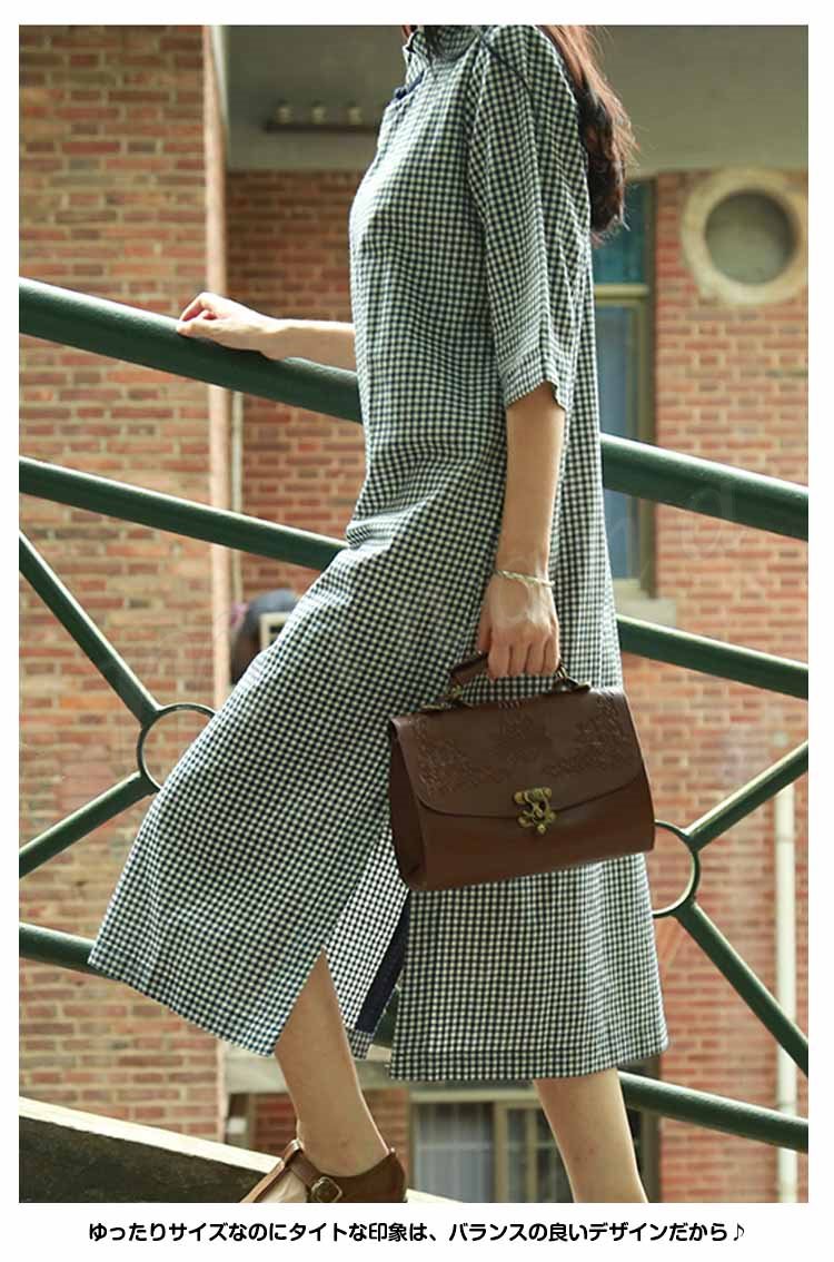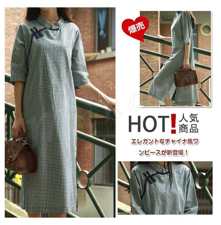 春ワンピースチャイナ風ワンピース7分袖ワンピースリネンワンピースマキシ丈ワンピースチェック柄レディース総柄
