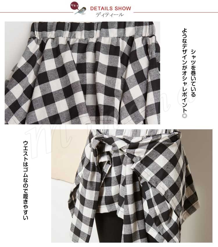 | お洒落なチェック柄シャツ腰巻き風! 履くだけで、トレンド感抜群◎スカート付きレギンス。 シャツをまるで腰に巻いているようなデザインです。 ウエストはゴムなので履きやすく、伸縮性がよい素材なので、締め付け感なし! スカート部分にボリュームがあるのでヒップカバー対策にも優れていますよ。 穿くだけでカジュアルコーデがメイクできるお手軽&心強いアイテム間違いなし。 | |