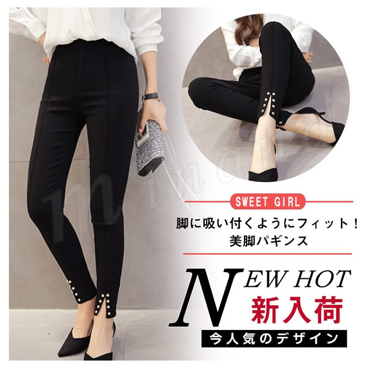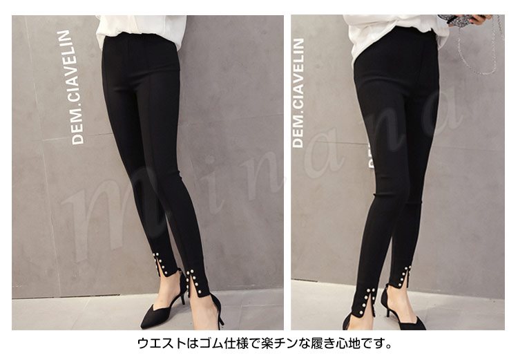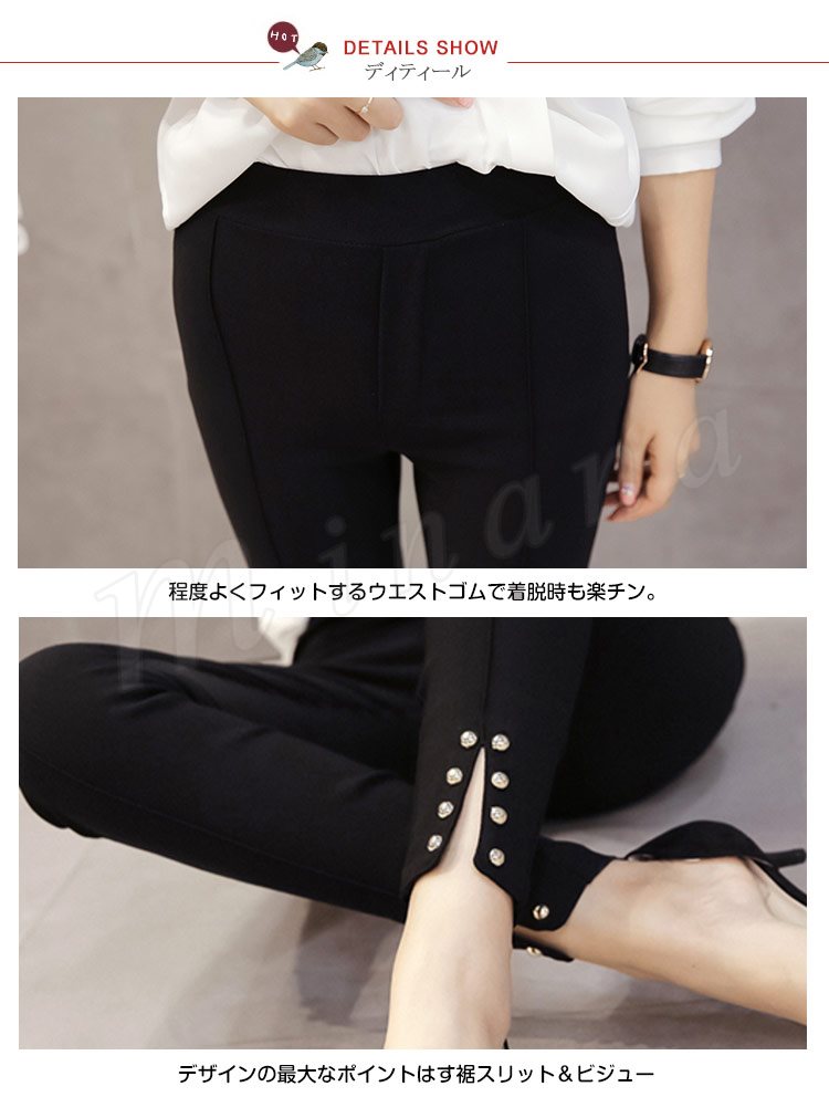 裾ビジュー付きスリット入りスキニーパンツ スキニー ロングパンツ レディース スキニーパンツ レギパン レギンス ストレッチ スリット レディ