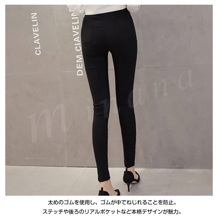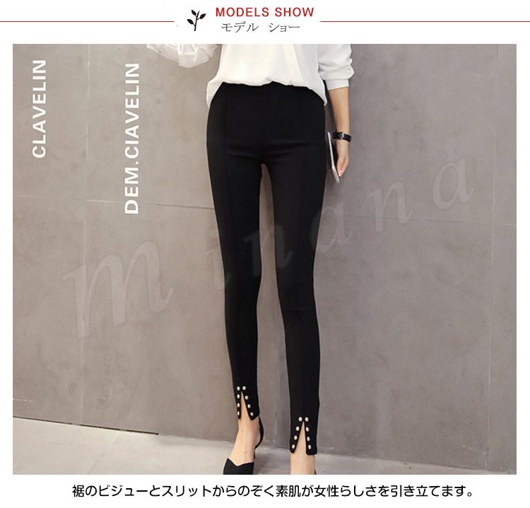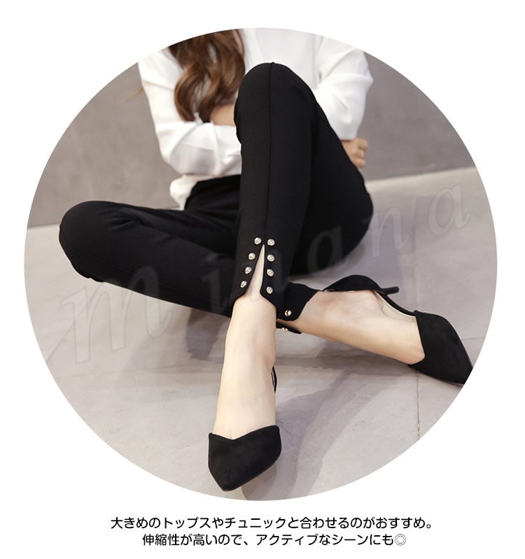| 脚に吸い付くようにフィット!美脚パギンス 裾のビジューとスリットからのぞく素肌が女性らしさを引き立てます。 ウエストはゴム仕様で楽チンな履き心地です。 太めのゴムを使用し、ゴムが中でねじれることを防止。 ステッチや後ろのリアルポケットなど本格デザインが魅力。 大きめのトップスやチュニックと合わせるのがおすすめ。伸縮性が高いので、アクティブなシーンにも◎ | |