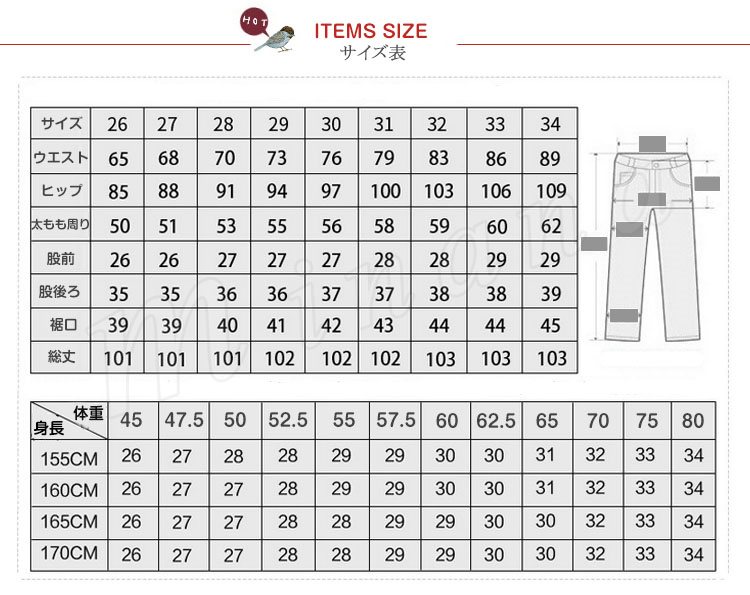 26 ウェスト65 ヒップ85 太もも周り50 着丈10127 ウェスト68 ヒップ88 太もも周り51 着丈101